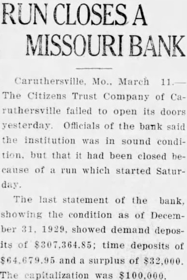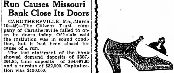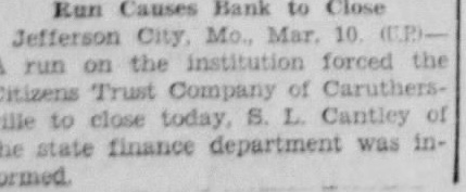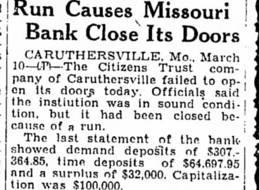 The First National Bank of Caruthersville closed its doors Tuesday afternoon after a 10-day run on the bank had depleted its cash reserve and deposits of $100,000. The bank was reorganized about 10 years ago as a national bank. Its capital stock was $50,000, the surplus $25,000 and it had undivided profits on Sept. 24 amounting to $19, 000. The failure of banks in Arkansas, Tennessee and Kentucky and several in Southeast Missouri is thought to have caused the slow run. Before then the bank had cash on hand amounting to $117,551, $80,000 in bonds and securities and deposits of $508,672.20 with no bills payable. Deposits had dwindled to about $380, 000 when the bank closed its doors. The Citizens Trust Co., closed March 8 and is being liquidated now. The Bank of Caruthersville is the only bank left there, and is one of the strongest and largest financial institutions in Southeast Missouri.