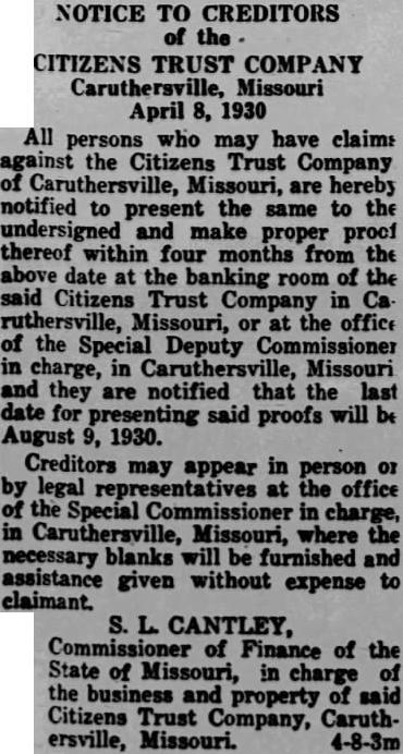 All persons who may have claims against the Citizens Trust Company of Caruthersville, Missouri, are hereby notified to present the same to the undersigned and make proper procf thereof within four months from the above date at the banking room of the said Citizens Trust Company in Ca ruthersville, Missouri, or at the office of the Special Deputy Commissioner in charge, in Caruthersville, Missouri and they are notified that the last date for presenting said proofs will be August 9, 1930. Creditors may appear in person or by legal representatives at the office of the Special Commissioner in charge, in Caruthersville, Missouri, where the necessary blanks will be furnished and assistance given without expense to claimant.