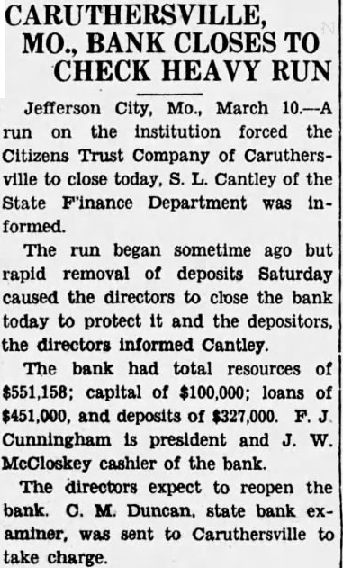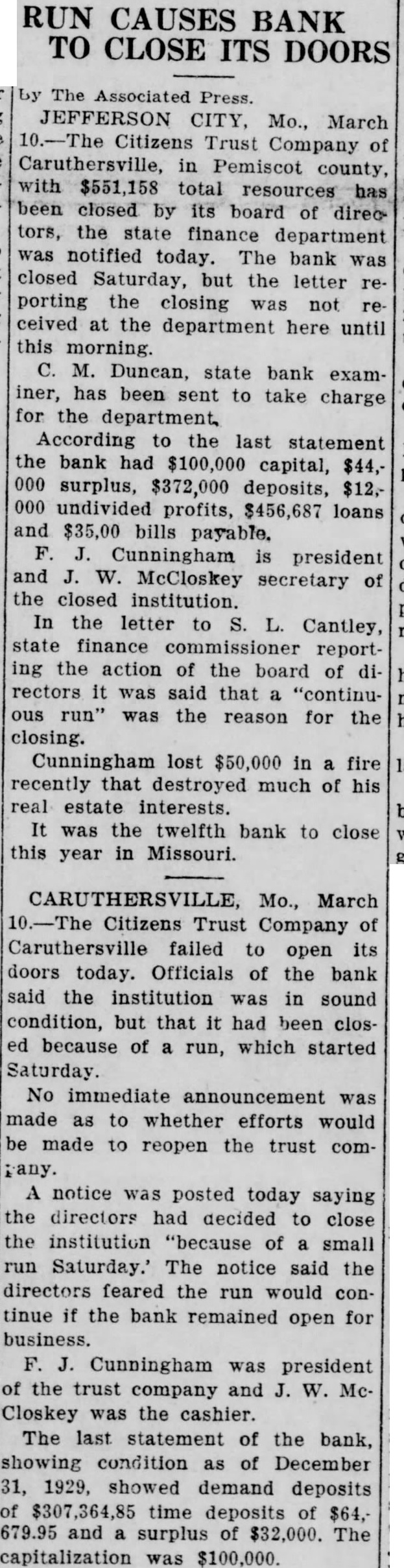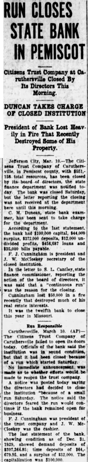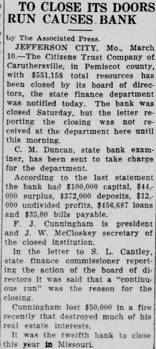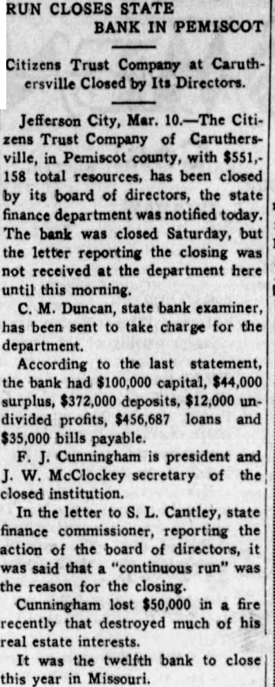 Jefferson City, Mar. 10.-The Citizens Trust Company of Caruthersville, in Pemiscot county, with $551,158 total resources, has been closed by its board of directors, the state finance department was notified today. The bank was closed Saturday, but the letter reporting the closing was not received at the department here until this morning. C. M. Duncan, state bank examiner, has been sent to take charge for the department. According to the last statement, the bank had $100,000 capital, $44,000 surplus, $372,000 deposits, $12,000 undivided profits, $456,687 loans and $35,000 bills payable. F. J. Cunningham is president and J. W. McClockey secretary of the closed institution. In the letter to S. L. Cantley, state finance commissioner, reporting the action of the board of directors, it was said that a "continuous run" was the reason for the closing. Cunningham lost $50,000 in a fire recently that destroyed much of his real estate interests. It was the twelfth bank to close this year in Missouri.
