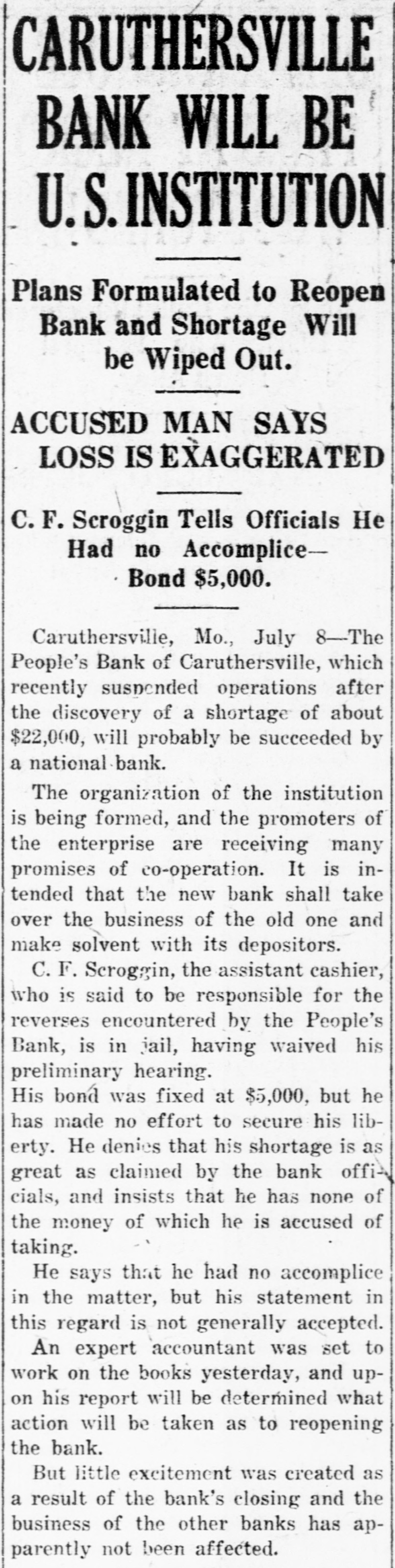 CARUTHERSVILLE BANK WILL BE U.S.INSTITUTION Plans Formulated to Reopen Bank and Shortage Will be Wiped Out. ACCUSED MAN SAYS LOSS IS EXAGGERATED C.F. Scroggin Tells Officials He Had no AccompliceBond $5,000. Caruthersville, Mo., July 8-The People's Bank of Caruthersville, which recently suspended operations after the discovery of a shortage of about $22,000, will probably be succeeded by a national bank. The organization of the institution is being formed, and the promoters of the enterprise are receiving many promises of co-operation. It is intended that the new bank shall take over the business of the old one and make solvent with its depositors. C.F. Scroggin, the assistant cashier, who is said to be responsible for the reverses encountered by the People's Bank, is in jail, having waived his preliminary hearing. His bond was fixed at $5,000, but he has made no effort to secure his liberty. He denies that his shortage is as great as claimed by the bank officials, and insists that he has none of the money of which he is accused of taking. He says that he had no accomplice in the matter, but his statement in this regard is not generally accepted. An expert accountant was set to work on the books yesterday, and upon his report will be determined what action will be taken as to reopening the bank. But little excitement was created as a result of the bank's closing and the business of the other banks has apparently not been affected.