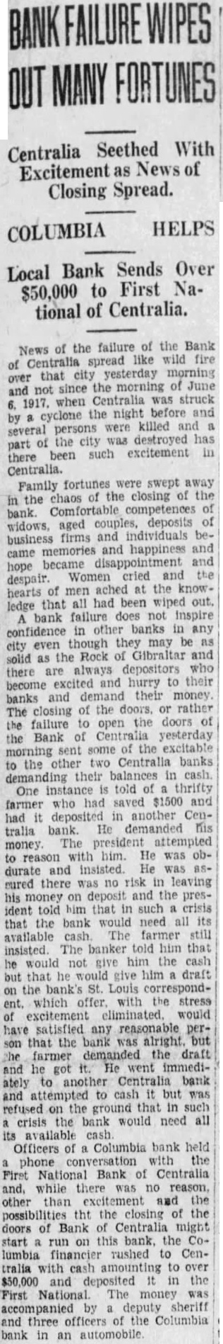 Seethed With Centralia Closing Spread. COLUMBIA HELPS Bank Sends Over Local to First Na$50,000 of Centralia. tional failure of the Bank News the spread like wild fire Centralia city yesterday the morning of June not since when Centralia struck night before cyclone were killed several persons destroyed has the such excitement there Centralia. fortunes were swept away Family of the closing the the chaos Comfortable competences aged couples, deposits widows, firms and individuals bebusiness memories and happiness and became Women and the despair. hearts men the knowthat all had been wiped out. ledge bank failure not other in any confidence in though may city Rock Gibraltar the always depositors there are and hurry to their become their money banks the rather The closing failure the doors the Bank Centralia yesterday the excitable banks the their balances One told of thrifty had saved $1500 and farmer deposited in another Cenbank. demanded tralia The president attempted money with He was reason He durate sured there was risk in leaving money deposit and the president told him that such crisis that the bank would need all its available farmer still insisted. The banker told him that would not give him the that give him draft the Louis correspondwhich offer. with excitement would satisfied any reasonable farmer demanded the draft and went bank and cash was refused the that in such on crisis the would need all Officers Columbia bank held phone National Bank Centralia there reason, excitement possibilities tht the closing the of Centralia might this bank. the lumbia rushed Cenwith to over $50,000 and deposited in the First The money accompanied deputy sheriff and three officers of the Columbia bank in an automobile