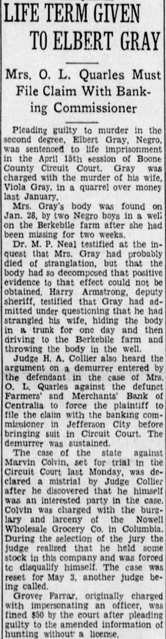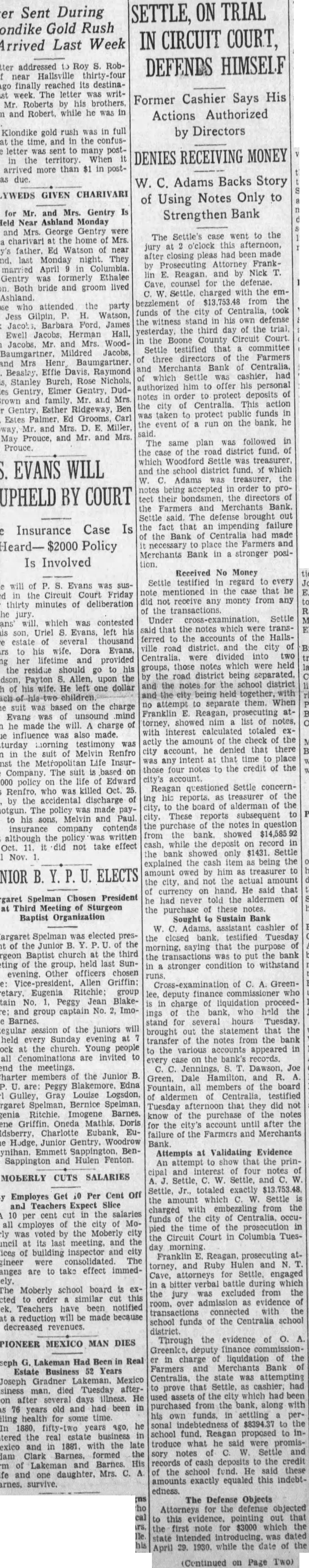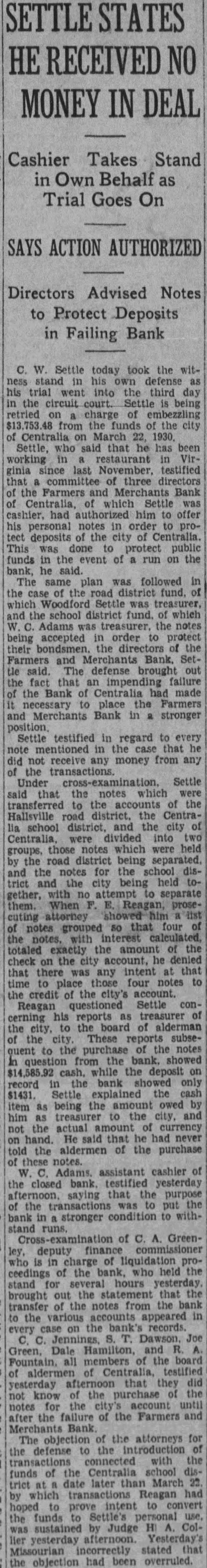 Received No Money Settle testified regard every in the that he receive money from any not the transactions Settle Under the notes which transthe of the Hallsferred and the city were divided into two notes which were held groups, road district being the for the school district the held together, separate them. Franklin atlist of interest totaled exthe the the he denied there any intent that to place notes to the credit of the four Settle concernof the his reports. the board of alderman the city. These the purchase notes question showed while the record Settle only the being the amount by him city the hand. He said that he had the Sought Sustain cashier of closed testified Tuesday saying that the the the bank condition to withstand stronger Greenlee. deputy charge liquidation proceedthe held the ings stand for Tuesday brought the that the transfer the notes from the the appeared the bank's records. Dawson, Joe Green, Hamilton, the board Fountain, aldermen of testified Tuesday that did not purchase of the for the account after the the Farmers and Merchants Attempts at Validating Evidence An the notes Settle Settle, and Settle, totaled exactly Settle the embezzling the charged funds the the the prosecution the Circuit Court in Columbia Tuesmorning Franklin Reagan, prosecuting and attorneys Settle, engaged battle during which excluded from the jury evidence transactions connected school funds of the Centralia school district. Through the evidence of finance in charge liquidation of the Farmers Bank Centralia, the state was attempting that Settle, cashier, prove used assets which from the bank, along with funds, settling $8394.37 the school fund. Reagan introduce what he said were promisSettle sory records deposits the credit school fund. these amounts exactly equaled this indebtedness.