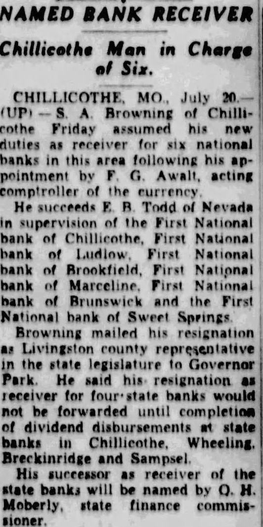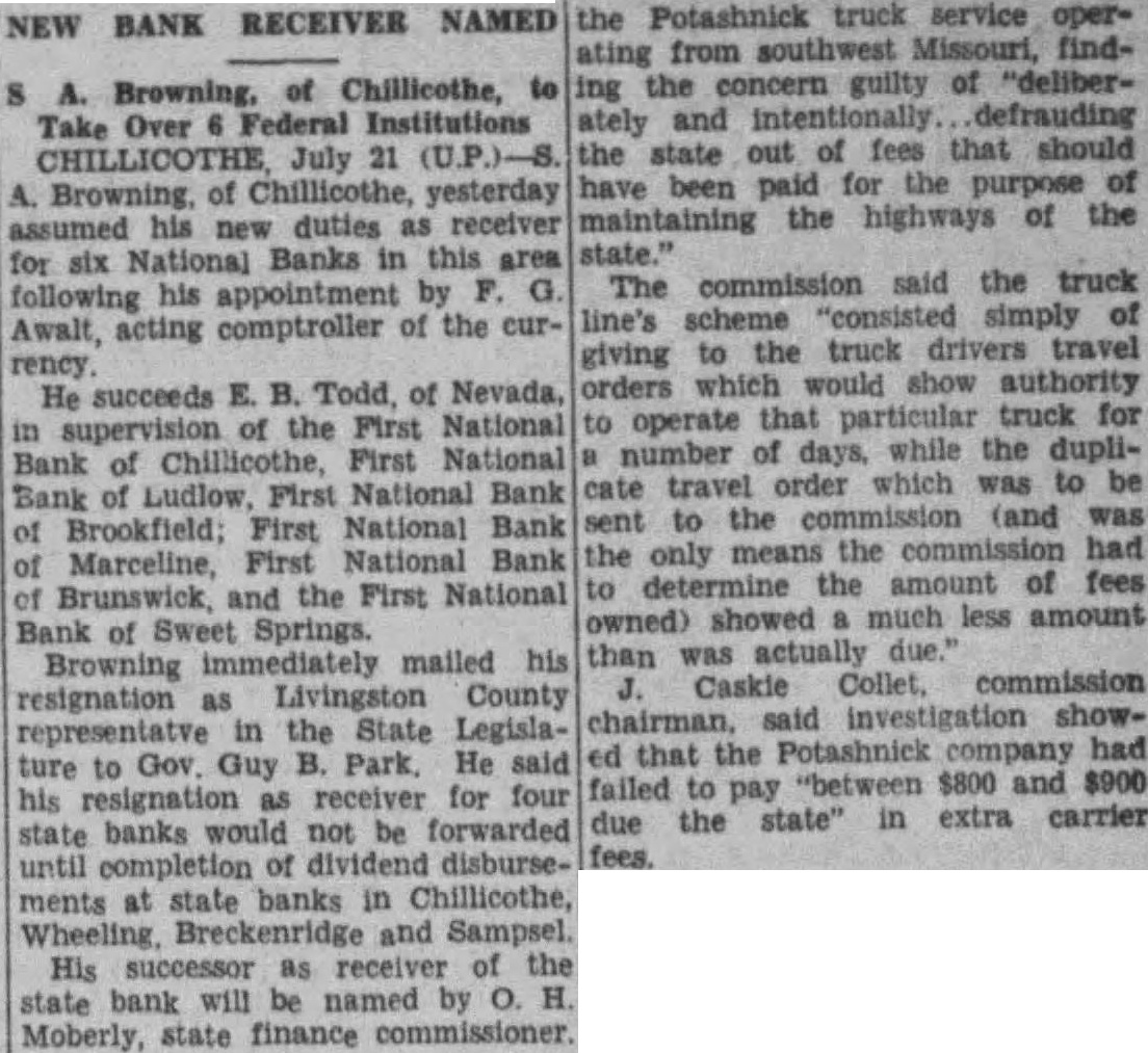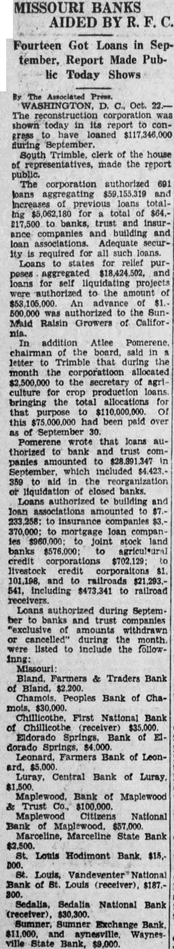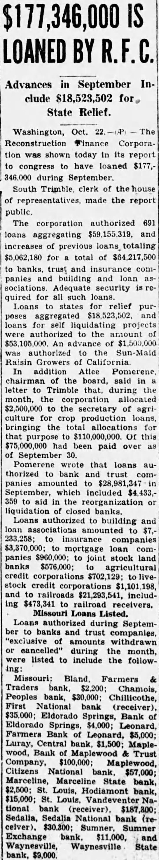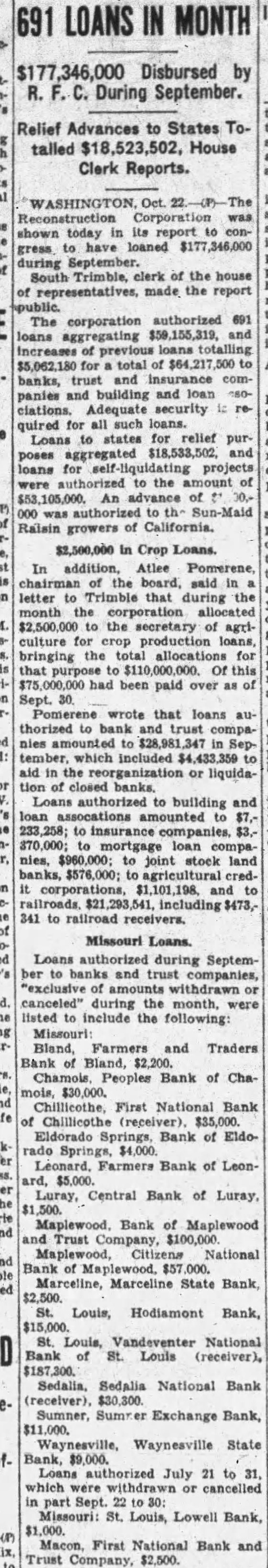 By Associated Press. WASHINGTON, October 22. The monthly report of the Reconstruction Corporation to Congress today showed advances authorized in September amounting to $137,346,000 and outstanding loans of nearly $1,000,000,000. Made public today by South Trimble, clerk of the House of Representatives, the report revealed marked decline in applications for loans by financial institutions as compared with the 1151 received in August. In September, there were 700 such applications. Less repayments exceeding $100,000,000, loans outstanding to financial institutions and railroads wre listed at $995,406,493 on September 30, with $289,580,373 in authorized advances to the same class of borrowers yet to called for Crop Relief In the statement of the corporation's condition on September 30, recorded that of the $110,000,000 granted the Secretary of Agriculture for crop production loans, $35,000,000 remained in addition, total of $125,900,587 in loans authorized for relief purposes and self-liquidating projects had not been called upon by October 1. During September, the report said, $64,217,500 in loans was authorized to financial institutions, compared with $122,277,641 in August. New loans numbering 691 totaling $59,155,319 were authorized in September and the remainder were increases in previous loans. Of the total, $28,981,374 was advanced to banks and $21,293,541 to railroads. In August total 1110 new loans was authorized. Of the applications for loans to states and cities for relief purposes, the corporation authorized twenty-seven to twenty-three states and territories in September, amounting to $18,523,502. It granted three of sixty-six loan applications for self-liquidating projects aggregating $53,105,000, and authorized $1,500,000 loan to the Sun-Maid Raisin Growers' of California. Aid Loans at 3 Per Cent. The relief loans are at per cent interest; bank loans at 5 and 5½, and railroads and per cent. Among the larger loans authorlized in September were, to the Metropolitan Water District of Southern California, $40,000,000; the New Orleans Belt Railroad bridge in Louisiana, $13,000,000; Railway Company, New York, Chicago and St. Louis, $6,800,000; Denver and Rio Grande Western Railroad Company, $3,850,000; the Pennsylvania Railroad Company, $2,000,000; Union Guardian Trust Company of Detroit, $2,767,000; State of Illinois, $5,000,000; Pennsylvania, $2,500,000; Ohio, a total of $2,807,000, and Louisiana, $1,008,844. Chairman Atlee Pomerene of the board said, in letter accompanying the report, that the board had in debentures to the Treasury in September, making total of $600,000,000 sold, which, with the $500,000,000 capital set up by Congress, brings the aggregate amount procured from the Treasury since its organization to $1,100,000,000. Actual cash disbursements in September, report said, amounted to $73,592,596. cash balance of $31,545,053 on hand October Chairman Pomerene also reported that number of authorized loans had been by prospective borrowers or withdrawn in full or in part, aggregating more than $2,000,000. Loans in Missouri. Loans authorized during September to banks and trust companies, "exclusive of amounts withdrawn or cancelled" during the month, were listed to include the following: Missouri Bland, Farmers and Traders' Bank of $2200. Chamois, Peoples' Bank of Chamois, $30,000. Chillicothe, First National Bank of Chillicothe (receiver), $35,000. Eldorado Springs, Bank of Eldorado Springs, $4000. Leonard, Farmers' Bank of Leonard, $5000. Luray, Central Bank of Luray, $1500. Maplewood, Bank of Maplewood and Trust $100,000. Citizens' National Bank of Maplewood, $57,000. Marceline, Marceline State Bank, $2500. St. Louis, Hodiamont Bank, $15,000. St. Louis, Vandeventer National Bank of St. Louis (receiver), $187,300. Sedalia, Sedalia National Bank (receiver), $30,300. Sumner, Sumner Exchange Bank, $11,000. Waynesville, Waynesville State Bank, $9000. Loans authorized July 21 to 31. which withdrawn cancelled in part September 22 to 30: Missouri-St Louis, Lowell Bank $1000 and Macon. First National Bank and Trust Company, $2500.