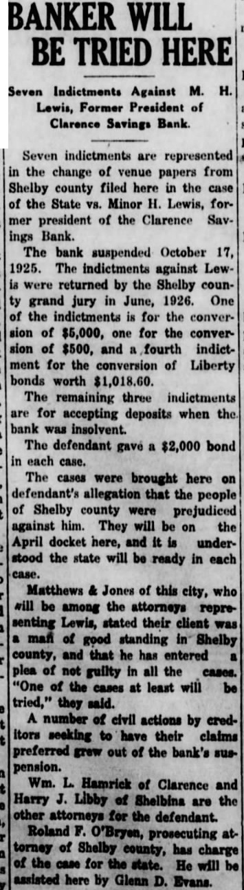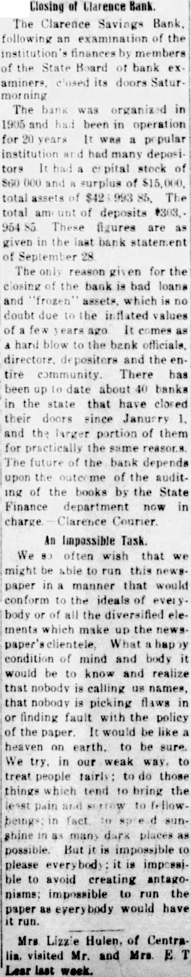 Closing of Clarence Bank. The Clarence Savings Bank, following an examination of the institution's finances by members of the State Board of bank examiners, closed its doors Saturmorning The bank was organized in 1905 and had been in operation for 20 years It was a popular institution had many depositors It had a espital stock of $60 000 and A surplus of $15,000, total assets of The total am unt of deposits 954 These figures are as The only reason given for the closing of the bank is bad loans and "frozen" assets, which is no doubt due to the inflated values of a few years ago It comes as & hard blow to the bank officials, directore. de positers and the entire community. There has been up to date about 40 banks be in the state that have closed their doors since Janurry and the larger portion of them for practically the same reasons The future of the bank depends upon the outcome of the auditing of the books by the State Finance department now in charge Clarence Courier. An Impossible Task We 80 often wish that we might be able to run this news. paper in a manner that would conform to the ideals of every. body or of all the diversified elements which make up the newsclientele, What a hap y condition of mind and body it would be to know and realize that nobody is calling us names, that nobody is picking flaws in or finding fault with the policy of the paper. It would be like a heaven on earth. to be sure. We try. in our weak way, to treat people tairly: to do those things which tend to bring the least pain and surrow to fellowbeings: in fact to spie sunshine in as many dark places as possible. But it is impossible to please everybody it is impossible to avoid creating antagonisms: impossible to run the paper as everybody would have it run. Mrs Lizzie Hulen, of Centralia. visited Mr. and Mrs E T Lear last week.