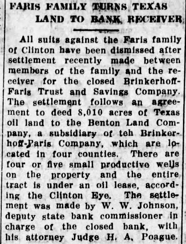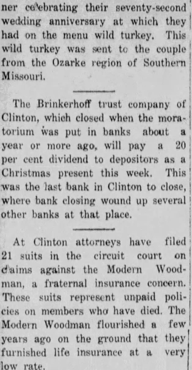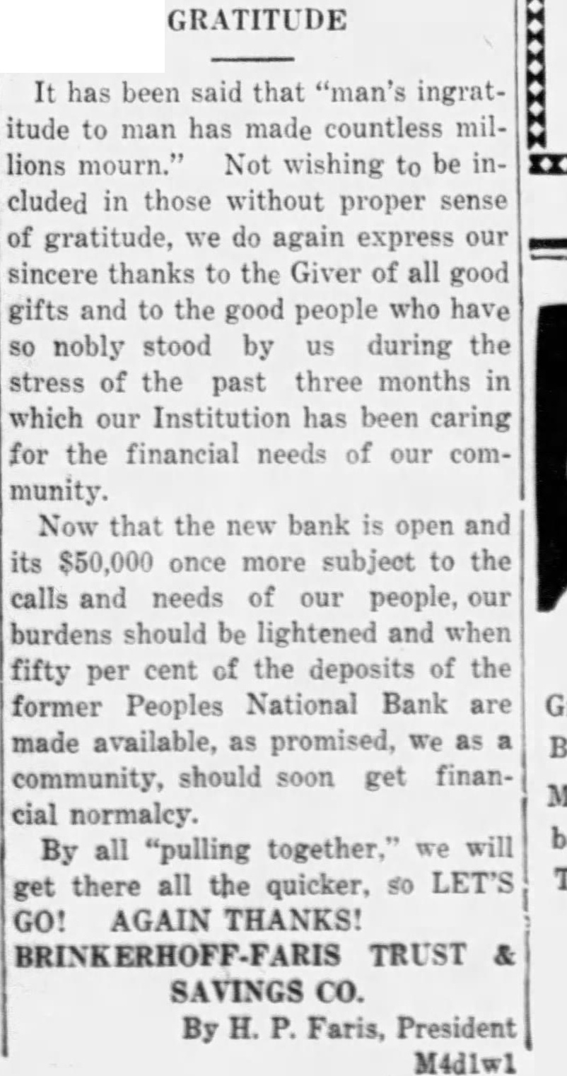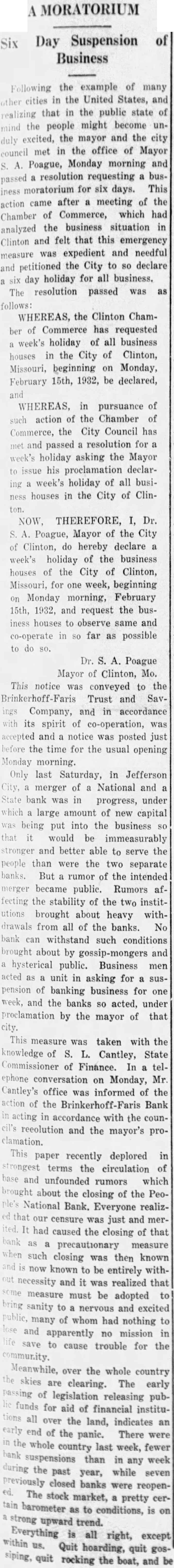 MORATORIUM A Day Suspension of Six Business Following the example of many cities in the United States, and realizing that in the public state of mind the people might become unduly excited, the mayor and the city council met in the office of Mayor Poague, Monday morning and passed resolution requesting a business moratorium for six days. This action came after a meeting of the Chamber of Commerce, which had analyzed the business situation in Clinton and felt that this emergency measure was expedient and needful and petitioned the City to SO declare day holiday for all business. The resolution passed was as follows: WHEREAS, the Clinton Chamber of Commerce has requested week's holiday of all business houses in the City of Clinton, Missouri, beginning on Monday, February 15th, 1932, be declared, and WHEREAS, in pursuance of such action of the Chamber of Commerce, the City Council has met and passed resolution for a week's holiday asking the Mayor to issue his proclamation declaring week's holiday of all business houses in the City of Clin- ton. NOW, THEREFORE, I, Dr. Poague, Mayor of the City of Clinton, do hereby declare a week's holiday of the business houses of the City of Clinton, Missouri, for one week, beginning on Monday morning, February 15th, 1932, and request the business houses to observe same and co-operate in so far as possible to do Dr. Poague Mayor of Clinton, Mo. This notice was conveyed to the Brinkerhoff-Faris Trust and Savings Company, and accordance with its spirit of co-operation, was accepted and notice was posted just before the time for the usual opening Monday morning. Only last Saturday, in Jefferson City, merger of a National and State bank was in progress, under which large amount of new capital being put into the business SO that would be immeasurably stronger and better able to serve the people than were the two separate banks. But a rumor of the intended merger became public. Rumors affecting the stability of the two institutions brought about heavy withdrawals from all of the banks. No bank can withstand such conditions brought about by gossip-mongers and hysterical public. Business men acted as unit in asking for a suspension of banking business for one week, and the banks so acted, under proclamation by the mayor of that city. This measure was taken with the knowledge of S. L. Cantley, State Commissioner of Finance. In a telephone conversation on Monday, Mr. Cantley's office was informed of the action of the Brinkerhoff-Faris Bank acting in accordance with the council's reeolution and the mayor's proclamation. This paper recently deplored in strongest terms the circulation of base and unfounded rumors which brought about the closing of the PeoNational Bank. Everyone realizthat our censure was just and merhad caused the closing of that bank a precautionary measure such closing was then known and is now known to be entirely withnecessity and it was realized that measure must be adopted to bring sanity to a nervous and excited many of whom had nothing to and apparently no mission in save to cause trouble for the community. Meanwhile, over the whole country skies are clearing. The early passing of legislation releasing pubfunds for aid of financial institutions all over the land, indicates an early end of the panic. There were bank the whole country last week, fewer suspensions than in week any during the past year, while seven previously closed banks were reopenThe stock market, a pretty certain barometer as to conditions, is on strong upward trend. Everything is all right, except us. Quit hoarding, quit siping, quit rocking the boat, and be