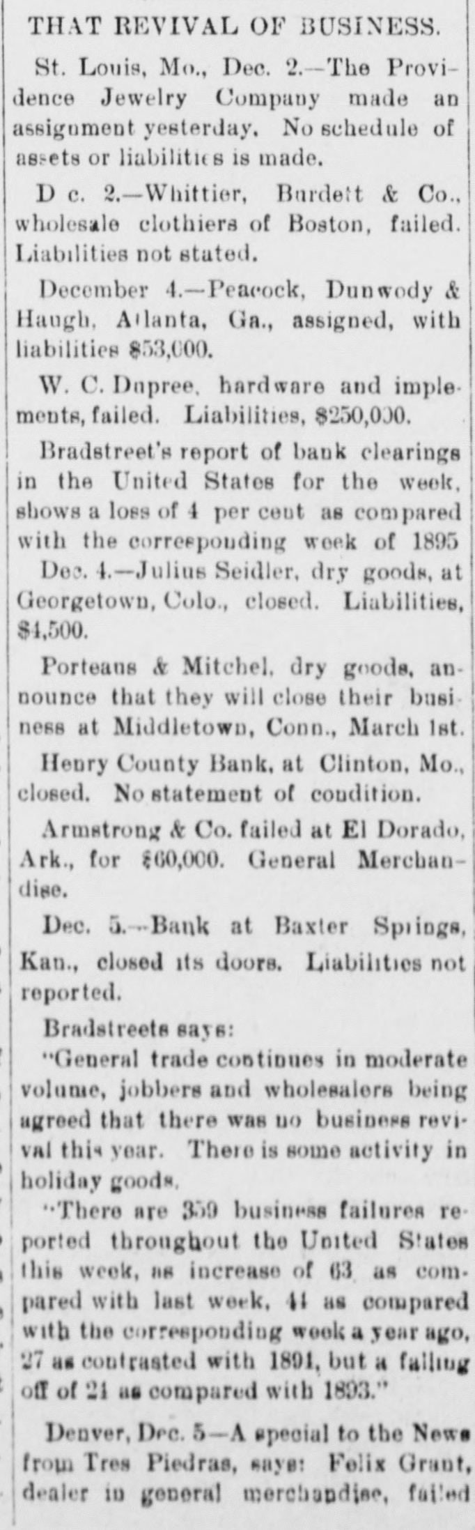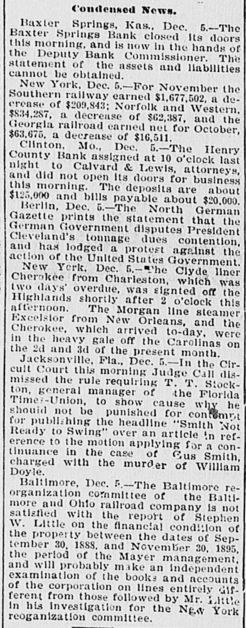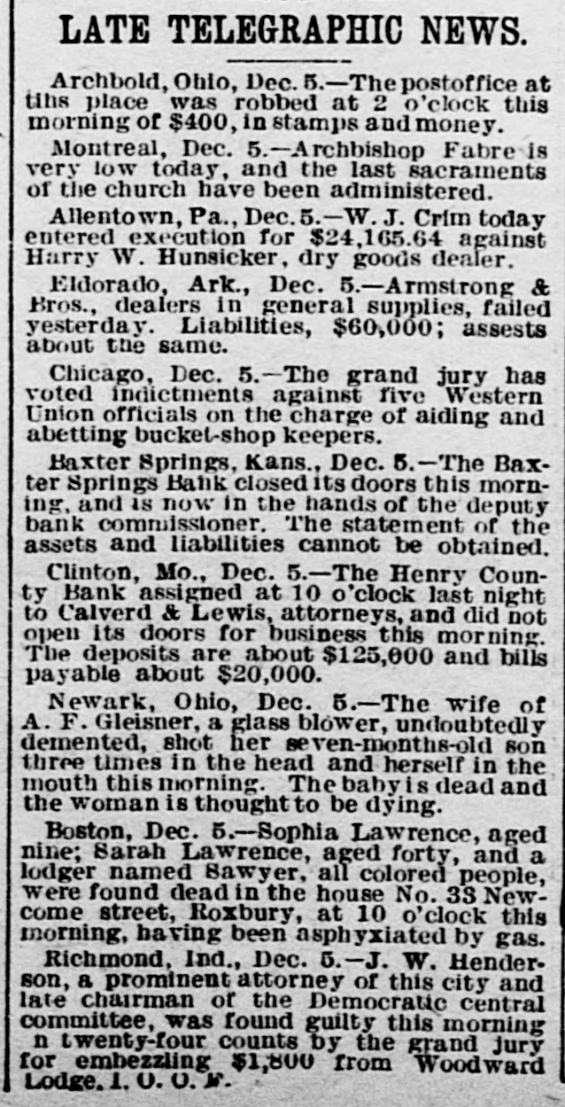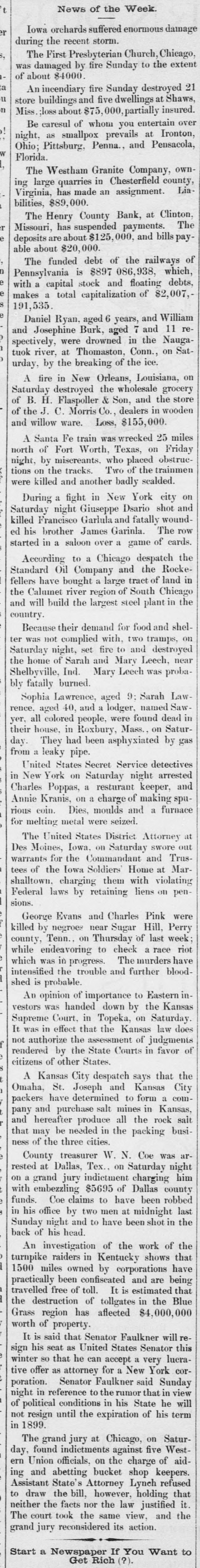 News of the Week. Iowa orchards suffered enormous damage during the recent storm. The First Presbyterian Church, Chicago, was damaged by fire Sunday to the extent of about $4000. An incendiary fire Sunday destroyed 21 11 store buildings and five dwellings at Shaws, Miss. ;loss about $75, partially insured. Be caresul of whom you entertain over night, as smallpox prevails at Ironton, Ohio; Pittsburg, Penna., and Pensacola, Florida. The Westham Granite Company, owning large quarries in Chesterfield county, Virginia, has made an assignment. Liabilities, $89,000. The Henry County Bank, at Clinton, Missouri, has suspended payments. The deposits are about $125, 000, and bills payable about $20,000. The funded debt of the railways of Pennsylvania is $897 086,938, which, with a capital stock and floating debts. makes a total capitalization of $2,007,191,535. Daniel Ryan, aged 6 years, and William and Josephine Burk, aged 7 and 11 respectively, were drowned in the Naugatuok river, at Thomaston, Conn., on Saturday, by the breaking of the ice. A fire in New Orleans, Louisiana, on Saturday destroyed the wholesale grocery of B. H. Flaspoller & Son, and the store of the J. C. Morris Co., dealers in wooden and willow ware. Loss, $155,000. A Santa Fe train was wrecked 25 miles north of Fort Worth, Texas, on Friday night, by miscreants. who placed obstruetions on the tracks. Two of the trainmen were killed and another badly scalded. During a fight in New York city on Saturday night Giuseppe Dsario shot and killed Francisco Garlula and fatally wounded his brother James Garinla. The row started in a saloon over a game of cards. According to a Chicago despatch the Standard Oil Company and the Rockefellers have bought a large tract of land in the Calumet river region of South Chicago and will build the largest steel plant in the country. Because their demand for food and shelter was not complied with, two tramps, on Saturday night, set fire to and destroyed the home of Sarah and Mary Leech, near Shelbyville, Ind. Mary Leech was probably fatally burned. Sophia Lawrence, aged 9: Sarah Lawrence. aged 40, and a lodger, named Sawyer, all colored people, were found dead in their house, in Roxbury, Mass., on Saturday. They had been asphyxiated by gas from a leaky pipe. United States Secret Service detectives in New York on Saturday night arrested Charles Poppas, a resturant keeper, and Annie Kranis, on a charge of making spurious coin. Dies, moulds and a furnace for melting metal were seized. The United States District Attorney at Des Moines, Iowa. on Saturday swore out warrants for the Commandant and Trustees of the Iowa Soldiers' Home at Marshalltown. charging them with violating Federal laws by retaining liens on pensions. George Evans and Charles Pink were killed by negroes near Sugar Hill, Perry county, Tenn., on Thursday of last week; while endeavoring to check a race riot which was in progress. The murders have intensified the trouble and further bloodshed is probable. An opinion of importance to Eastern investors was handed down by the Kansas Supreme Court. in Topeka, on Saturday. It was in effect that the Kansas law does not authorize the assessment of judgments rendered by the State Courts in favor of citizens of other States. A Kansas City despatch says that the Omaha, St. Joseph and Kansas City packers have determined to form a company and purchase salt mines in Kansas, and hereafter produce all the rock salt that may be needed in the packing business of the three cities. County treasurer W. N. Coe was arrested at Dallas, Tex., on Saturday night on a grand jury indictment charging him with embezzling $5695 of Dallas county funds. Coe claims to have been robbed in his office by two men at midnight last Sunday night and to have been shot in the back of his head. An investigation of the work of the turnpike raiders in Kentucky shows that 1500 miles owned by corporations have practically been confiscated and are being travelled free of toll. It is estimated that the destruction of tollgates in the Blue Grass region has aflected $4,000,000 worth of property. It is said that Senator Faulkner will resign his seat as United States Senator this winter 80 that he can accept a very lucrative offer as attorney for a New York corporation. Senator Faulkner said Sunday night in reference to the rumor that in view of political conditions in his State he will not resign until the expiration of his term