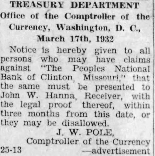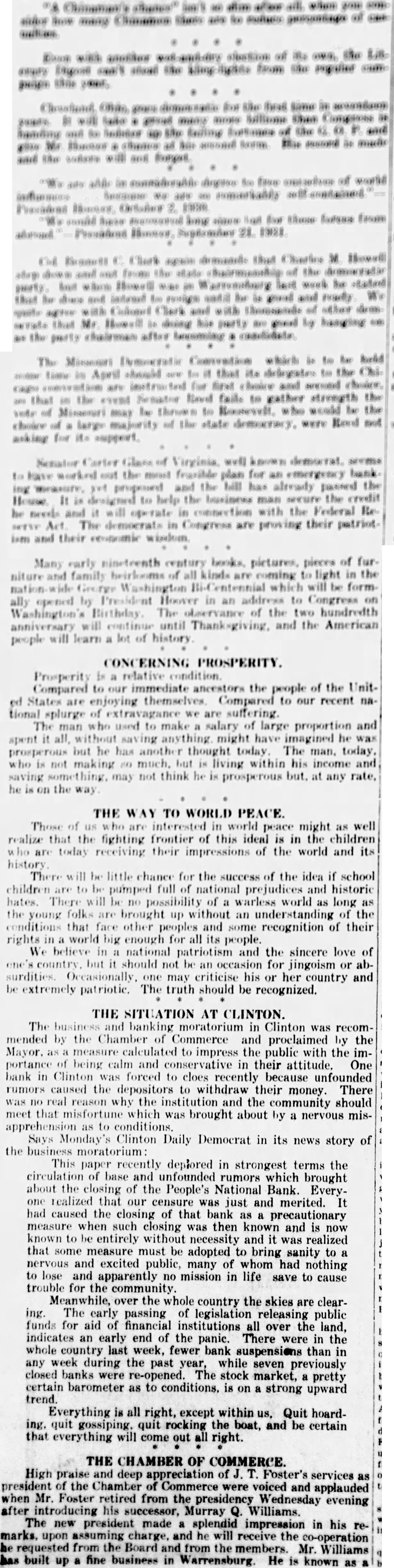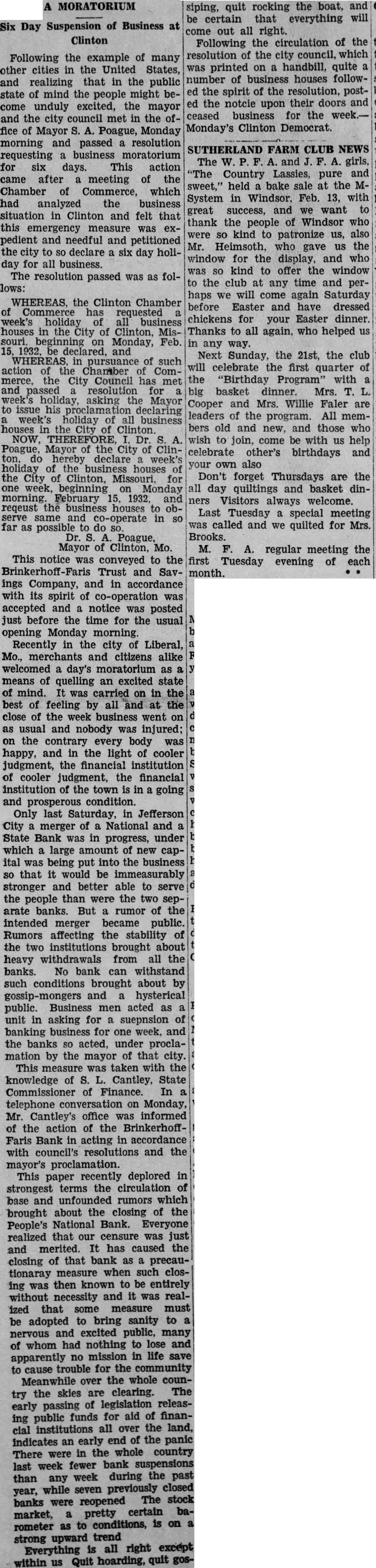 A MORATORIUM Six Day Suspension of Business at Clinton Following the example of many other cities in the United States, and realizing that in the public state of mind the people might become unduly excited, the mayor and the city council met in the fice of Mayor A. Poague, Monday morning and passed resolution requesting business moratorium for six days. This action came after meeting of the Chamber of Commerce, which had analyzed the business situation in Clinton and felt that this emergency measure was expedient and needful and petitioned to declare six day holiday for all business. The resolution passed was as follows: WHEREAS. the Clinton Chamber of Commerce has requested week's holiday of business houses in the City of Clinton, souri. beginning Monday, Feb. in 15, 1932. and WHEREAS. in pursuance of such action of the Chamber of Commerce, the City Council has met and passed resolution for week's holiday, asking the Mayor to issue his declaring week's holiday of all business houses the City of NOW, Dr. Poague, Mayor of the City of Clindo hereby declare week's holiday of the houses of the City of Clinton, Missouri, for week. beginning on Monday morning. February 1932. and reqeust business houses to observe same and co-operate in SO far as possible to do so. Poague, Mayor of Clinton, Mo. This notice was conveyed to the Trust and Savings Company, and in accordance with its spirit of co-operation was accepted and notice was posted just before the time for the usual opening Monday morning. Recently in the city of Liberal, Mo., merchants and citizens alike welcomed day's moratorium as means of quelling an excited state of mind. It was carried on in the best of feeling by all and at the close of the week business went on as usual and nobody was injured; on the contrary every body was happy, and in the light of cooler judgment, the financial institution of cooler judgment, the financial institution of the town is in a going and prosperous condition. Only last Saturday, in Jefferson City of a National and merger State Bank was in progress, under which a large amount of new capital was being put into the business that it would be immeasurably stronger and better able to serve the people than were the two separate banks. But rumor of the intended became public. merger Rumors affecting the stability of the two institutions brought about heavy withdrawals from all the banks. No bank can withstand such conditions brought about by gossip-mongers and a hysterical public. Business men acted as unit in asking for a suepnsion banking business for one week, and the banks SO acted, under proclamation by the mayor of that city. This measure was taken with the knowledge of S. L. Cantley, State Commissioner of Finance. In telephone conversation on Monday, Mr. Cantley's office was informed of the action of the BrinkerhoffFaris Bank in acting in accordance with council's resolutions and the mayor's proclamation. This paper recently deplored in strongest terms the circulation of base and unfounded rumors which about the closing of the brought People's National Bank. Everyone realized that our censure was just and merited. It has caused the closing of that bank as precautionaray measure when such then known to be entirely ing was without necessity and it was ized that some measure must be adopted to bring sanity to nervous and excited public, many of whom had nothing to lose and apparently no mission in life save to trouble for the community cause Meanwhile over the whole counskies are clearing. The try the of legislation releasearly passing ing public funds for aid of finanall over the land, cial institutions early end of the panic indicates an in the whole country There were week fewer bank suspensions last during the past than week any previously closed while seven year, The stock banks were reopened certain bamarket, a pretty to conditions, is on rometer as trend strong upward all right except Everything is hoarding, quit within us Quit quit rocking the boat, and siping, be certain that everything will come out all right. the circulation of the Following resolution of the city council, which was printed on a handbill, quite number of business houses followthe spirit of the resolution, posted the notcie upon their doors and ceased business for the Monday's Clinton Democrat. SUTHERLAND FARM CLUB NEWS The and girls, "The Country Lassies, pure and sweet," held bake sale at the MSystem in Windsor. Feb. 13, with great success, and we want to thank the people of Windsor who were kind to patronize us, also Mr. Heimsoth, who gave us the window for the display, and who was so kind to offer the window to the club at any time and perhaps we will come again Saturday before Easter and have dressed chickens for your Easter dinner. Thanks to all again, who helped any way. Next Sunday, the 21st, the club will celebrate the first quarter of the "Birthday Program" with big basket dinner. Mrs. Cooper and Mrs. Willie Faler are leaders of the program. All members old and new, and those who wish to join, come be with us help celebrate other's birthdays and your own also Don't forget Thursdays are the all day quiltings and basket dinners Visitors always welcome. Last Tuesday a special meeting was called and we quilted for Mrs. Brooks. M. F. A. regular meeting the first Tuesday evening of each month.