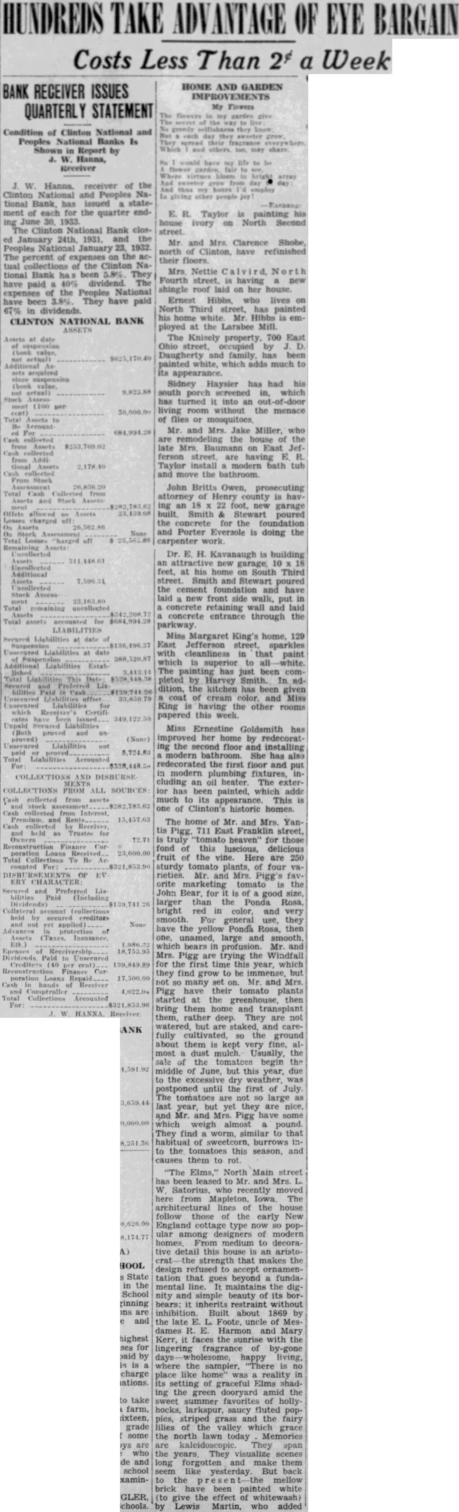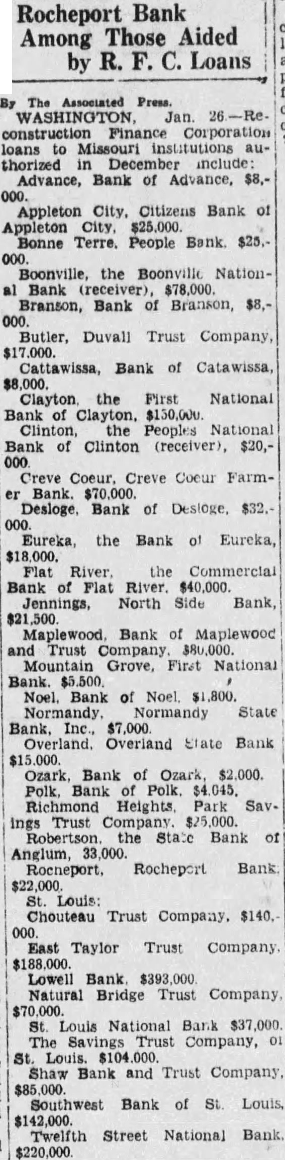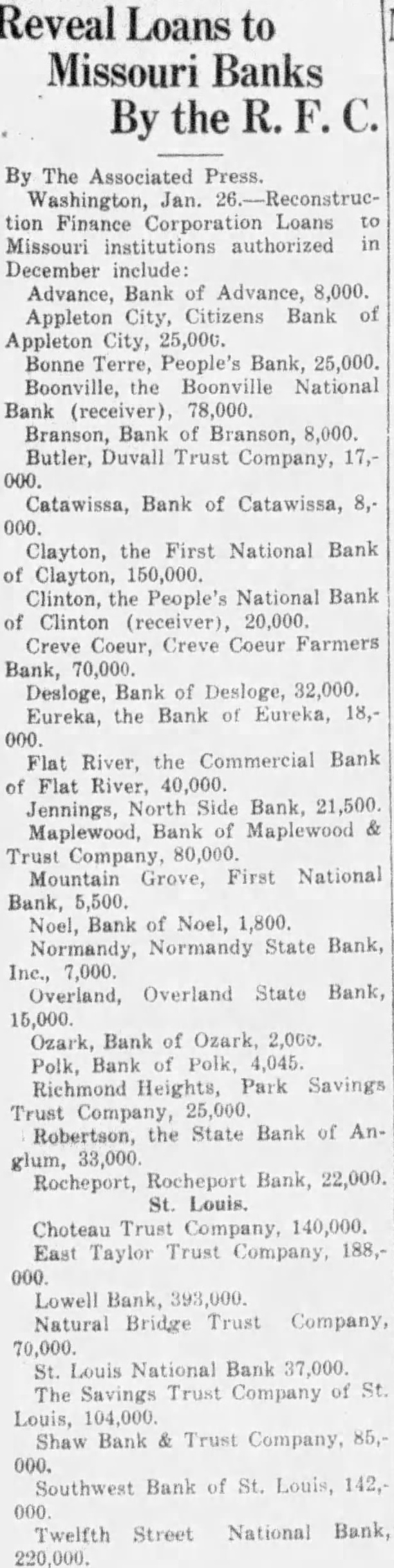 A MORATORIUM Six Day Suspension of Business at Clinton Following the example of many other cities in the United States, and realizing that in the public state of mind the people might become unduly excited, the mayor and the city council met in the fice of Mayor A. Poague, Monday morning and passed resolution requesting business moratorium for six days. This action came after meeting of the Chamber of Commerce, which had analyzed the business situation in Clinton and felt that this emergency measure was expedient and needful and petitioned to declare six day holiday for all business. The resolution passed was as follows: WHEREAS. the Clinton Chamber of Commerce has requested week's holiday of business houses in the City of Clinton, souri. beginning Monday, Feb. in 15, 1932. and WHEREAS. in pursuance of such action of the Chamber of Commerce, the City Council has met and passed resolution for week's holiday, asking the Mayor to issue his declaring week's holiday of all business houses the City of NOW, Dr. Poague, Mayor of the City of Clindo hereby declare week's holiday of the houses of the City of Clinton, Missouri, for week. beginning on Monday morning. February 1932. and reqeust business houses to observe same and co-operate in SO far as possible to do so. Poague, Mayor of Clinton, Mo. This notice was conveyed to the Trust and Savings Company, and in accordance with its spirit of co-operation was accepted and notice was posted just before the time for the usual opening Monday morning. Recently in the city of Liberal, Mo., merchants and citizens alike welcomed day's moratorium as means of quelling an excited state of mind. It was carried on in the best of feeling by all and at the close of the week business went on as usual and nobody was injured; on the contrary every body was happy, and in the light of cooler judgment, the financial institution of cooler judgment, the financial institution of the town is in a going and prosperous condition. Only last Saturday, in Jefferson City of a National and merger State Bank was in progress, under which a large amount of new capital was being put into the business that it would be immeasurably stronger and better able to serve the people than were the two separate banks. But rumor of the intended became public. merger Rumors affecting the stability of the two institutions brought about heavy withdrawals from all the banks. No bank can withstand such conditions brought about by gossip-mongers and a hysterical public. Business men acted as unit in asking for a suepnsion banking business for one week, and the banks SO acted, under proclamation by the mayor of that city. This measure was taken with the knowledge of S. L. Cantley, State Commissioner of Finance. In telephone conversation on Monday, Mr. Cantley's office was informed of the action of the BrinkerhoffFaris Bank in acting in accordance with council's resolutions and the mayor's proclamation. This paper recently deplored in strongest terms the circulation of base and unfounded rumors which about the closing of the brought People's National Bank. Everyone realized that our censure was just and merited. It has caused the closing of that bank as precautionaray measure when such then known to be entirely ing was without necessity and it was ized that some measure must be adopted to bring sanity to nervous and excited public, many of whom had nothing to lose and apparently no mission in life save to trouble for the community cause Meanwhile over the whole counskies are clearing. The try the of legislation releasearly passing ing public funds for aid of finanall over the land, cial institutions early end of the panic indicates an in the whole country There were week fewer bank suspensions last during the past than week any previously closed while seven year, The stock banks were reopened certain bamarket, a pretty to conditions, is on rometer as trend strong upward all right except Everything is hoarding, quit within us Quit quit rocking the boat, and siping, be certain that everything will come out all right. the circulation of the Following resolution of the city council, which was printed on a handbill, quite number of business houses followthe spirit of the resolution, posted the notcie upon their doors and ceased business for the Monday's Clinton Democrat. SUTHERLAND FARM CLUB NEWS The and girls, "The Country Lassies, pure and sweet," held bake sale at the MSystem in Windsor. Feb. 13, with great success, and we want to thank the people of Windsor who were kind to patronize us, also Mr. Heimsoth, who gave us the window for the display, and who was so kind to offer the window to the club at any time and perhaps we will come again Saturday before Easter and have dressed chickens for your Easter dinner. Thanks to all again, who helped any way. Next Sunday, the 21st, the club will celebrate the first quarter of the "Birthday Program" with big basket dinner. Mrs. Cooper and Mrs. Willie Faler are leaders of the program. All members old and new, and those who wish to join, come be with us help celebrate other's birthdays and your own also Don't forget Thursdays are the all day quiltings and basket dinners Visitors always welcome. Last Tuesday a special meeting was called and we quilted for Mrs. Brooks. M. F. A. regular meeting the first Tuesday evening of each month.