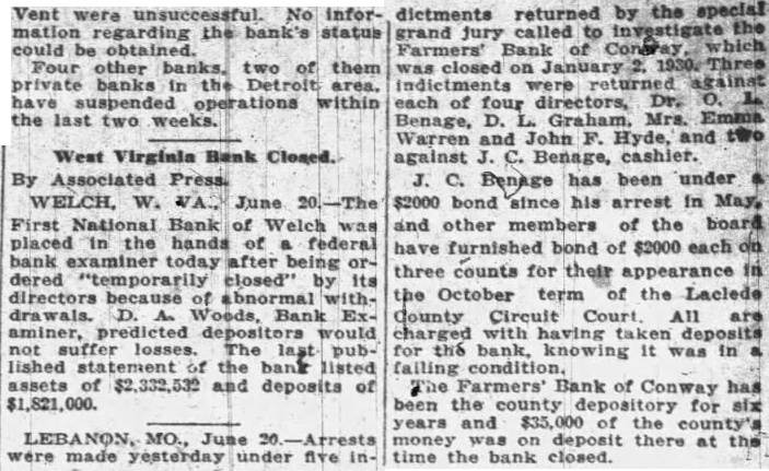 Vent unsuccessful. No infor- dictments returned by the special were mation regarding the bank's status grand jury called to investigate the could be obtained. Farmers' Bank of Contray, which Four other two of them was closed on January private banks in the Detroit area. indictments were returned against have suspended operations within each of four directors, Dr. the last two weeks. Benage, D. Graham. Mrs. Emma West Virginia Bank Closed. By Associated Press. W. June First Bank of Welch placed in the hands of federal bank examiner today after being ordered closed" by its directors because of abnormal withD. Woods, Bank Exwould not losses. The last published statement of the listed assets of $2,332,532 and deposits of $1,821,000. MO., 20. made yesterday Warren and John F. Hyde, and two against c. Benage, cashier. J. C. Benage has been under & $2000 bond since his arrest in May, and other members of the board have furnished bond of $2000 each on three counts for their appearance in the October term of the Laclede County Circuit Court All charged with having for the it was failing The Farmers' Bank of Conway has been the county depository for six and of the county's money on deposit there at the time the bank closed.