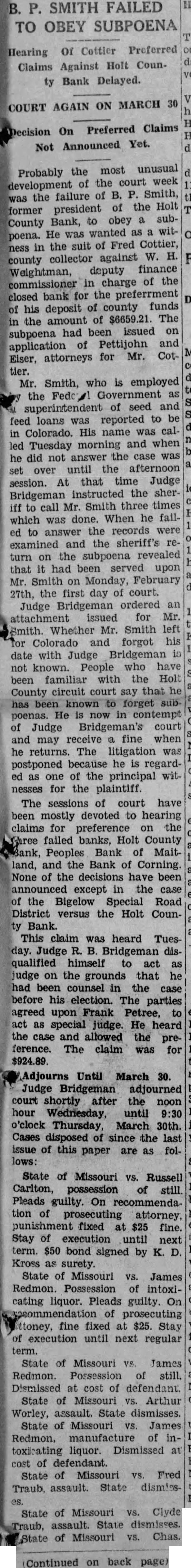 SMITH FAILED TO OBEY SUBPOENA Of Cottier Preferred Hearing Against Holt CounClaims ty Bank Delayed. AGAIN ON MARCH COURT Preferred Claims On Announced Yet. Not unusual the most Probably the court week of development of B. Smith, the failure of the Holt former president T. subBank, to obey County wanted as witHe was poena. of Fred Cottier, in the suit ness W. H. collector against county finance deputy of the commissioner charge closed bank for the preferrment of county funds his deposit the amount of $6659.21. The had been issued on subpoena of Pettijohn and application for Mr. CotEiser, attorneys tier. Mr. Smith, who is employed the Government of seed and superintendent to be feed loans was reported in Colorado. His name was calTuesday morning and when did not answer the case was he al until the afternoon set over At that time Judge session. instructed the sherBridgeman Smith three times iff to call Mr. done. When he failwhich was the records were to answer examined and the sheriff's turn on the subpoena revealed that it had been served upon Mr. Smith on Monday, February 27th, the first day of court. Judge Bridgeman ordered an attachment issued for Mr. Whether Mr. Smith left Smith. Colorado and forgot his date with Judge Bridgeman known. People who have not familiar with the Holt been circuit court that he County say been known to forget subHe now in contempt poenas. Judge Bridgeman's court and may receive fine when he returns. The litigation was postponed because he is regardone of the principal witas nesses for the plaintiff. The sessions of court have been mostly devoted to hearing claims for preference on the failed banks, Holt County Peoples Bank of Maitland, and the Bank of Corning. None of the decisions have been announced except in the case the Bigelow Special Road District versus the Holt CounBank. This claim was heard Tuesday. Judge R. B. Bridgeman disqualified himself to act as judge on the grounds that he had been counsel in the case before his election. The parties agreed upon Frank Petree, to act as special judge. He heard the case and allowed the preference. The claim was for $924.89. Adjourns Until March 30. Bridgeman adjourned court shortly after the noon hour Wednesday, until 9:30 o'clock Thursday, March 30th. Cases disposed of since the last issue of this paper are as follows: State of Missouri Russell Carlton, possession of Pleads guilty. recommendation of prosecuting attorney, punishment fixed at $25 fine. Stay of execution until next term. $50 bond signed by K. Kross as surety. State of Missouri VS. James Possession of intoxicating liquor. Pleads guilty. On of prosecuting ttoney, fine fixed at $25. Stay execution until next regular term. State of Missouri James Redmon. Possession of still. Dismissed at cost of defendant. State of Missouri vs. Arthur Worley, assault. State dismisses. State of Missouri James Redmon, manufacture of toxicating liquor. Dismissed at cost of defendant. State of Missouri Fred assault. State dismiss- State of Missouri Clyde assault. State dismisses. of Missouri VS. Chas. Continued on back