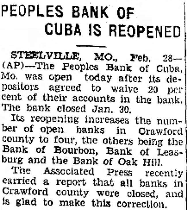 3 BANKS CLOSE THEIR DOORS; 1 DECLARES 3O DAYS MORATORIUM. Steelville, in fact Crawford formed. County, is brought face to face with the most serious condition It may seem strange to the and while their life work in two that has ever befallen our peo- outside world that these two great financial centers is wreck- ple. It is serious from more institutions, rated as they were ed beyond repair, they retain the In arithmetic we are having division problems. We are also learning how to check division problems. than one angle, striking as it among the strongest banks of respect, the esteem and the con- does the individual, the business the State, were wrecked SO fidence of their fellowman. quickly. And here is a story And this does not end the man, the professional man-de- that is highly interesting be- situation because it extends to IV The pupils of the fourth grade language class are writing letters today. stroying our strong financial cause it absolves the banking other towns, involving at least centers and laying waste with officials and the people of this two other banks, the Cook Sta- cyclonic procedure the vital city and community of any tion Bank organized and oper- ated by the stockholders of the Our arithmetic study is long division with remainders. fluid SO necessary to sustain blame in the matter. These two Farmers Bank, closed its doors. banks were wrecked by out of The Peoples Bank at Cuba,, also V In history we are drawing maps to show the various frontier changes. man in his worldly meanderings town depositors who becoming a strong institution was forced and making possible in business and home relations that peace alarmed at SO many bank fail- ures in St. Louis and other sec- to declare a moratorim and will We are memorizing Longfellow's "The Arrow and the Song" In Elementary Science we are reading about the formation of various roads. of mind and contentment which tions of the State during the bₑ closed for 30 days. W. H. Carr is cashier of the VI In arithmetic we are studying volume. We are making our posters which were sent with our "Weekly Readers." past three weeks, withdrew Cook Station Bank, and A. J. holds life and body together. Barnett is President of the their holdings. The procedure Monday morning the two banks in this city, the Crawford was gradual and there was no Peoples Bank which he organCounty Farmers Bank, organi- way to sense any immediate ized and was the prime moving zed in 1897, and the First Na- danger because it was natural agent of its affairs since its ortional Bank, organized in 1907, to believe that it would not ganization many years ago. Two closed their doors, posting no- continue beyond the breaking better men do not live anywhere Our new outside reading books are being read with much enthusiasm. tices that the affairs of the point. But it did and we are in- two institutions were now in formed that the withdrawals as and it is quite evident that they, too, are absolved of any the hands of the State and Fed- blame in the premises. late as Saturday by out of town We wish to thank all those who contributed to our ParentTeachers Associations drive. We are anxious to receive the dodge ball which was offered to the room receiving the most members. We received $6.50. eral receivers for liquidation. customers were exceedingly There was no prearranged No one will ever know the heavy. At this writing, Wednesday the Leasburg Bank, the Bank of Bourbon and the Oak Hill Bank VII We are working on the case of nouns and pronouns in grammar. We are testing in denominate numbers for arithmetic work. Several made low scores on our first test. We expect to do better tomorrow. agonies of the men in charge of run on either bank brought are still open and doing busi- these financial centers as they fought in an uneven battle to about by rumors of a chaotic ness. It is to be hoped they stem the tide of the steady ap- condition, and to the credit of will be able to stem the tide proaching enemy, only to sur- home depositors let it be said and will not become involved render when there was no ave- in the financial disaster. that they did not participate in nue of escape. Six o'clock Sat- the withdrawals of funds. And And what is the outlook for urday evening was an hour look- their action shows the great our little city and the other VIII We are writing a pageant that is to be given before the Parent Teachers meeting February 9th. In civics we are studying the early settlements in Missouri. We are studying the agreement of pronouns with their antecedents in English. Perry Ives who has been in a is improving. H. W. Buckley, a business man of St. Francois, Mo., for many years, has leased his business to his brother and will devote his time to the banking business, being president of the newly established Flat ver Bank. ed forward to with eagerness, confidence placed in the manage- communities effected by this because each hour of the day ment of both institutions. While disaster? It is grave indeed, brought new terrors and added the tense situation is sufficient but we can minimize its effects to the perplexities of a situation to cause criticism, it is grat- if we put forth the effort. This that was becoming alarming. ifying to the officials and close is a time for strong hearts to They knew the end was near- associates to hear no blame at- collect the vital energy within that neither institution could tached to any act in the man- survive and they bent every ef- agement of the two institutions. fort to hold the fort until the God knows it is like tearing out closing hour and closing the their heart strings to see a bus- doors with a balance in the iness with which they have checking department. They been associated for more than a their body and go forth to rise above this great disaster-th most devastating ever visited upon our people, but we can rise above it and rebuild the wreck if we do not falter as new problems of rehabilitation succeeded, but this was at a quar