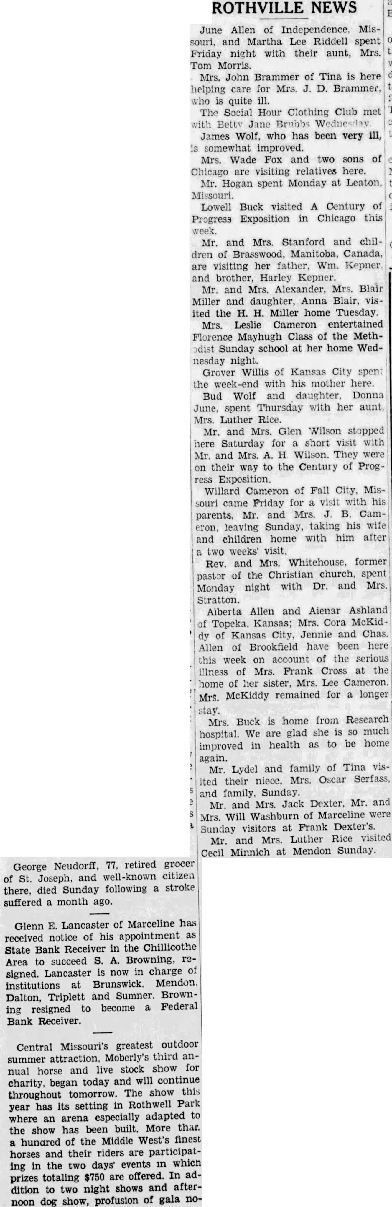 ROTHVILLE NEWS June Allen of Independence, Missouri, and Martha Lee Riddell spent Friday night with their aunt, Mrs. Tom Morris. Mrs. John Brammer of Tina is here helping care for Mrs. J. D. Brammer, who is quite ill. The Social Hour Clothing Club met with Betty Jane Brubbs Wednesday James Wolf, who has been very ill, is somewhat improved. Mrs. Wade Fox and two sons of Chicago are visiting relatives here. Mr. Hogan spent Monday at Leaton, Missouri. Lowell Buck visited A Century of Progress Exposition in Chicago this week. Mr. and Mrs. Stanford and children of Brasswood, Manitoba, Canada, are visiting her father, Wm. Kepner. and brother, Harley Kepner. Mr. and Mrs. Alexander, Mrs. Blair Miller and daughter, Anna Blair, visited the H. H. Miller home Tuesday. Mrs. Leslie Cameron entertained Florence Mayhugh Class of the Methodist Sunday school at her home Wednesday night. Grover Willis of Kansas City spent the week-end with his mother here. Bud Wolf and daughter, Donna June, spent Thursday with her aunt, Mrs. Luther Rice. Mr. and Mrs. Glen Wilson stopped here Saturday for a short visit with Mr. and Mrs. A. H Wilson. They were on their way to the Century of Progress Exposition. Willard Cameron of Fall City, Missouri came Friday for a visit with his parents, Mr. and Mrs. J. B. Cameron, leaving Sunday, taking his wife and children home with him after a two weeks' visit, Rev. and Mrs. Whitehouse, former pastor of the Christian church, spent Monday night with Dr. and Mrs. Stratton. Alberta Allen and Aienar Ashland of Topeka, Kansas; Mrs. Cora McKiddy of Kansas City, Jennie and Chas. Allen of Brookfield have been here this week on account of the serious illness of Mrs. Frank Cross at the home of her sister, Mrs. Lee Cameron. Mrs. McKiddy remained for a longer stay. Mrs. Buck is home from Research hospital. We are glad she is SO much improved in health as to be home again. Mr. Lydel and family of Tina visited their niece, Mrs. Oscar Serfass, and family, Sunday. Mr. and Mrs. Jack Dexter, Mr. and Mrs. Will Washburn of Marceline were Sunday visitors at Frank Dexter's Mr. and Mrs. Luther Rice visited Cecil Minnich at Mendon Sunday. George Neudorff, 77. retired grocer of St. Joseph, and well-known citizen there, died Sunday following a stroke suffered a month ago. Glenn E. Lancaster of Marceline has received notice of his appointment as State Bank Receiver in the Chillicothe Area to succeed S. A. Browning, resigned. Lancaster is now in charge of institutions at Brunswick. Mendon Dalton, Triplett and Sumner. Browning resigned to become a Federal Bank Receiver. Central Missouri's greatest outdoor summer attraction. Moberly's third annual horse and live stock show for charity, began today and will continue throughout tomorrow. The show this year has its setting in Rothwell Park where an arena especially adapted to the show has been built. More thar. a hundred of the Middle West's finest horses and their riders are participating in the two days' events in which prizes totaling $750 are offered. In addition to two night shows and afternoon dog show, profusion of gala no-
