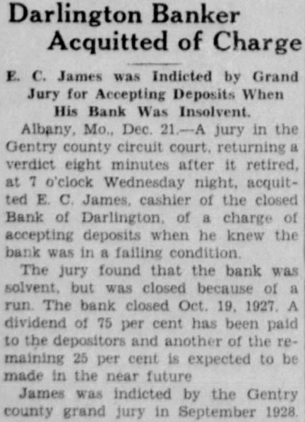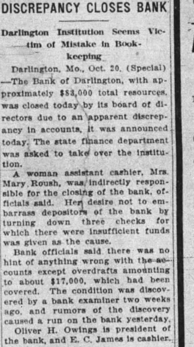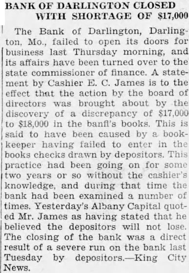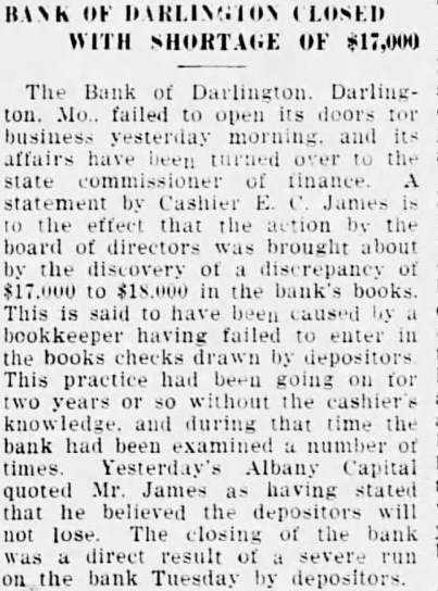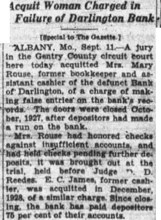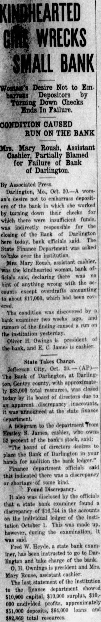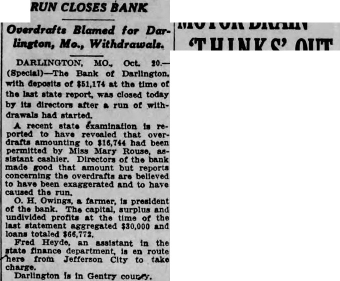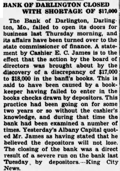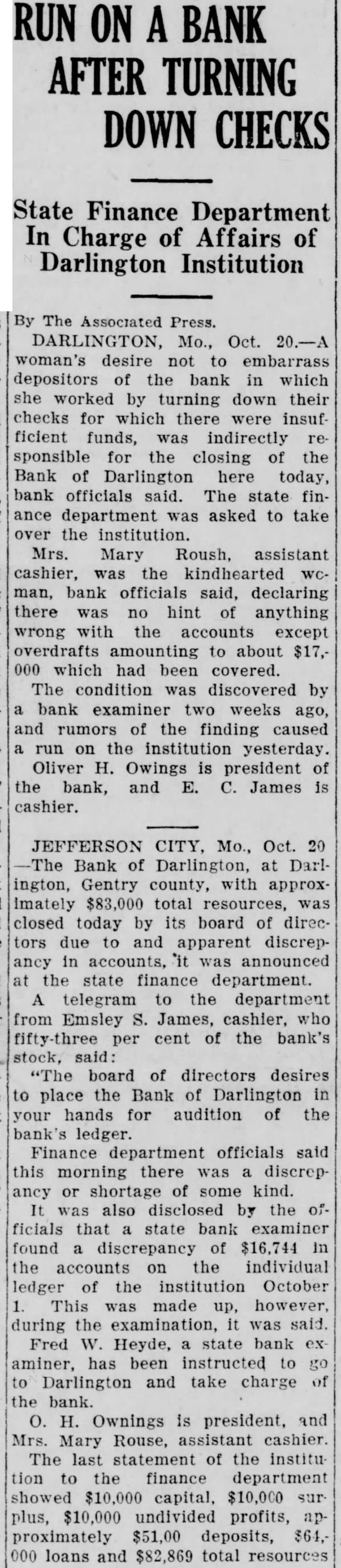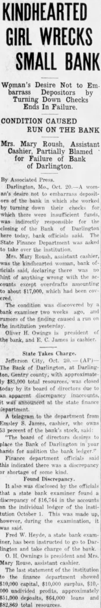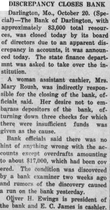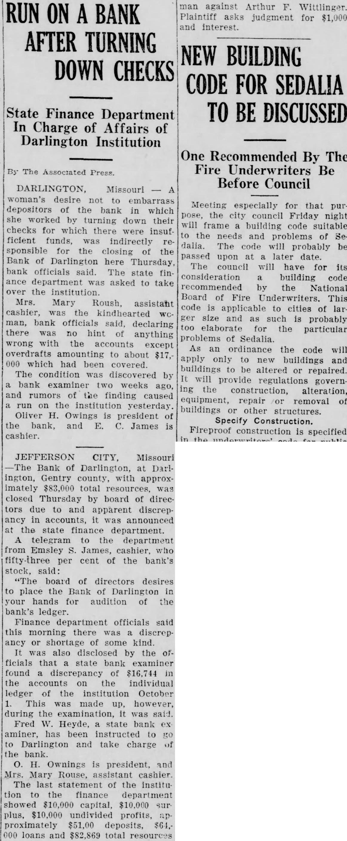 Union Star Mrs. M.d Miller, who has been in charge of the Commercial Hotel here moved last Saturday to her farm south of town and Mr. and Mrs. C. H. Bishop are now operating that place. Irvin Lester Stevens, son of Mr. and Mrs. Bert Stevens, and Miss Louise Dawes, daughter of Mr. and Mrs. Carl Dawes, were married by Rev. J. H. Keplinger at the home of the bride's grandparents, Mr. and Mrs. A. Hickox recently. They left immediately for Omaha where they will make their home. Mr. Stevens has a position with the Douglas County Farm Bureau at that city. national organization is asking them for double the membership which they had last year. Half of the money raised from the memberships at $1 each, goes to the national organization and half of it is kept for local charities. The supplies, which have been received for the roll call, will be distributed to the chairmen as soon as they are appointed and every effort will be made .0 complete the drive on Friday, November 11. The Bank of Darlington failed to open for business last week following a run on the bank Tuesday afternoon by a large number of depositors. The bank officials have notified the state finance commissioner to send an examiner to take charge of the bank.