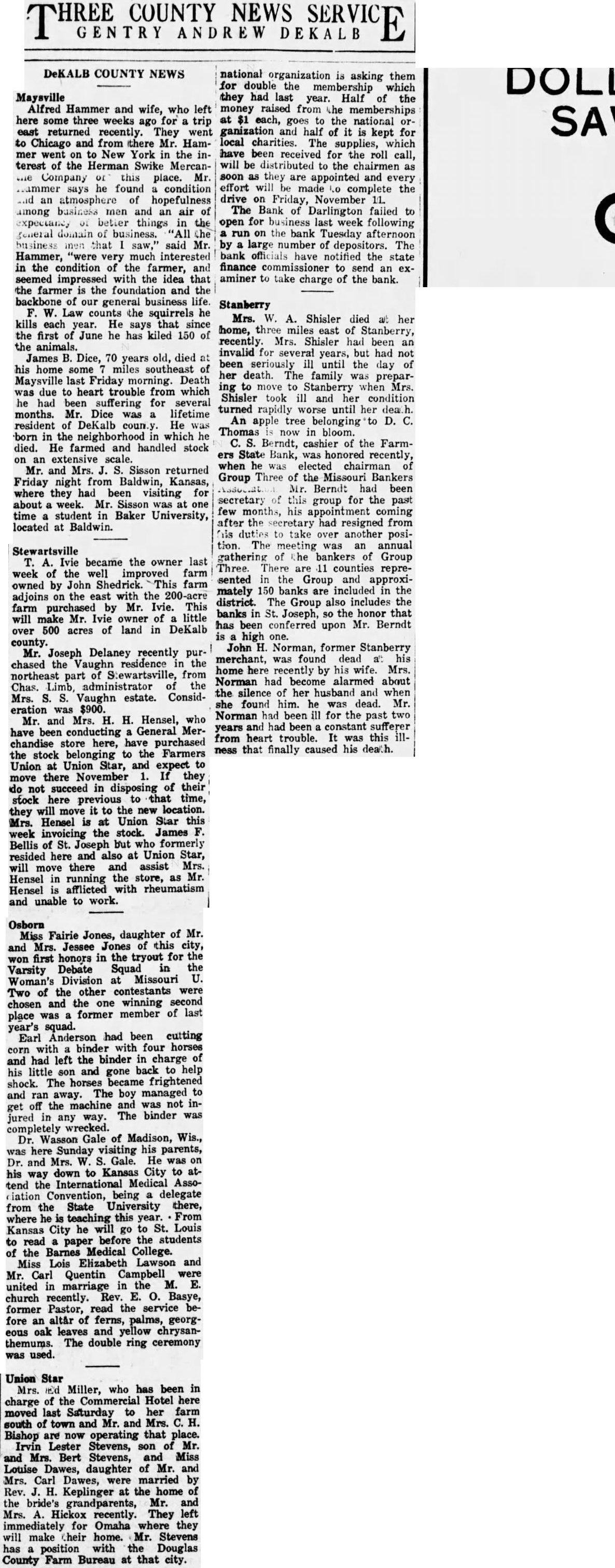 Stewartsville T. A. Ivie became the owner last week of the well improved farm owned by John Shedrick. This farm adjoins on the east with the 200-acre farm purchased by Mr. Ivie. This will make Mr. Ivie owner of a little over 500 acres of land in DeKalb county. Mr. Joseph Delaney recently purchased the Vaughn residence in the northeast part of Stewartsville, from Chas. Limb, administrator of the Mrs. S. S. Vaughn estate. Consideration was $900. Mr. and Mrs. H. H. Hensel, who have been conducting a General Merchandise store here, have purchased the stock belonging to the Farmers Union at Union Star, and expect to move there November 1. If they do not succeed in disposing of their stock here previous to that time, they will move it to the new location. Mrs. Hensel is at Union Star this week invoicing the stock. James F. Bellis of St. Joseph but who formerly resided here and also at Union Star, will move there and assist Mrs. Hensel in running the store, as Mr. Hensel is afflicted with rheumatism and unable to work.