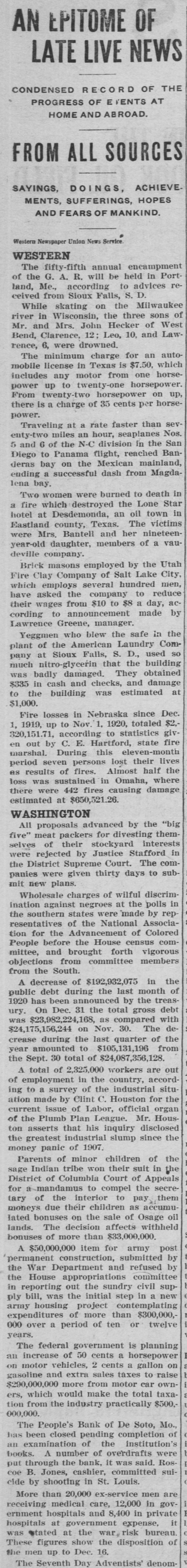 AN EPITOME OF LATE LIVE NEWS CONDENSED RECORD OF THE PROGRESS OF EVENTS AT HOME AND ABROAD. FROM ALL SOURCES SAYINGS, DOINGS, ACHIEVE. MENTS, SUFFERINGS, HOPES AND FEARS OF MANKIND. Western Newspaper Union News Service WESTERN The fifty-fifth annual encampment of the G. A. R. will be held in Port reland, Me., according to advices ceived from Sioux Falls, S. D. While skating on the Milwaukee river in Wisconsin, the three sons of Mr. and Mrs. John Hecker of West Bend, Clarence, 12: Leo, 10. and Lawrence, 6, were drowned. The minimum charge for an automobile license in Texas is $7.50, which includes any motor from one horsepower up to twenty-one horsepower. From twenty-two horsepower on up, there is a charge of 35 cents per horsepower. Traveling at a rate faster than seventy-two miles an hour, seaplanes Nos. 5 and 6 of the N-C division in the San Diego to Panama flight, reached Banderas bay on the Mexican mainland, ending a successful dash from Magdalena bay. Two women were burned to death in a fire which destroyed the Lone Star hotel at Desdemonda, an oil town in Eastland county, Texas. The victims were Mrs. Bantell and her nineteenyear-old daughter, members of a vaudeville company. Brick masons employed by the Utah Fire Clay Company of Salt Lake City, which employs several hundred men, have asked the company to reduce their wages from $10 to $8 a day, according to announcement made by Lawrence Greene, manager. Yeggmen who blew the safe in the plant of the American Laundry Company at Sioux Falls, S. D., used so much nitro-glycerin that the building was badly damaged. They obtained $335 in cash and checks, and damage to the building was estimated at $1,000. Fire losses in Nebraska since Dec. 1,1919, up to Nov. 1. 1920, totaled $2. 320,151.71, according to statistics given out by C. E. Hartford, state fire marshal. During this eleven-month period seven persons lost their lives as results of fires. Almost half the loss was sustained in Omaha, where there were 442 fires causing damage estimated at $650,521.26. WASHINGTON All proposals advanced by the "big five" meat packers for divesting themselves of their stockyard interests were rejected by Justice Stafford in the District Supreme Court. The companies were given thirty days to submit new plans. Wholesale charges of wilful discrimination against negroes at the polls in the southern states were made by representatives of the National Association for the Advancement of Colored People before the House census committee, and brought forth vigorous objections from committee members from the South. A decrease of $192,932,075 in the public debt during the last month of 1920 has been announced by the treasury. On Dec. 31 the total gross debt was $23,982,224,168, as compared with $24,175,156,244 on Nov. 30. The decrease during the last quarter of the year amounted to $105,131,196 from the Sept. 30 total of $24,087,356,128. A total of 2.325.000 workers are out of employment in the country, accord ing to a survey of the industrial situation made by Clint C. Houston for the current issue of Labor, official organ of the Plumb Plan League. Mr. Hous ton asserts that his inquiry disclosed the greatest industrial slump since the money panic of 1907. Parents of minor children of the sage Indian tribe won their suit in the District of Columbia Court of Appeals for a-mandamus to compel the secretary of the interior to pay them moneys due their children as accumulated bonuses on the sale of Osage oil lands. The decision affects withheld bonuses of more than $33,000,000. A $50,000,000 item for army post permanent construction, submitted by the War Department and refused by the House appropriations committee in reporting out the sundry civil supply bill, was the initial step in a new army housing project contemplating expenditures of more than $300,000,000 over a period of ten or twelve years. The federal government is planning an increase of 50 cents a horsepower on motor vehicles, 2 cents a gallon on gasoline and extra sales taxes to raise $290,000,000 more from motor car owners, which would make the total taxation from the industry practically $500,000,000. The People's Bank of De Soto, Mo. has been closed pending completion of an examination of the institution's books. A number of overdrafts were put through the bank, it was said. Ros coe B. Jones, cashier, committed suicide by shooting in St. Louis. are More than 20,000 ex-service men receiving medical care, 12,000 in govI ernment hospitals and 8,400 in private it hospitals at government expense, was stated at the war, risk bureau These figures show the disposition of the men up to Dec. 16. The Seventh Day Adventists' denom-