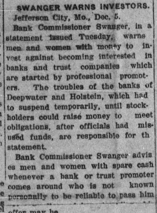 SWANGER WARNS INVESTORS. Jefferson City, Mo., Dec, 5. Bank Commissioner Swanger, in a statement issued Tuesday, warns men and women with money to invest against becoming interested in banks and trust companies which are started by professional promoters. The troubles of the banks of Deepwater and Holstein, which had to suspend temporarily, until stockholders could raise money to meet obligations, after officials had misused funds, are responsible for th statement. Bank Commissioner Swanger advis es men and women with spare cash whenever a bank or trust promoter known comes around who is not personally to be reliable to pass him