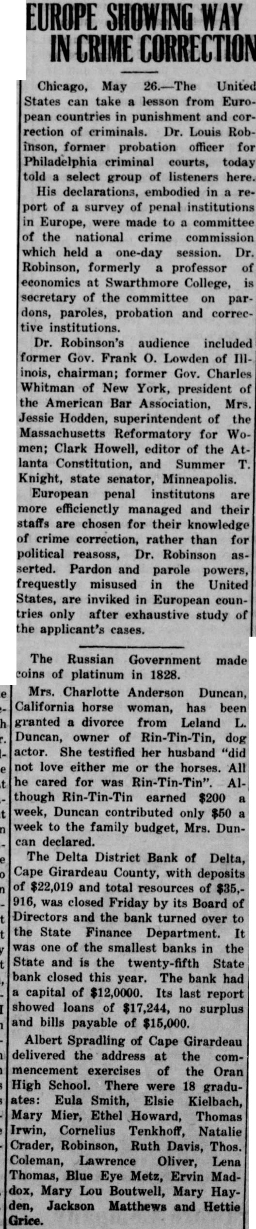 rection of criminals. Dr. Louis Robinson, former probation officer for Philadelphia criminal courts, today told select group of listeners here. His declarations, embodied in port of survey of penal institutions Europe, were made to a committee of the national crime commission which held one-day session. Dr. Robinson, formerly professor of economics at Swarthmore College, secretary of the committee on pardons, paroles, probation and corrective institutions. Dr. Robinson's audience included former Gov. Frank O. Lowden of inois, chairman; former Gov. Charles Whitman of New York, president of the American Bar Association, Mrs. Jessie Hodden, superintendent of the Massachusetts Reformatory for Women; Clark Howell, editor of the Atlanta Constitution, and Summer Knight, state senator, Minneapolis. European penal institutons are more efficienctly managed and their staffs are chosen for their knowledge of crime correction, rather than for political reasoss, Dr. Robinson asserted. Pardon and parole powers, frequestly misused in the United States, are inviked in European countries only after exhaustive study of the applicant's cases. The Russian Government made coins of platinum in 1828. Mrs. Charlotte Anderson Duncan, California horse woman, has been granted divorce from Leland Duncan, owner of dog actor. She testified her husband not love either me or the horses. All he cared for was Although earned $200 week, Duncan contributed only $50 week to the family budget, Mrs. Duncan declared. The Delta District Bank of Delta, Cape Girardeau County, with deposits of $22,019 and total resources of $35,916, was closed Friday by its Board of Directors and the bank turned over to the State Finance Department. one of the smallest banks in the State and is the twenty-fifth State bank closed this year. The bank had capital of $12,0000. Its last report showed loans of $17,244, no surplus and bills payable of $15,000. Albert Spradling of Cape Girardeau delivered the address at the commencement exercises of the Oran High School. There were 18 graduates: Eula Smith, Elsie Kielbach, Mary Mier, Ethel Howard, Thomas Irwin, Cornelius Tenkhoff, Natalie Crader, Robinson, Ruth Davis, Thos. Coleman, Lawrence Oliver, Lena Thomas, Blue Eye Metz, Ervin Maddox, Mary Lou Boutwell, Mary Hayden, Jackson Matthews and Hettie Grice.