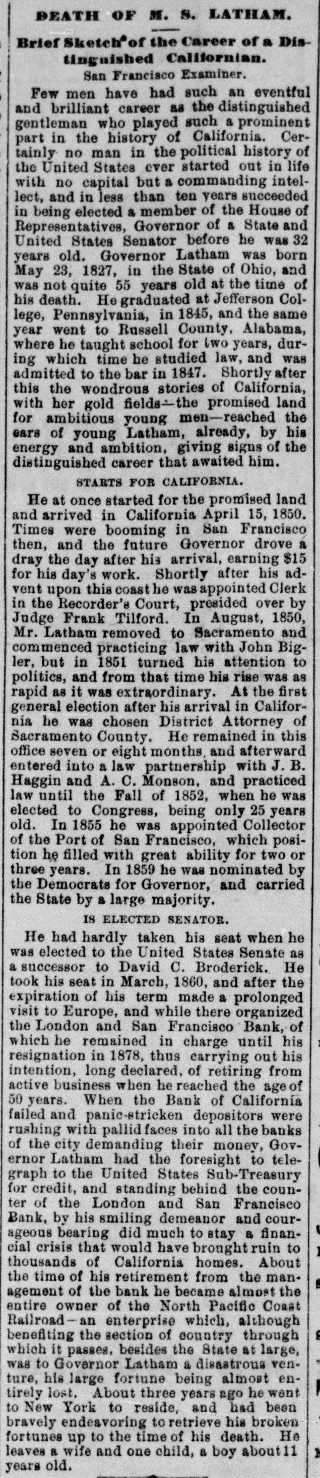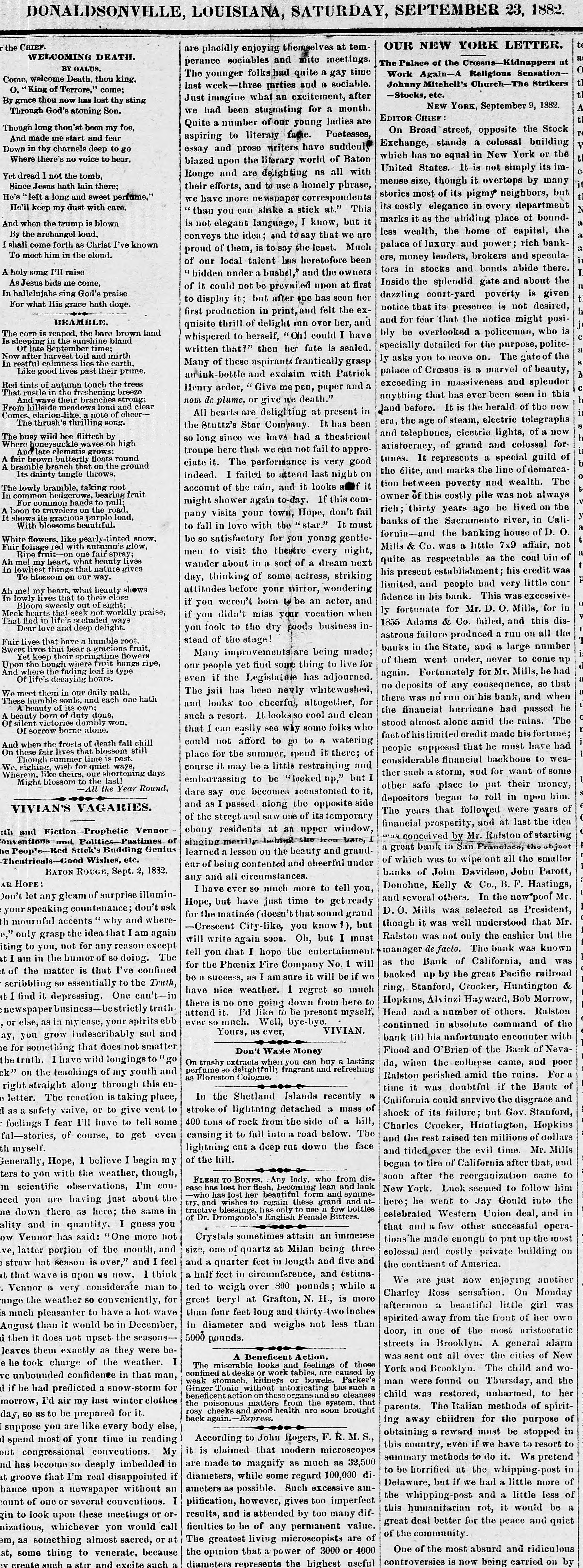 DONALDSONVELLE, LOUISIANA, SATURDAY, SEPTEMBER 23, OUR NEW YORK LETT the CHIEF. are placidly enjoying themselves at temWELCOMING DEATH. perance sociables and mite meetings. The Palace of the Croesns-Kidnap BY GALUS. The younger folks quite a gay time Work Again-A Religious Sen Come, welcome Death, thou king, Johnny Mitchell's Church-The last week-three parties and a sociable. o. King of Terrors," come; -Stocks, etc. Just imagine what an excitement, after By grace thou now has lost thy sting NEW YORK, September 9, we had been stagnating for a month. Through God's atoning Son. EDITOR CHIEF : Quite a number of our young ladies are Though long thou'st been my foe, On Broad street, opposite the aspiring to literaty fame. Poetesses, And made me start and fear Exchange, stands a colossal b Down in thy charnels deep to go essay and prose writers have suddenly which has no equal in New York Where there's no voice to hear, blazed upon the literary world of Baton United States. It is not simply Rouge and are deighting ns all with Yet dread I not the tomb, mense size, though it overtops by Since Jesus hath lain there; their efforts, and to use a homely phrase, stories most of its pigmy neighbo He's 'left a long and sweet perfume," we have more newspaper correspondent its costly elegance in every depa He'll keep my dust with care. " than you can slake a stick at.' This marks it as the abiding place of And when the trump is blown is not elegant language, I know, but it less wealth, the home of capit By the archangel loud, conveys the idea; and to say that we are I shall come forth as Christ I've known palace of luxury and power; rich proud of them, is to say the least. Much To meet him in the cloud. ers, money lenders, brokers and si of our local talent has heretofore been tors in stocks and bonds abide A holy song I'll raise bidden under a bushel," and the owners Inside the splendid gate and ab AsJesus bids me come, of it could not be prevailed upon at first In hallelujahs sing God's praise dazzling court-yard poverty is to display it; but after one has seen her For what His grace hath done. notice that its presence is not e first production in print, and felt the exand for fear that the notice migh BRAMBLE. quisite thrill of delight jun over her, and The corn is reaped, the bare brown land bly be overlooked a policeman, whispered to herself, Oh! could I have Is sleeping in the sunshine bland specially detailed for the purpose Of late September time: written that?" then her fate is sealed. Now after harvest toil and mirth ly asks you to move on. The gat In restful calmness lies the earth. Many of these aspirants frantically grasp palace of Cross is a marvel of Like good lives past their prime. air ink-bottle and exclaim with Patrick exceeding in massiveness and 8 Red tints of antumn touch the trees Henry ardor, Give pen, paper and a That rustle the freshening breeze anything that has ever been seen And wave their branches strong: nom de plume, or give r death." From meadows loud and clear Jand before. It is the herald of t All hearts are delighting at present in Comes clarion-like, note of cheer era, the age of steam, electric tel The thrush's thrilling song. the Stuttz's Star Company. It has been and telephones, electric lights, o The busy wild bee flitteth by so long since we have had a theatrical high Where honeysuckle waves oh aristocracy, of grand and colos troupe here that we can not fail to appreAnd late elematis grows; A fair brown butterfly floats round tunes. It represents a special E ciate it. The performance is very good A bramble branch that on the ground the elite, and marks the line of de Its dainty tangle throws. indeed. I failed to attend last night on tion between poverty and wealt The lowly bramble, taking root account of the rain, and it looks a it In common hedgerows, bearing fruit owner of this costly pile was not might shower again to-day. If this comFor common hands pull; rich; thirty years ago he lived A boon to travelers on the road. pany visits your town, Hope, don't fail It shows its gracious purple load, banks of the Sacramento river, i With blossoms beautiful. to fall in love with the 'star." It must fornia-and the banking house o White flowers, like pearly-tinted snow, be so satisfactory for you young gentleMills & Co. was a little 7x9 aff Fair foliage red with autumn's glow, men to visit the theatre every night, Ripe fruit-on one fair spray; quite as respectable as the coa Ah mel my heart, what beauty lives wander about in a sort of a dream next In lowliest things that nature gives his present establishment; his cre To blossom on our way. day, thinking of some actress, striking limited, and people had very lit attitndes before your nirror, wondering Ah me! my heart, what beauty shows fidence in bis bank. This was ex In lowly lives that to their close if you weren't born be an actor, and Bloom sweetly out of sight: ly fortunate for Mr. D. O. Mills Meck hearts that seek not worldly praise, if you didn't miss your vocation when That find in life's secluded ways 1855 Adams & Co. failed, and t you took to the dry goods business inDear love and deep delight. astrous failure produced a run on stead of the stage Fair lives that have a humble root. banks in the State, aud a large Sweet lives that bear a gracious fruit, Many improvements are being made; Yet keep their springtime flowers of them went under, never to o Upon the bough where fruit hangs ripe, our people yet find some thing to live for And where the fading leaf is type again. Fortunately for Mr. Mills even if the Legislatue has adjourned. Of life's decaying hours. no deposits of any consequence, The jail has been newly wlntewashed, We meet them in our daily path, there was no run on his bank, an These humble souls, and each one hath and looks too cheerfa), altogether, for A beauty of its own: the financial burricane had pa A such a resort. It looks so cool and clean beauty born of duty done, stood almost alone amid t