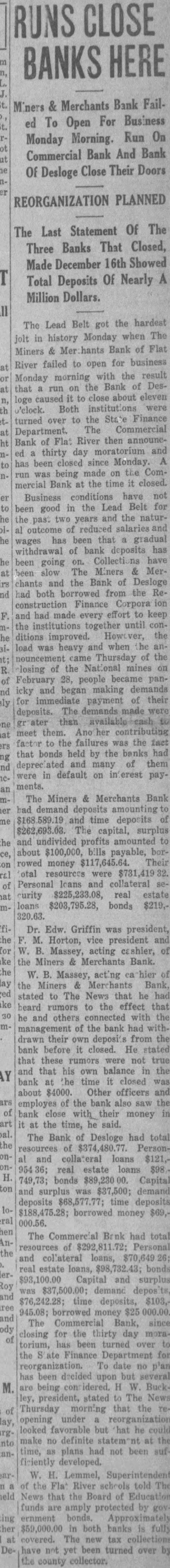 (Lead Belt The Lead Belt the hardest history Monday when the Miners Merchants Bank of Flat River failed open for business Monday morning the result that on the Bank of Desloge caused it to close about eleven o'clock. Both institutions turned over to the State Finance The Commercial Bank of partment. River then announced thirty day moratorium and has been closed since Monday. was being made run the Commercial Bank at the time closed. Business conditions have not been good in the Lead Belt for the past and the natural outcome of duced salaries and wages has that gradual withdrawal of deposits has beengoing Collections have been slow The Miners Merchants and the Bank of Desloge had both borrowed from the construction Finance Corporation had made effort to keep every together until improved. However, the load improved. However, the load heavy and when the closing of the National mines February 28, people became panicky and began making demands for mediate payment of their deposits. The demands made were, greater available cash to meet them. other contributing factor to failure was the fact that bonds held the banks had depresiated and many of them were in default terest payments. The Miners Merchants Bank had demand deposits amounting and time deposits $262,693.03. The capital, surplus and undivided profits amounted to about $100,000, bills payable, borrowed $117,645.64. Their total money resources were sonal loans and collateral security real estate loans bonds Dr. Edw. Griffin was president, Horton, and cashier, Merchants Bank. B. Massey, acting cashier the Miners Merchants Bank, stated the News that he had heard rumors the effect that he and others connected with the management of the bank had withdrawn their own deposits from the bank before closed. He stated that these rumors were not true and that his balance in the bank at the time closed was about $4000. Other officers and employes of the bank also the bank close with their money at the time, he said. The Bank Desloge had total resources of $374,480.77. Personal and collateral loans real estate loans $98,749.73; bonds 230.00. Capital and surplus $37,500; demand deposits time deposits borrowed money The Commercial Bank had total of personal loans, real loans, bonds, Capital and surplus was time deposits, $103,945.08; borrowed money, The Commercial Bank, since for the thirty day moratorium, has been turned over to the State Finance Department for reorganizaTo date no plan has been upon but several are sidered. H. Buckley, president, stated to the News Thursday that the re-opening under organization looked favorable he could make no definite stateat the time, as plans had sufficiently developed. H. Lemmel, superintendent Flat River schools told the News that the Board Education funds amply protected government bonds. Approximately both banks fully covered. The tax collections have not turned over by the county
