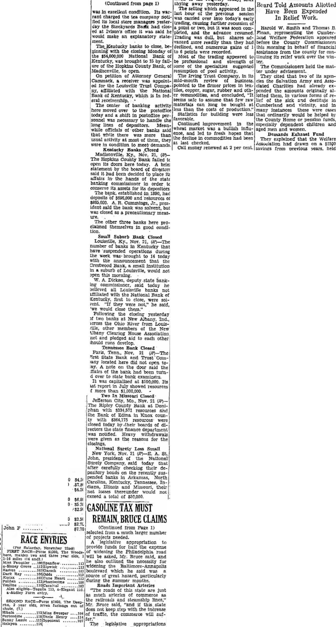 Withdrawals On Strength Of Unfounded Rumors Many Closing Orders. drawals, caused in some by unfounded rumors, forced the closing 12 banks in six southern and middle western states today. The total number banks which closed within the last five days was brought 110 result finanin Indiana, Kansas, North Carolina, Missouri, Kentucky and Tennessee. Twenty closings OCyesterday. Dependence larger institutions which failed Little Rock, Ark. Nashville, attributed the cause difficulties for majority the The situation Louisville, Ky. caused four banks southern Indiana close today. False rumors that two Albany, Ind., banks checks, which originated in their refusal to cash vouchers on Louisville caused both suspend yesterday The banks that closed day Crawford County State bank English: State bank; Jackson Township bank Corydon. Junction, and Old Capitol bank and trust company of Corydon. The National bank Asheville, the Citizens bank of Bryson City and the Bank Hazel suspended North today, raising to the total the state all was bereal Failure of Quincy, III., institutions last blamed for eight other closing, was sponsible for Ripley County bank Doniphan, Mo., and the Bank of Edina, Mo., In Kentucky, where eight Louisville others in the are protecting their the Bank Crestwood failed open today. Nine loan tions taken law permitting them require 30 advance notice for withdrawals. The First State Bank and True: company Paris, Tenn., failed open today. The institution, has total resources of $1,000,000. had weathered steady withdrawals over period two weeks previously. (Kans.) bank took similar turned its state department for The bank had The American Exchange Trust company Little suspension precipitated the closing 34 Arkansas banks affiliated with reached stage in its today which indicated it would be reopened new national bank was formed Merchants suspended Monday with deposits of $725,000.