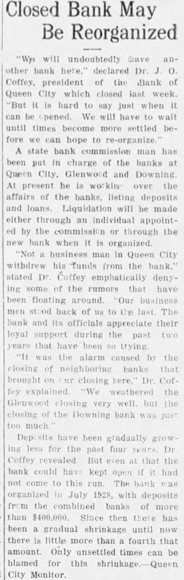Closed Bank May Be Reorganized undoubtedly have other bank declared Dr. president of the Bank of Queen City which closed last week. hard to say just when can opened. will have to wait until times become settled fore can hope to re-organize.' state bank commission man has been put in charge of the banks at Queen City, Glenwood and Downing At present he working over the affairs of the banks, listing deposits and loans. Liquidation will be made either through an individual appointby the commission through the bank when organized. business man in Queen City withdrew Tunds from the bank." stated Coffey emphatically denysome of the rumors that have been floating around. "Our business back of to last. The and officials appreciate their support during the past that have been the alarm caused the closing neighboring banks that brought closing Cofexplained. weathered the closing very well. but closing the Downing bank have been gradually ing for the past four Dr Coffey revealed But that the bank could have kept open had this The bank organized July 1928, with deposits the combined banks more than $400,000. Since then has been gradual shrinkage until there little more than fourth that amount. Only unsettled times can be blamed for this City Monitor.