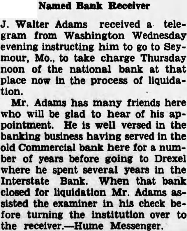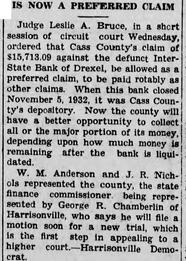 IS NOW PREFERRED CLAIM Judge Leslie Bruce, in short session of circuit court Wednesday, ordered that Cass County's claim of against the defunct InterState Bank of Drexel, be allowed preferred claim, to be paid rotably other claims. When this bank closed November 1932, was Cass Coundepository. Now the county will have better opportunity to collect all or the major portion its money, depending upon how much money remaining after the bank dated. M. Anderson and R. Nichols represented the county, the state finance being represented by George R. Chamberlin of Harrisonville, who says he will file motion soon for new trial, which the first step in appealing to higher Democrat.