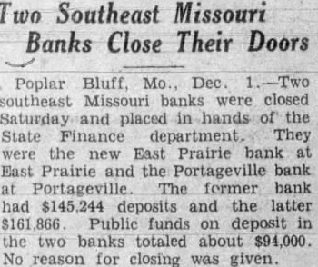 Two Southeast Missouri Banks Close Their Doors Poplar Dec southeast Missouri banks were closed Saturday and placed in hands of the State Finance department They were the new East Prairie bank East Prairie and the Portageville bank Portageville. The former bank had $145,244 deposits and the latter Public funds on deposit the two banks totaled about No reason for closing was given.