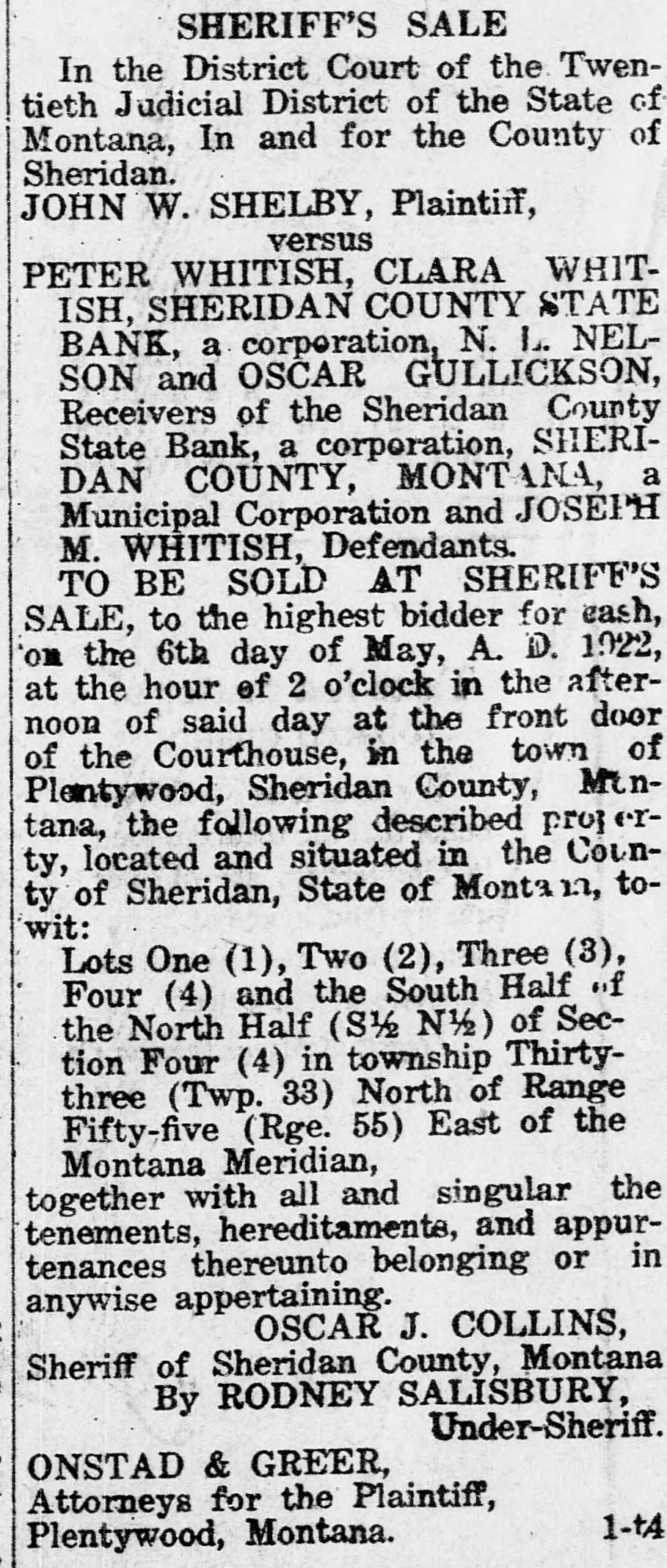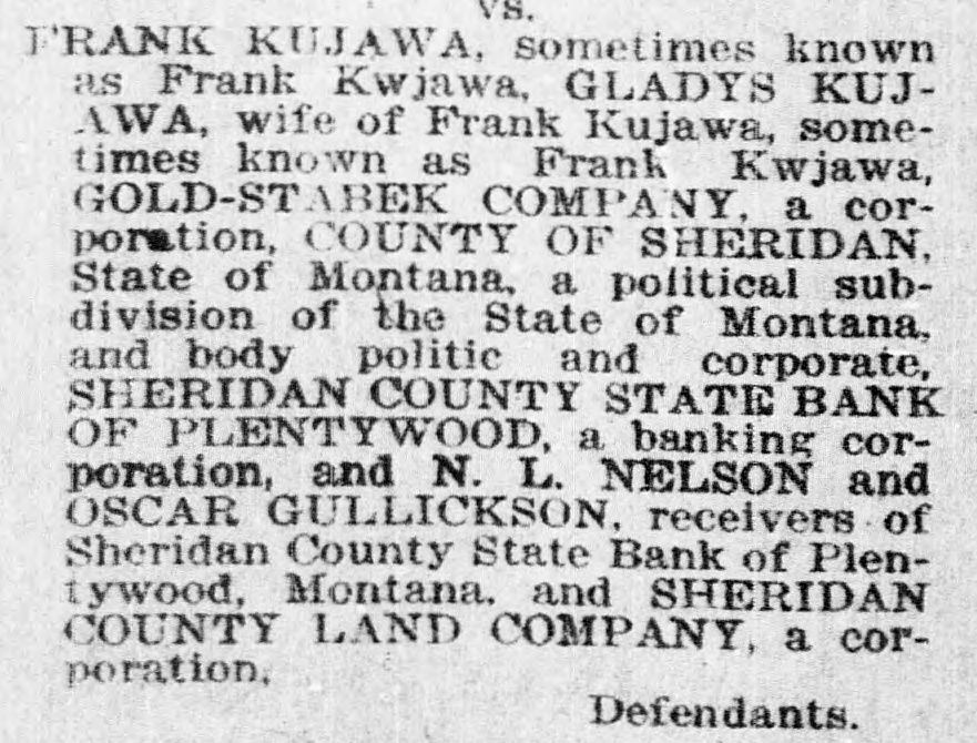 CLOSED BY EXAMINERS Rumors Indicate Reasons Other Than Money Stringency-Has Big County Deposits Producers News-The Sheridan County State Bank failed Saturday. The State Bank examiners arrived in Plentywood, coming from Scobey last Friday afternoon and commenced examining the books of that bank and at 10:00 o'clock Saturday morning, a had made exafter quite heavy number deposits, of people the aminers put up a sign written on the bank stationery, in the glass of the door with the information "Run Short of Money, Bank Closed for Today," but with no signature on the notice. The news spread rapdily about town, but most people did not worry, that reserve run low and curthinking that by the Monday morning had rency would be on hand and that the bank would open again for business. In the meantime the wildest sort of rumors were set afloat and before night it was claimed that the condition of the bank was very serious. The fact of the closing of the bank simply dumfounded the people because was on hardly of yet the dry fact that articles the published ink in the press of the state by Bank Examiner McGraw stating that the banks of the state were in splendid condition and that the total reserve of the banks in the state had increased over two millions of dollars, and because of the fact that the banks of Sheridan county had only been examined about a month ago, everybody in Sheridan county was resting easy, having implicit faith in the state bank department. Hundreds of local people have their all in the closed bank, and the failure of that institution has cast a dark cloud over the holiday season in Sheridan county. The closing of the Sheridan County State Bank came as a thunderbolt out of a clear sky as that institution was considered one of the strongest banks in eastern Montana. Depositors Will Be Paid W It was announced by employees of f the bank Wednesday that T. L. Beisti of the bank of Fesa N. D., he senden, eker, president telegraphed that that all would see to it the in would be paid a that the depositors It is personally rumored off bank in full. has been looted and that the books and records of the bank have been altered and falsified to disguise the unlawful transactions. It is rumored that while the county has $265,000 on deposit in the closed bank, the examiners discovered that the bank books showed that there was only $75,000 credited to the county in the bank. McGraw Arrives The conditions existing are so serous that State Bank Examiner McGraw himself came to Plentywood Wednesday morning on the train to ake personal charge of the bank, While it is claimed that the bank vill be re-organized by officers of the ank, this is generally doubted by he general public because of the tringent financial conditions of the puntry generally. County Badly Involved It also seems that the sinking fund f Sheridan county is badly involved S it is alleged that $265,000 of that und is in that bank. It is reported at the county bank held a surety ond for the closed bank in the sum : $125,000 and a personal bond gned by T. L. Beiseker and L. G. eidler in the sum of $50,000, and cond bond in the same amount gned by the same parties and a ird bond in the sum of $50,000 ed in October, signed by T. L. Beiser and Cashier C. J. Beiseker, hich was supposed to be a tempory bond for use during the flush ason. It is alleged that the bondsen are in for a loss, and it is rumed that County Treasurer Movius d his bondsmen are also legally reonsible because of the fact that he si violated the law in placing the mount of money that he has in one nk, and it is also claimed on good thority that the county commisners and the county attorney are o jointly liable for any loss that : county may sustain by reason of ir neglect in complying with the v and in seeing that the law is comed with. It seems very likely at this time t the county deposits are perfectsafe, and that the county will susno loss.