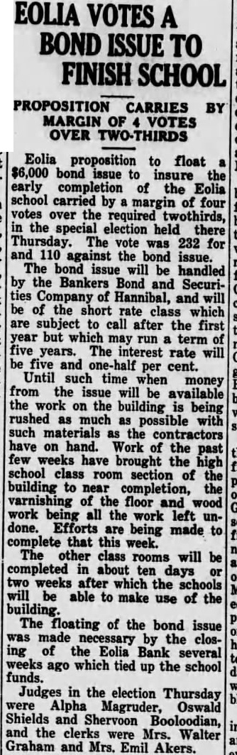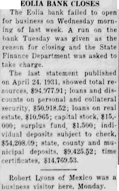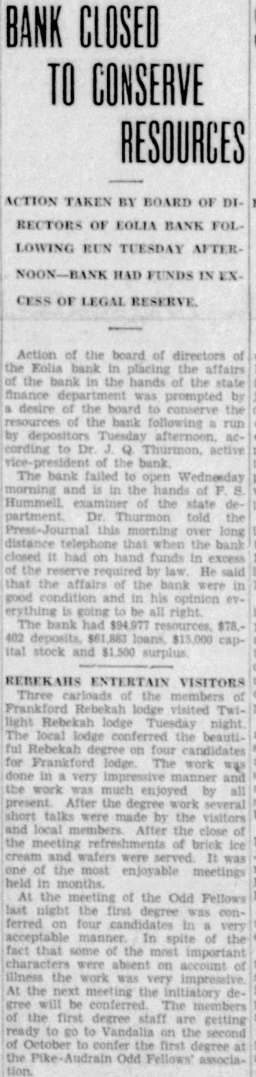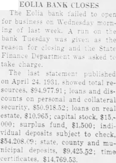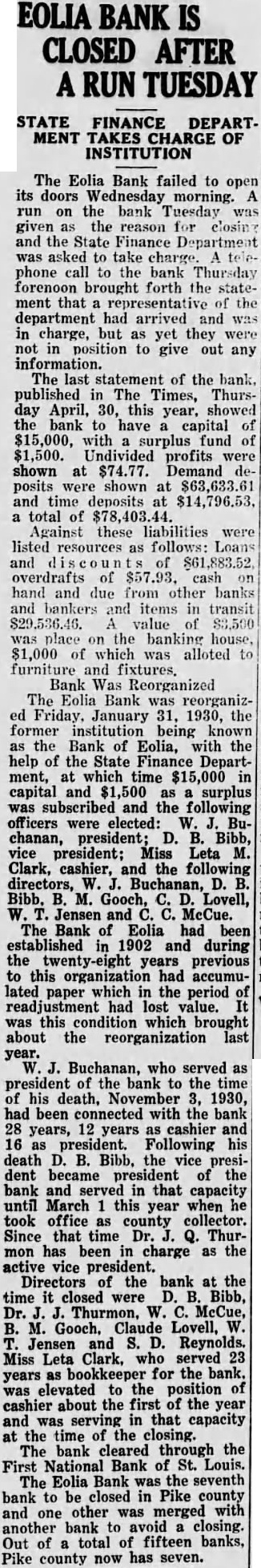 BANK IS CLOSED AFTER A RUN TUESDAY STATE FINANCE DEPARTMENT TAKES CHARGE INSTITUTION The Eolia Bank failed to its doors morning. the bank the reason for closing the State Finance phone the bank brought forth the statement that of the had arrived and charge, but yet they position to give out any statement of the bank. published Times, ThursApril, 30, this showed have capital surplus fund $1,500. Undivided profits were shown $74.77. Demand posits shown at and time deposits total Against these liabilities were listed resources follows: Loans $61,883.52 overdrafts of cash hand and due from other banks and bankers items transit $29,536.46. value place on the banking which alloted furniture fixtures. Bank Reorganized The Eolia Bank reorganizJanuary 1930, the former being known the of Eolia, the of the State Department, capital and $1,500 surplus and officers were elected: chanan, D. Miss Leta Clark, cashier, and the following directors, Bibb. Gooch, Lovell, Jensen McCue. The Bank of Eolia had been established 1902 during the years previous this organization accumulated paper which period value. which brought about the reorganization Buchanan, who served president bank the time his death, 1930, been connected bank years cashier Following death vice dent became president in that capacity until March this year when took office county collector. Since that time Thurhas been charge as the active president. Directors the bank the closed were Bibb, Thurmon, W. McCue, Claude Lovell, Jensen and Reynolds. Miss Leta Clark, served bookkeeper for the bank. elevated the position cashier about first the year that capacity the time the closing. through the First National Bank St. Louis. Bank the seventh bank closed in Pike county other with one closing. Out total fifteen banks, Pike county now seven.