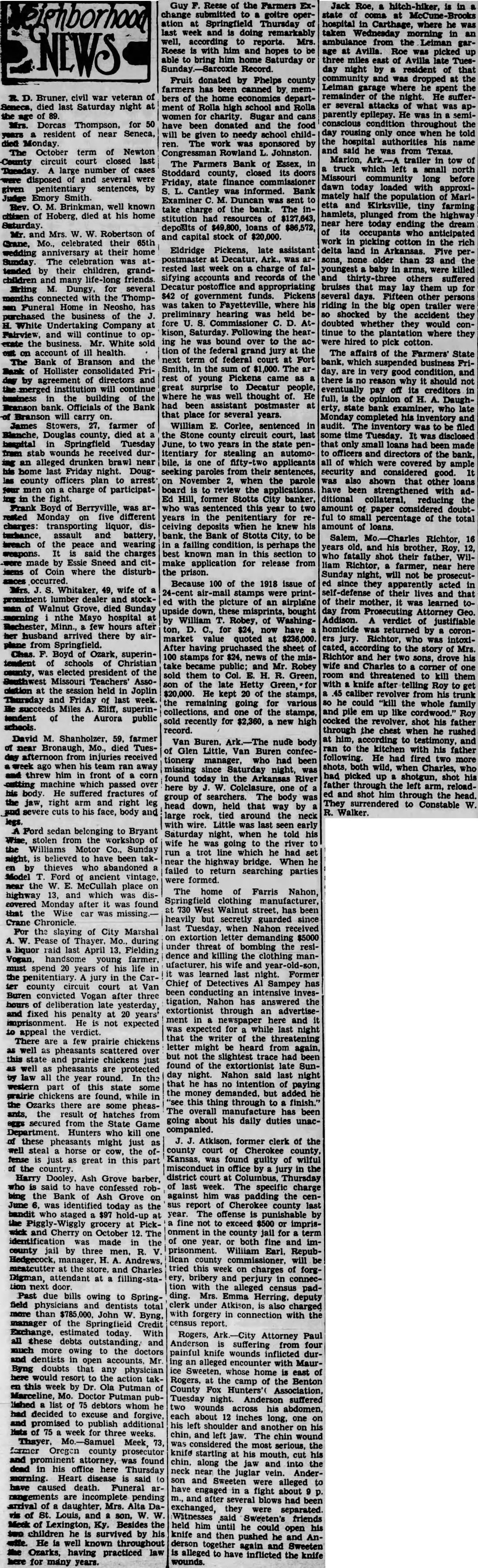 Bruner, civil war veteran of Seneca, died last Saturday night at the of Mrs. Dorcas Thompson, for 50 years resident of near Seneca, Monday. The October term of Newton -County circuit court closed last Tuesday. large number of cases disposed of and several were given penitentiary sentences, by Judge Emory Smith. Rev. M. Brinkman, well known citizen of Hoberg, died at his home Saturday. and Mrs. W. W. Robertson of Grane, Mo., celebrated their 65th wedding anniversary at their home Sunday. The celebration was tended by their children, grandchildren and many life-long friends. M. Dungy, for several months connected with the ThompFuneral Home in Neosho, has purchased the business of the White Undertaking Company at Fairview, and will continue to opthe business. Mr. White sold on account of ill health. The Bank of Branson and the Bank of Hollister consolidated Friby agreement of directors and merged institution will continue the building of the Branson bank. Officials of the Bank Branson will carry on. James Stowers, 27, farmer of Blanche, Douglas county, died at in Springfield Tuesday stab wounds he received duran alleged drunken brawl near home last Friday night. Dougcounty officers plan to arrest men on charge of participatin the fight. Frank Boyd of Berryville, was rested Monday five different charges: transporting liquor, disturbance, assault and battery, of the peace and wearing wespons. It is said the charges made by Essie Sneed and citof Coin where the disturboccurred. Whitaker, 49, wife of prominent lumber dealer and stockof Walnut Grove, died Sunday morning nthe Mayo hospital at Rechester, Minn., few hours after husband arrived there by airplane from Springfield. Chas. F. Boyd of Ozark, superintendent of schools of Christian county, was elected president of the Missouri Teachers' Associstion at the session held in Joplin Thursday and Friday of last week. succeeds Miles Eliff, superintendent of the Aurora public schools. David M. Shanholzer, 59, farmer near Bronaugh, Mo., died Tuesafternoon from injuries received ago when his team ran away threw him in front of corn cutting machine which passed body. He suffered fractures of the jaw, right arm and right leg severe cuts to his face, body and Ford sedan belonging to Bryant Wise, stolen from the workshop of the Williams Motor Co., Sunday is believed to have been takby thieves who abandoned Model Ford of ancient vintage, near the W. E. McCullah place on highway 13, and which was discovered Monday after it was found that the Wise car was Crane Chronicle. For the slaying of City Marshal Pease of Thayer, Mo., during liquor raid last April 13, Fielding Vogan, handsome young farmer, must spend 20 years of his life in the penitentiary. jury in the ter county circuit court at Van Buren convicted Vogan after three hours of deliberation late yesterday, and fixed his penalty at 20 years' He not expected appeal the verdict. There are few prairie chickens well as pheasants scattered over this state and prairie chickens just as well as pheasants are protected law all the year round. In the western part of this state some grairie chickens are found, while in the Ozarks there are some pheasants, the result of hatches from aggs secured from the State Game Department. Hunters who kill one these pheasants might just well steal horse or COW, the fense is just as great in this part the country. Harry Dooley, Ash Grove barber, who is said to have confessed robbing the Bank of Ash Grove on June was identified today as the bandit who staged $97 hold-up at the grocery at wick and Cherry on October 12. The identification was made in the county jail by three men, Hedgecock, manager, H. Andrews, meatcutter at the store, and Charles Digman, attendant at tion next door. Past due bills owing to Springfield physicians dentists total more than $785,000. John W. Byng, manager of the Springfield Credit Exchange, estimated today. With all these debts outstanding, and much more owing to the doctors and dentists in open accounts, Mr. Byng doubts that any physician here would resort to the action takthis week by Dr. Ola Putman of Marceline, Mo. Doctor Putman published list of 75 debtors whom he had decided to excuse and forgive, and promised to publish additional of 75 week for three weeks. Thayer, Mo.-Samuel Meek, 73, former Oregon county and attorney, was found dead in his office here Thursday morning. Heart disease is said to have caused death. Funeral arrangements are incomplete pending arrival of daughter, Mrs. Alta Daof St. Louis, and son, W. of Lexington, Ky. Besides the children he is survived by his He is well known Ozarks, having practiced law for many years. Guy Reese of the Farmers Exchange submitted to goitre operation at Springfield Thursday of last week and is doing remarkably well, according to reports. Mrs. Reese is with him and hopes to be able to bring him home Saturday or Record. Fruit donated by Phelps county farmers has been canned by members of the home department of Rolla high school and Rolla women for charity. Sugar and cans have been donated and the food will be given to needy school childThe work was sponsored by Congressman Rowland Johnston. The Farmers Bank of Essex, in Stoddard county, closed its doors Friday, state finance commissioner Cantley was informed. Bank Examiner M. Duncan was sent to take charge of the bank. The stitution had resources of deposits of loans of $86,572, and capital stock of Eldridge Pickens, late assistant postmaster at Decatur, Ark., rested last week on charge of falsifying accounts and records of the Decatur postoffice and appropriating $42 of government funds. Pickens was taken to Fayetteville, where his preliminary hearing was held before U. S. Commissioner Atkison, Saturday. Following the hearing he was bound over the action of the federal grand jury at the next term of federal court at Fort Smith, in the sum of The rest of young came great surprise to Decatur people, where he was well thought of. He had been assist