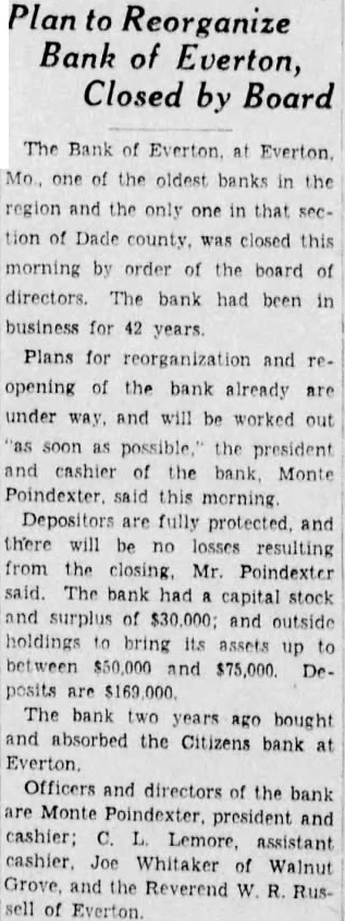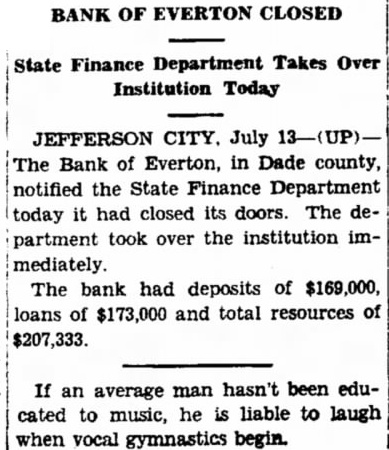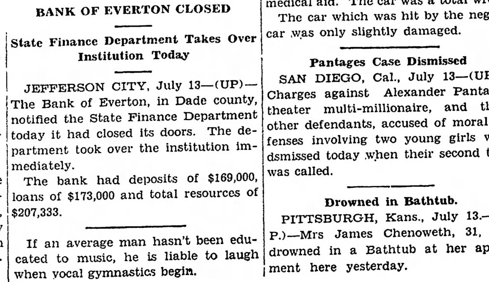 OF EVERTON CLOSED BANK Department Takes Over Finance Institution Today Pantages Case Dismissed SAN JEFFERSON CITY, July against Alexander Charges of Everton, in county, Bank and notified the State Finance accused of moral other defendants, closed its doors. The had involving two young girls fenses took over the institution partment their second dsmissed today when mediately. called. had deposits of $169,000, bank of $173,000 and total resources Drowned in Bathtub. $207,333. Kans., July P.)-Mrs James hasn't been eduan average man in Bathtub at her drowned he liable to laugh to music, ment here yesterday. vocal gymnastics begin.