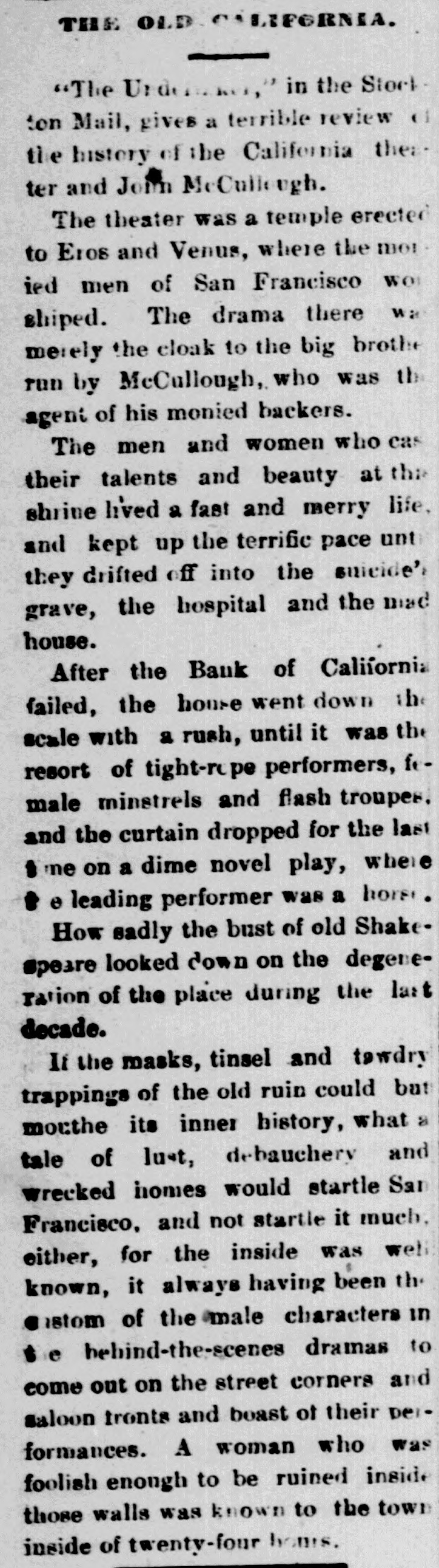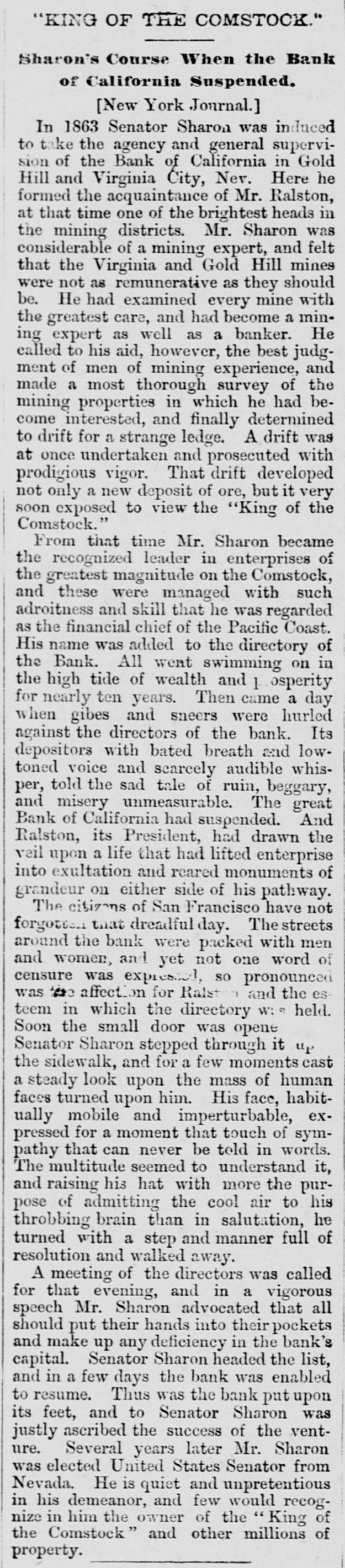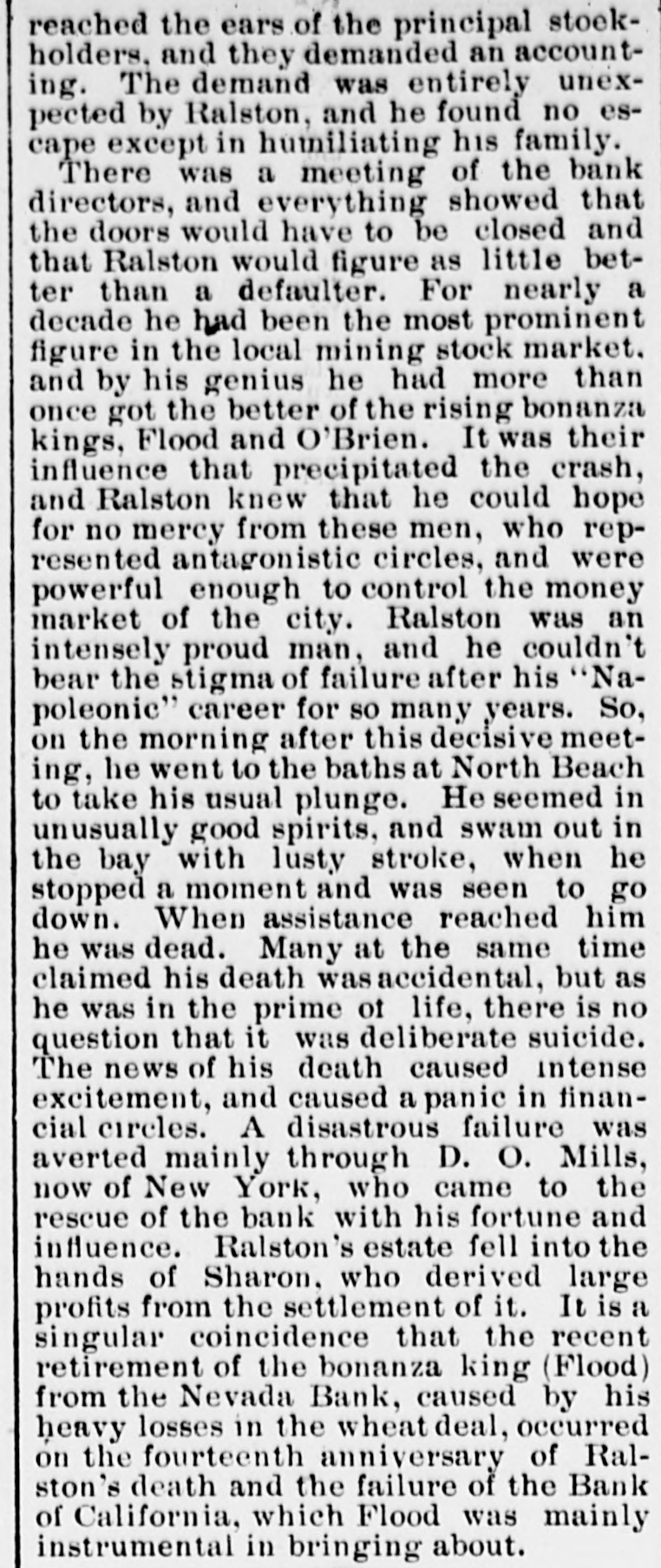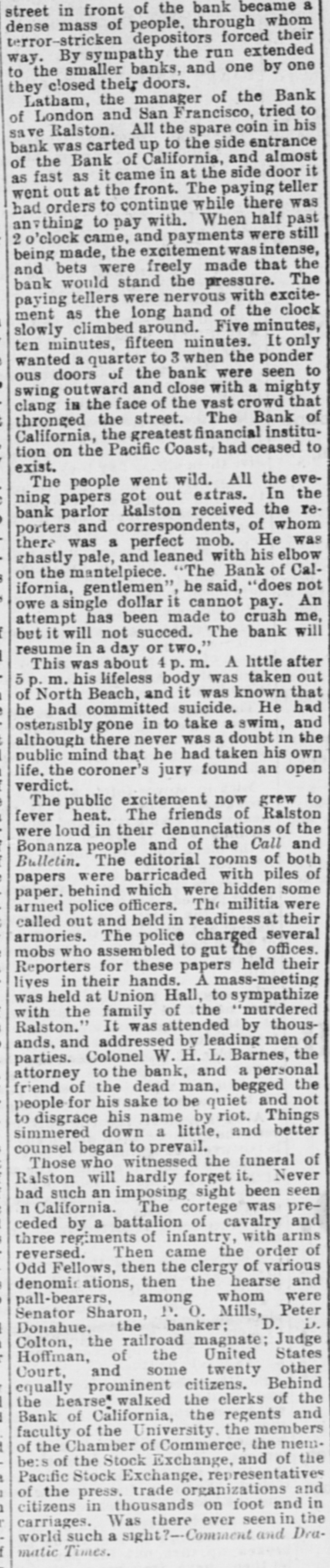 street in front of the bank became a dense mass of people, through whom terror-stricken depositors forced their way. By sympathy the run extended to the smaller banks, and one by one they closed their doors. Latham, the manager of the Bank of London and San Francisco, tried to save Ralston. All the spare coin in his bank was carted up to the side entrance of the Bank of California, and almost as fast as it came in at the side door it went out at the front. The paying teller had orders to continue while there was anvthing to pay with. When half past 2 o'clock came, and payments were still being made, the excitement was intense, and bets were freely made that the bank would stand the pressure. The paying tellers were nervous with excitement as the long hand of the clock slowly climbed around. Five minutes, ten minutes, fifteen minutes. It only wanted a quarter to 3 when the ponder ous doors of the bank were seen to swing outward and close with a mighty clang in the face of the vast crowd that thronged the street. The Bank of California, the greatest financial institution on the Pacific Coast, had ceased to exist. The people went wild. All the evening papers got out extras. In the bank parlor Ralston received the reporters and correspondents, of whom there was a perfect mob. He was ghastly pale, and leaned with his elbow on the mantelpiece. "The Bank of California, gentlemen", he said, "does not owe a single dollar it cannot pay. An attempt has been made to crush me, but it will not succed. The bank will resume in a day or two," This was about 4 p. m. A little after 5 p.m. his lifeless body was taken out of North Beach, and it was known that he had committed suicide. He had ostensibly gone in to take a swim, and although there never was a doubt in the public mind that he had taken his own life. the coroner's jury found an open verdict. The public excitement now grew to fever heat. The friends of Ralston were loud in their denunciations of the Bonanza people and of the Call and Bulletin. The editorial rooms of both papers were barricaded with piles of paper. behind which were hidden some armed police officers. The militia were called out and held in readiness at their armories. The police charged several mobs who assembled to gut the offices. Reporters for these papers held their lives in their hands. A mass-meeting was held at Union Hall, to sympathize with the family of the "murdered Ralston." It was attended by thousands, and addressed by leading men of parties. Colonel W. H. L. Barnes, the attorney to the bank, and a personal friend of the dead man, begged the people for his sake to be quiet and not to disgrace his name by riot. Things simmered down a little, and better counsel began to prevail. Those who witnessed the funeral of Ralston will hardly forget it. Never had such an imposing sight been seen n California. The cortege was preceded by a battalion of cavalry and three regiments of infantry, with arms reversed. Then came the order of Odd Fellows, then the clergy of various denomis ations, then the hearse and pall-bearers, among whom were Senator Sharon, P. 0. Mills, Peter Donahue, the banker; D. is. Colton, the railroad magnate; Judge Hoffman, of the United States Court, and some twenty other equally prominent citizens. Behind the hearse" walked the clerks of the Bank of California, the regents and faculty of the University. the members of the Chamber of Commerce, the membe:s of the Stock Exchange, and of the Pacific Stock Exchange. representatives of the press. trade organizations and citizens in thousands on foot and in carriages. Was there ever seen in the world such a sight?-Comment and Dramatic Times.
