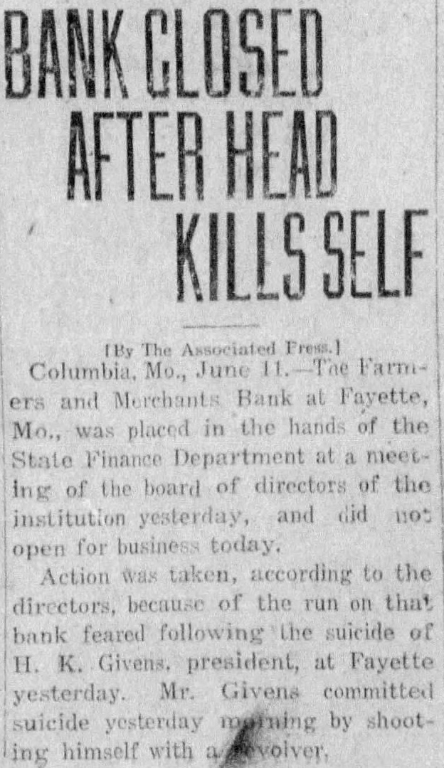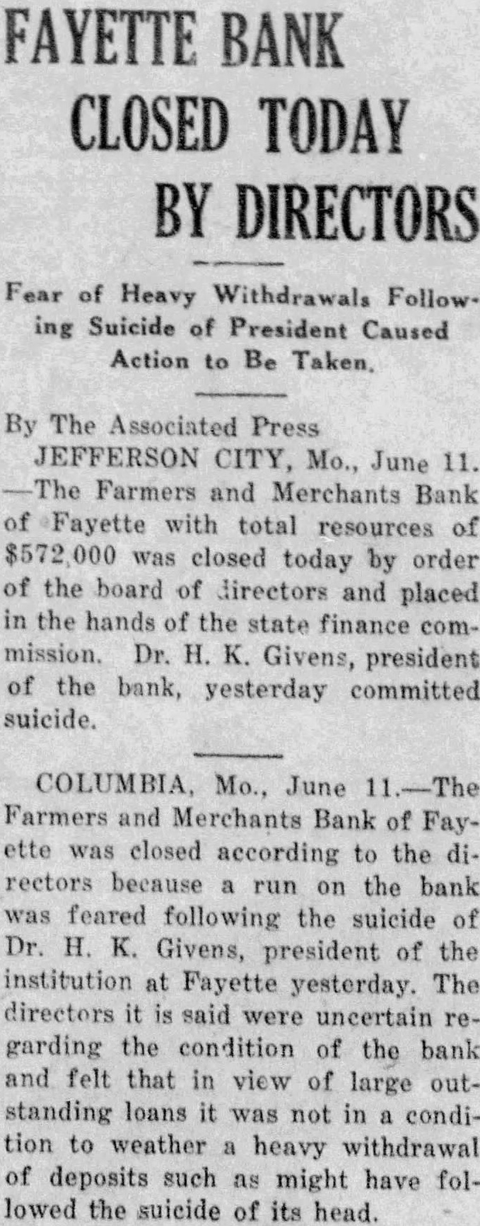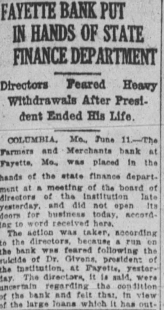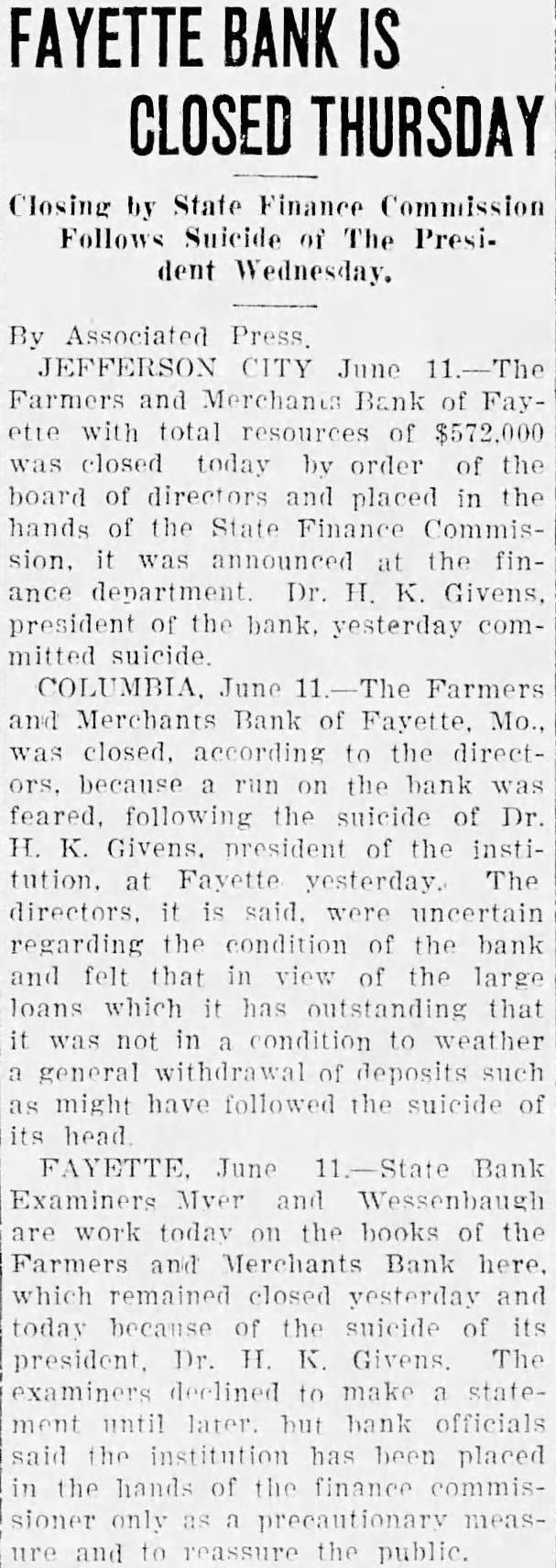 FAYETTE BANK PUT IN HANDS OF STATE FINANCE DEPARTMENT Directors Feared Heavy Withdrawals After President Ended His Life. COLUMBIA. Mo., June 11-The Farmers and Merchants bank at Fayette, Mo., was placed in the hands of the state finance depart. ment at a meeting of the board of directors of the institution Into yesterday. and did not open Its doors for business today, accordreceived here. The action taker, according to the because run the bank was feared following the suicide of Dr. Givens, prosident of the bank and felt that, in view the large loans which It has out.