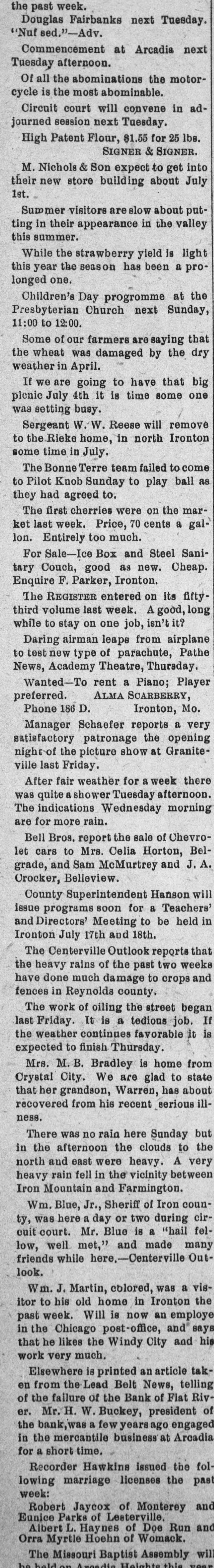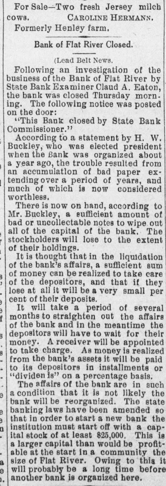 For Sale-Two fresh Jersey milch cows. CAROLINE HERMANN. Formerly Henley farm. Bank of Flat River Closed. (Lead Belt News. Following an investigation of the business of the Bank of Flat River by State Bank Examiner Claud A. Eaton, the bank was closed Thursday morning. The following notice was posted on the door: "This Bank closed by State Bank Commissioner." According to a statement by H. W. Buckley, who was elected president when the Bank was organized about a year ago, the trouble resulted from an accumulation of bad paper extending over a period of years, and much of which is now considered worthless. There is now on hand, according to Mr. Buckley, a sufficient amount of bad or uncollectable notes to wipe out all of the capital of the bank. The stockholders will lose to the extent of their holdings. It is thought that in the liquidation of the bank's affairs, a sufficient sum of money can be realized to take care of the depositors, and that if they lose at all it will be a very small per cent of their deposits. It will take a period of several months to straighten out the affairs of the bank and in the meantime the depositors will have to wait for their money. A receiver will be appointed to take charge. As money is realized from the bank's assets it will be paid to its depositors in installments or "dividen is" on a percentage basis. The affairs of the bank are in such a condition that it is not likely the bank will be reorganized. The state banking laws have been amended so that in order to start a new bank the institution must start off with a capital stock of at least $25,000. This is a larger capital than would be profitable at the start in a community the size of Flat River. Owing to this it e will probably be a long time before another bank is organized here.