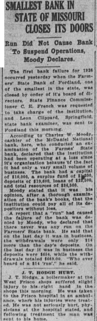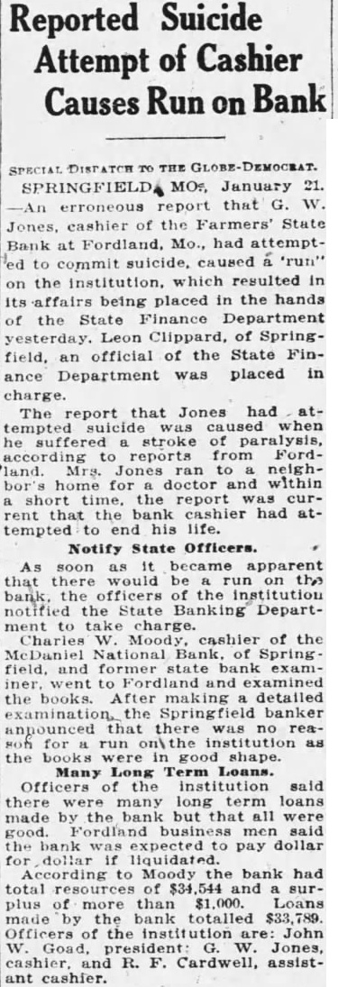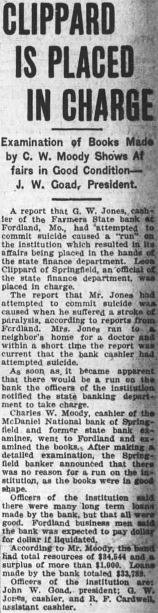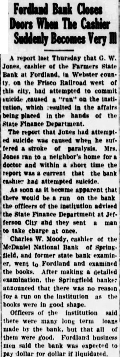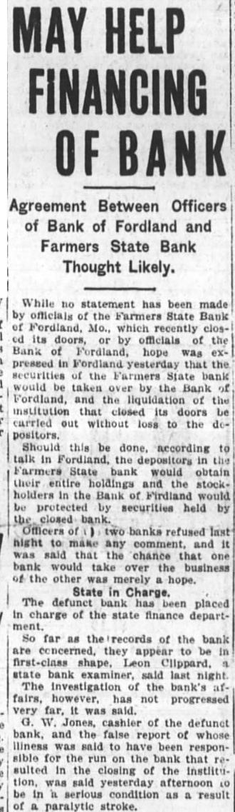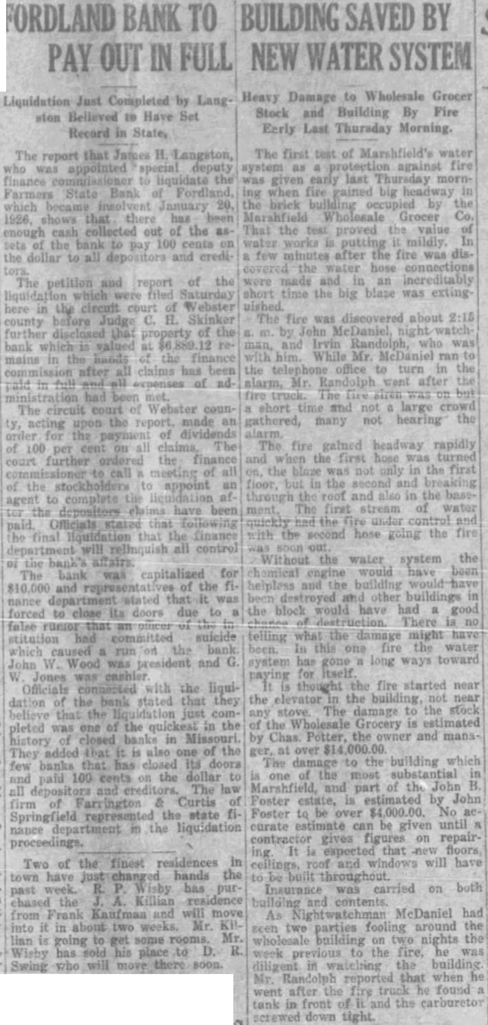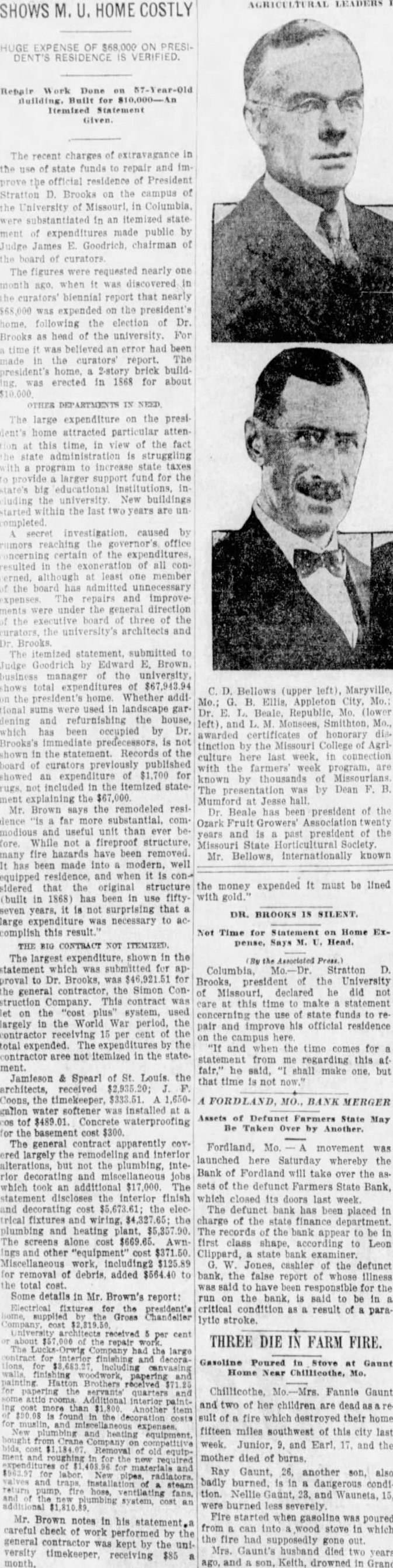 DEPARTMENTS NEED. large expenditure the presi home attracted particular atten this time, in of the fact struggling to increase support fund for the big in the university New buildings the last are un completed. investigation. caused rumors reaching certain the expenditures, resulted in the exoneration of all although least member board admitted unnecessary expenses repairs and improveunder the general direction board three of the university's architects and Brooks. The itemized statement, submitted Judge Goodrich by Edward E. Brown. of the university, expenditures $67,943.94 Bellows (upper the home. Whether additional sums in landscape gar. Dr. dening and refurnishing the house, and which has occupied by Dr. awarded honorary Brooks's immediate predecessors, not tinction the Missouri College shown in the statement. Records of the culture last board curators published with the week showed an expenditure for Missourians known included in itemized stateThe presentation was Dean explaining the $67,000. Jesse hall Mumford at Brown says the remodeled resi- president Dr. Beale has been dence far more substantial. comOzark Association modious and useful unit than ever beyears past president While not fireproof structure. Society Missouri State many fire hazards have been removed. Mr. known It has been made into modern. well equipped residence, when constructure the money expended It must be lined sidered original (built in 1868) has been fifty. with gold." seven years. not surprising that DR. BROOKS IS SILENT. expenditure was necessary to accomplish this result." Not Time for Statement on Home Expense, Says Head. BIG CONTRACT ITEMIZED. The largest expenditure, shown in the Associated Press.) statement which was submitted for Columbia, D. proval Dr. Brooks, was Brooks, president the University the general contractor, the Simon Con- declared he did struction Company. This contract was care this time make statement on the "cost plus" system, used concerning the use state funds relargely the World War period, the pair and his official residence contractor receiving 15 per cent of the on the campus expended. The expenditures the "If and when the time comes for contractor not itemized in the state. statement from me regarding this at he said, shall make one, but Jamieson & Spearl of St. Louis the that time architects, received Coons, the timekeeper, $333.51 FORDLAND, MO., MERGER gallon softener installed Assets of Defunct Farmers State May tof waterproofing Be Taken by Another. the basement cost The general contract cov. Fordland. Mo. movement was ered largely the and launched Saturday whereby the but not the plumbing, inteBank of Fordland will take over the as. rior which took additional $17,000. The sets the defunct Farmers State Bank, the finish which closed its doors last week. and cost the elec- The defunct bank has been placed in trical fixtures wiring, the charge of the and heating The the bank to The first class shape, to Leon other "equipment" cost Clippard, state work, Jones, cashier the defunct for removal of debris, added bank. the false report of whose illness total cost. for the Some details in Mr. Brown's report: run on the bank, is said to be in Electrical for president's critical as result of paraGross stroke. cent THREE DIE IN FARM FIRE. and Gasoline Poured Stove Gaunt Home Near Chillicothe, Mo. Chillicothe, Fannie Gaunt and two of her children are dead sult fire which destroyed their home and fifteen miles southwest of this city last week. Junior, and Earl. 17. and the mother died of Ray Gaunt, 26. another son, also and badly burned, dangerous condi ventilating tion. Nellie Gaunt, and Wauneta, 15, system, burned severely. Fire started when gasoline was poured Mr. Brown notes in his statement. from can into wood stove in which careful check work by the fire had supposedly gone out general contractor was kept the university Mrs. Gaunt's husband died two years timekeeper, receiving $85 month. ago, and drowned in Grand
