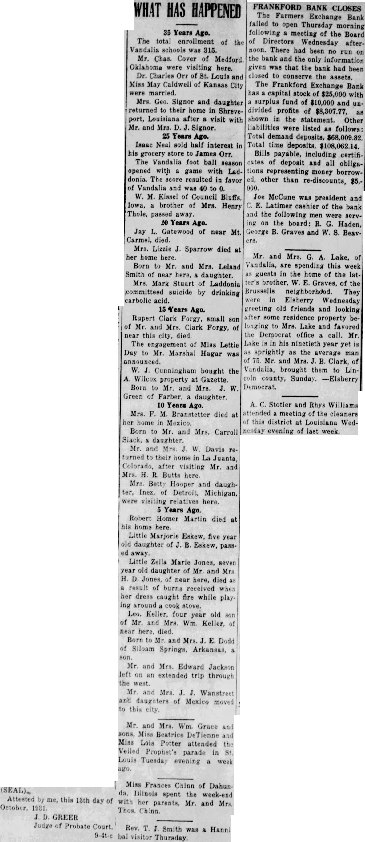 da, Illinois spent the week-end Attested by me, this 13th day of with her parents, Mr. and Mrs. October, 1931. Thos. Chinn. J. D. GREER Judge of Probate Court. Rev. T. J. Smith was a Hanni9-4t-c bal visitor Thursday. WHAT HAS HAPPENED 35 Years Ago. The total enrollment of the Vandalia schools was 315. Mr. Chas. Cover of Medford, Oklahoma were visiting here. Dr. Charles Orr of St. Louis and Miss May Caldwell of Kansas City were married. Mrs. Geo. Signor and daughter returned to their home in Shreveport, Louisiana after a visit with Mr. and Mrs. D. J. Signor. 25 Years Ago. Isaac Neal sold half interest in his grocery store to James Orr. The Vandalia foot ball season opened with a game with Laddonia. The score resulted in favor of Vandalia and was 40 to 0. W. M. Kissel of Council Bluffs, Iowa, a brother of Mrs. Henry Thole, passed away. 20 Years Ago. Jay L. Gatewood of near Mt. Carmel, died. Mrs. Lizzie J. Sparrow died at her home here. Born to Mr. and Mrs. Leland Smith of near here, a daughter. Mrs. Mark Stuart of Laddonia committeed suicide by drinking carbolic acid. 15 Years Ago. Rupert Clark Forgy, small son of Mr. and Mrs. Clark Forgy, of near this city, died. The engagement of Miss Lettie Day to Mr. Marshal Hagar was announced. W. J. Cunningham bought the A. Wilcox property at Gazette. Born to Mr. and Mrs. J. W. Green of Farber, a daughter. 10 Years Ago. Mrs. F. M. Branstetter died at her home in Mexico. Born to Mr. and Mrs. Carroll Slack, a daughter. Mr. and Mrs. J. W. Davis returned to their home in La Juanta, Colorado, after visiting Mr. and Mrs. H. R. Butts here. Mrs. Betty Hooper and daughter, Inez, of Detroit, Michigan, were visiting relatives here. 5 Years Ago. Robert Homer Martin died at his home here. Little Marjorie Eskew, five year old daughter of J. B. Eskew, passed away. Little Zella Marie Jones, seven year old daughter of Mr. and Mrs. H. D. Jones, of near here, died as a result of burns received when her dress caught fire while playing around a cook stove. Leo. Keller, four year old son of Mr. and Mrs. Wm. Keller, of near here, died. Born to Mr. and Mrs. J. E. Dodd of Siloam Springs, Arkansas, a son. Mr. and Mrs. Edward Jackson left on an extended trip through the west. Mr. and Mrs. J. J. Wanstreet and daughters of Mexico moved to this city. Mr. and Mrs. Wm. Grace and sons, Miss Beatrice DeTienne and Miss Lois Potter attended the Veiled Prophet's parade in St. Louis Tuesday evening a week Miss Frances Chinn of Dahun- FRANKFORD BANK CLOSES The Farmers Exchange Bank failed to open Thursday morning following a meeting of the Board of Directors Wednesday afternoon. There had been no run on the bank and the only information given was that the bank had been closed to conserve the assets. The Frankford Exchange Bank has a capital stock of $25,000 with a surplus fund of $10,000 and undivided profits of $8,307.77. as shown in the statement. Other liabilities were listed as follows: Total demand deposits, $68,009.82. Total time deposits, $108,062.14. Bills payable, including certificates of deposit and all obligations representing money borrowed, other than re-discounts, $5,000. Joe McCune was president and C. E. Latimer cashier of the bank and the following men were serving on the board: R. G. Haden, George B. Graves and W. S. Beavers. Mr. and Mrs. G. A. Lake, of Vandalia, are spending this week as guests in the home of the latter's brother, W. E. Graves, of the Brussells neighborhood. They were in Elsberry Wednesday greeting old friends and looking after some residence property belonging to Mrs. Lake and favored the Democrat office a call. Mr. Lake is in his ninetieth year yet is as sprightly as the average man of 75. Mr. and Mrs. J. B. Clark, of Vandalia, brought them to Lincoln county, Sunday. -Elsberry Democrat. A. C. Stotler and Rhys Williams attended a meeting of the cleaners of this district at Louisiana Wednesday evening of last week.