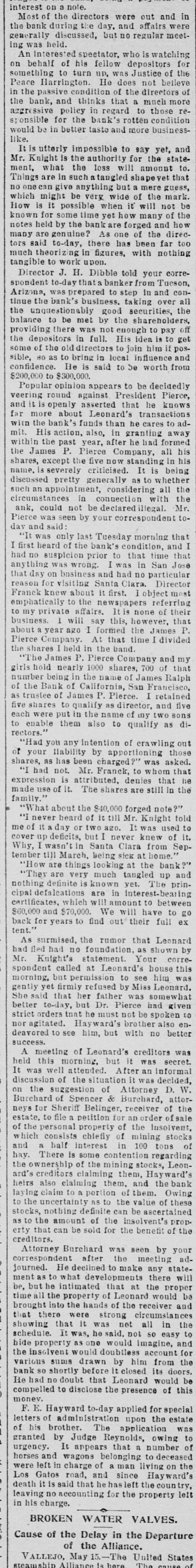 in and interest of on the a note directors were and affairs out were discussed, generally the bank Most during the day. but no regular meeton ing was hel held. spectator, who depositors is watching for An Interested behalf of his fellow up. was Justice of the believe something Harrington. to turn He does not directors Peace condition of the much more in the passive and thinks that a to those reaggressive the bank, policy in bank's regard rotten condition sronsible would be in for better the taste and more businessand like. utterly impossible to for say the yet, stateMr. It Knight is the authority loss will amount to. that ment, what in such the tangled shapevet mere guess, Things are give anything wide but a of the mark. is it How possible how which might be very when it will not of the be many known for some the time bank yet are forged the and direc- how notes held genuine? by As one of far too many are there has been nothing tors much said theorizing to-day, in figures. with to work upon. corretangible J. H. Dibble told from your Tueson, Director to-day that: banker in and conspondent prepared to step over all Arizona, the was bank's business. taking securities, the tinue the unquestionably met by good the shareholders. off His balance to there be was not enough idea to is pay to get of the local providing the depositors old in directors full. to join influence him if pos- and some sible, confidence. 80 as to He bring is said in to be worth from $200,000 to $300,000. to be decidedly round veering he that Popular opinion against appears President Pierce, knows and it is openly about asserted Leonard's transactions cares to adhad far with more the bank's funds also, than in granting he formed away mit. His action, the past year, after Company, he all his within P. Pierce standing in his the James except the five now It is being such an name. shares, is severely generally criticised. as to whether the discussed pretty considering with all the Mr. circumstances not in be declared illegal. toPierce was ank, could seen by your correspondent that "It was day and said: only last Tuesday condition, morning and had no suspicion I in was I first heard of the prior bank's to that time San Jose that reason anything was wrong business and had no particular Director first. that day for on visiting Santa Clara. I object most Franck knew to about the newspapers none referring of their emphatically my private affairs. this, It is however, that to will say James P. about business year 1 ago I At formed that time the divided Pierce shares Company. I held in the band. Company and my the *The James P. 1000 Pierce shares, 700 of Ralph that girls hold nearly in the name of James Francisco. number of the Bank being of California, P. Pierce. San I retained five as trustee of James qualify as director, two and sons to five shares to the name of my dieach enable were put them in also to qualify as of rectors." you any intention of crawling those out charged? "Had your liability by apportioning was asked. not. shares, as has been Mr. Franck, to whom that that ne expression made "I had use of is it. attributed. The shares denies are still in the about the $40,000 forged Knight note?' "What of it till Mr. to family.' "I never heard or two ago. It was used of told me of it a deficits, day but never knew from Sep- it. cover Why, up wasn't in Santa being Clara sick at home." tember till March. things looking at the bank up and nothing "How are are very much tangled The prinare "They definite is known in yet. Interest-bearing cipal defalcations which will amount to between to go for certificates, We will have ex back years $60,000 and $70,000. to find out their full tent.' As surmised, the foundation, rumor that as shown Leonard correhad fled had no statement. Your but Knight's Leonard's house this was morning, permission spondent Mr. called at to see him by Miss refused Leonard. gently yet that firmly her father was had somewhat given better She said to-day, but Dr. must Pierce not be spoken to strict orders tnat Hayward's he brother also better endeavored nor ragitated. him, but with no A was but success. meeting of Leonard's it creditors was secret. was well it was held this morning, attended. After an informal decided, discussion It of the situation of Attorney D. attor- W. on the suggestion Spencer & Burchard, of the Burchard Sheriff of Belinger, receiver order of sale neys for to file petition for an the Insolvent, consists 100 tons estate. of the personal property chiefly of of mining stocks of and which a half interest contention in regarding Leonhay. There is of some the mining stocks, Hayward's the ownership creditors claiming them, and the bank ard's also claiming them, of them. Owing heirs laying claim a portion to the value of these stocks, nothing the to the uncertainty definite as can be ascertained insolvent's erty as to that the amount can be sold of for the benefit of the your creditors. Burchard was seen meeting by adcorrespondent Attorney after the make any stateHe deelined to there will that journed. to what developments at the proper into be, mentas but he intimated of Leonard would and be brought strong time all the property the hands of the circumstances receiver the that there that were it was not not all so easy in the showing schedule. It was, one he said. would imagine, and for insolvent by drawn him hide property would doubtless account from the doors. various shortly 511 1118 before it closed its would be bank so doubt that Leonard of this compelled He had no to disclose the presence letters money. Hayward to-day applied for the special estate The F. E. of administration application upon was to of his brother. Judge Reynolds, number owing urgency. to belonging granted by It appears that a deceased of left since horses and in charge wagons of a man living Hayward's on the Los were Gatos road, and he haslett the country leit leaving death it is no said accounting that for the property in his