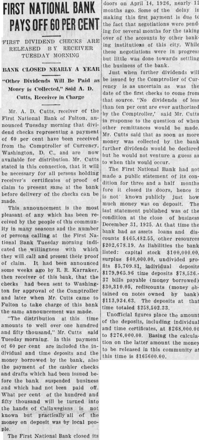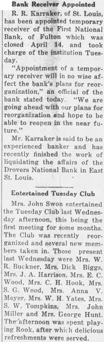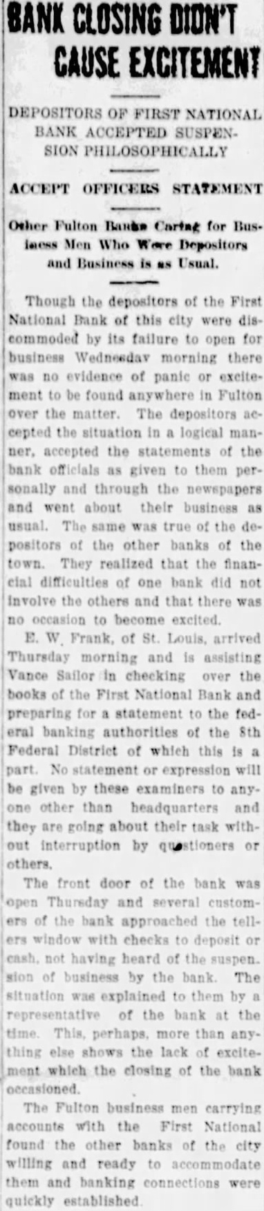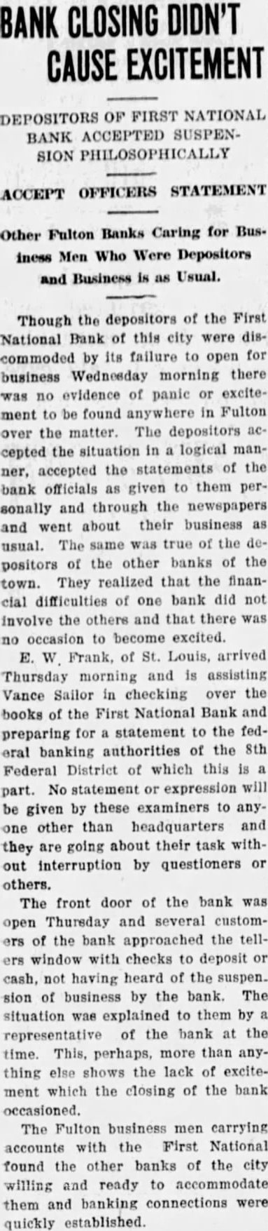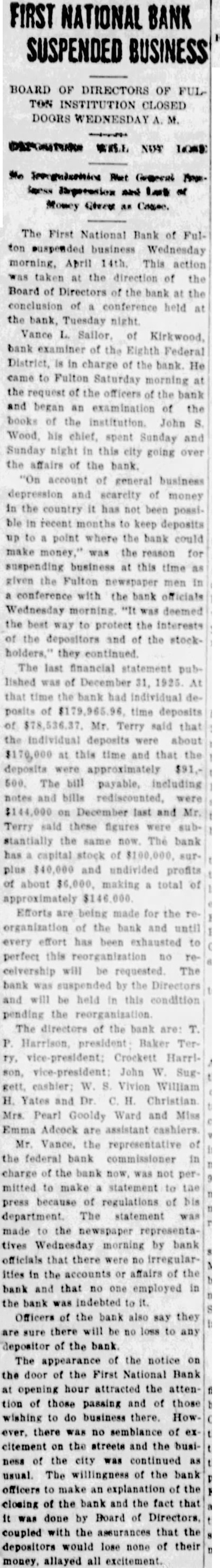 FIRST NATIONAL BANK SUSPENDED BUSINESS BOARD OF DIRECTORS OF FULTON INSTITUTION CLOSED DOORS WEDNESDAY A. M. DEPOSITORS WILL NOT LOSE No Irregularities But General Business Depression and Lack of Money Given as Cause. The First National Bank of Fulton suspended business Wednesday morning, April 14th. This action was taken at the direction of the Board of Directors of the bank at the conclusion of a conference held at the bank, Tuesday night. Vance L. Sailor, of Kirkwood, bank examiner of the Eighth Federal District, is in charge of the bank. He came to Fulton Saturday morning at the request of the officers of the bank and began an examination of the books of the institution. John S. Wood, his chief, spent Sunday and Sunday night in this city going over the affairs of the bank. "On account of general business depression and scarcity of money in the country it has not been possible in recent months to keep deposits up to a point where the bank could make money," was the reason for suspending business at this time as given the Fulton newspaper men in a conference with the bank officials Wednesday morning. "It was deemed the best way to protect the interests of the depositors and of the stockholders," they continued. The last financial statement published was of December 31, 1925. At that time the bank had individual deposits of $179,965.96. time deposits of $78,536.37. Mr. Terry said that the individual deposits were about $170,000 at this time and that the deposits were approximately $91,500. The bill payable, including notes and bills rediscounted, were $144,000 on December last and Mr. Terry said these figures were substantially the same now. The bank has a capital stock of $100,000, surplus $40,000 and undivided profits of about $6,000, making a total of approximately $146.000. Efforts are being made for the reorganization of the bank and until every effort has been exhausted to perfect this reorganization no receivership will be requested. The bank was suspended by the Directors and will be held in this condition pending the reorganization. The directors of the bank are: T. P. Harrison, president: Baker Terry, vice-president; Crockett Harrison, vice-president: John W. Suggett, cashier: W. S. Vivion William H. Yates and Dr. C. H. Christian Mrs. Pearl Gooldy Ward and Miss Emma Adcock are assistant cashiers Mr. Vance, the representative of the federal bank commissioner charge of the bank now, was not permitted to make a statement to the press because of regulations of his department. The statement was made to the newspaper representatives Wednesday morning by bank officials that there were no irregularities in the accounts or affairs of the bank and that no one employed in the bank was indebted to it. Officers of the bank also say they are sure there will be no loss to any depositor of the bank. The appearance of the notice on the door of the First National Bank at opening hour attracted the attention of those passing and of those wishing to do business there. However, there was no semblance of excitement on the streets and the busi ness of the city was continued as usual. The willingness of the bank officers to make an explanation of the closing of the bank and the fact that it was done by Board of Directors, coupled with the assurances that the depositors would lose none of their money, allayed all excitement. If you substitute lard or drippings for butter in a cake recipe add a little lemon juice. You will not notice the change in flavor nearly as much.
