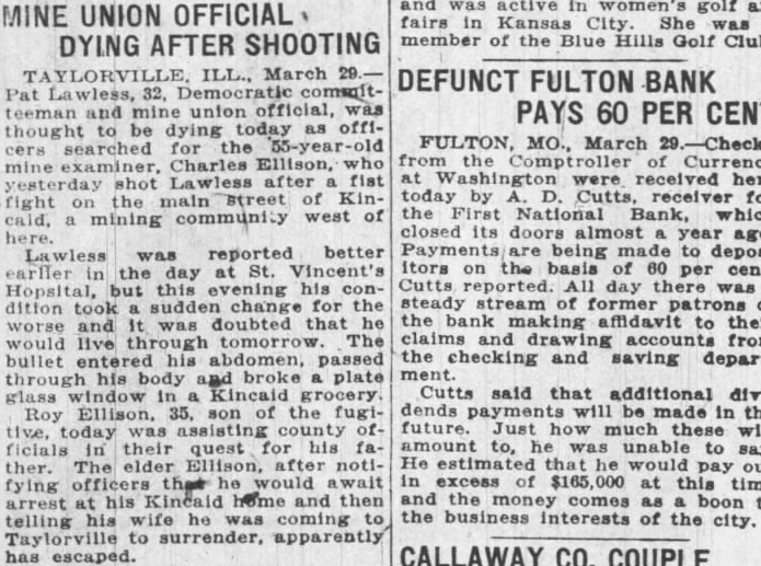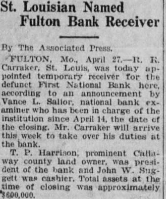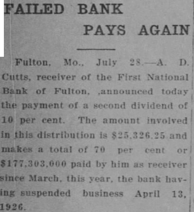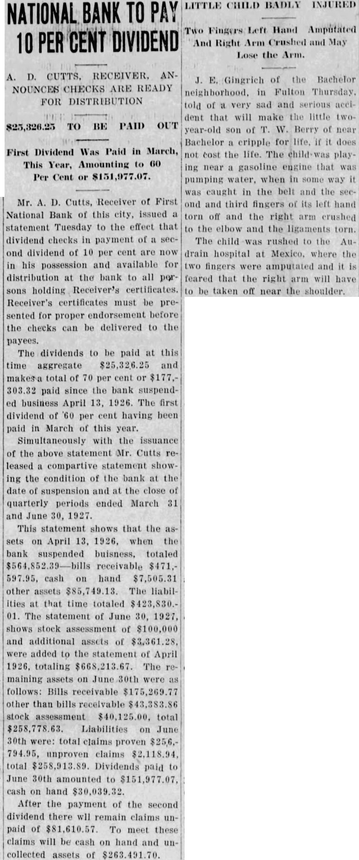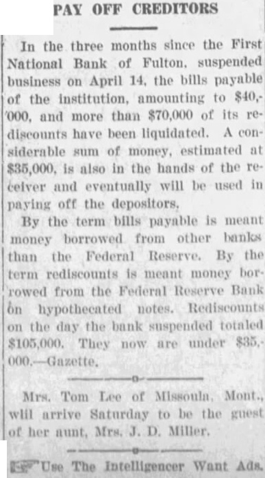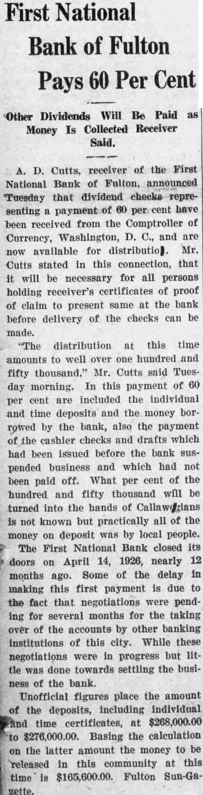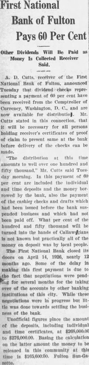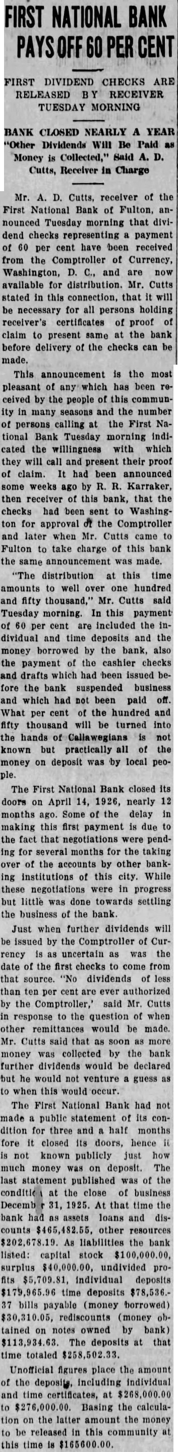 FIRST NATIONAL BANK SUSPENDED BUSINESS BOARD OF DIRECTORS OF FULTON INSTITUTION CLOSED DOORS WEDNESDAY A. M. DEPOSITORS WILL NOT LOSE No Irregularities But General Business Depression and Lack of Money Given as Cause. The First National Bank of Fulton suspended business Wednesday morning, April 14th. This action was taken at the direction of the Board of Directors of the bank at the conclusion of a conference held at the bank, Tuesday night. Vance L. Sailor, of Kirkwood, bank examiner of the Eighth Federal District, is in charge of the bank. He came to Fulton Saturday morning at the request of the officers of the bank and began an examination of the books of the institution. John S. Wood, his chief, spent Sunday and Sunday night in this city going over the affairs of the bank. "On account of general business depression and scarcity of money in the country it has not been possible in recent months to keep deposits up to a point where the bank could make money," was the reason for suspending business at this time as given the Fulton newspaper men in a conference with the bank officials Wednesday morning. "It was deemed the best way to protect the interests of the depositors and of the stockholders," they continued. The last financial statement published was of December 31, 1925. At that time the bank had individual deposits of $179,965.96. time deposits of $78,536.37. Mr. Terry said that the individual deposits were about $170,000 at this time and that the deposits were approximately $91,500. The bill payable, including notes and bills rediscounted, were $144,000 on December last and Mr. Terry said these figures were substantially the same now. The bank has a capital stock of $100,000, surplus $40,000 and undivided profits of about $6,000, making a total of approximately $146.000. Efforts are being made for the reorganization of the bank and until every effort has been exhausted to perfect this reorganization no receivership will be requested. The bank was suspended by the Directors and will be held in this condition pending the reorganization. The directors of the bank are: T. P. Harrison, president: Baker Terry, vice-president; Crockett Harrison, vice-president: John W. Suggett, cashier: W. S. Vivion William H. Yates and Dr. C. H. Christian Mrs. Pearl Gooldy Ward and Miss Emma Adcock are assistant cashiers Mr. Vance, the representative of the federal bank commissioner charge of the bank now, was not permitted to make a statement to the press because of regulations of his department. The statement was made to the newspaper representatives Wednesday morning by bank officials that there were no irregularities in the accounts or affairs of the bank and that no one employed in the bank was indebted to it. Officers of the bank also say they are sure there will be no loss to any depositor of the bank. The appearance of the notice on the door of the First National Bank at opening hour attracted the attention of those passing and of those wishing to do business there. However, there was no semblance of excitement on the streets and the busi ness of the city was continued as usual. The willingness of the bank officers to make an explanation of the closing of the bank and the fact that it was done by Board of Directors, coupled with the assurances that the depositors would lose none of their money, allayed all excitement. If you substitute lard or drippings for butter in a cake recipe add a little lemon juice. You will not notice the change in flavor nearly as much.