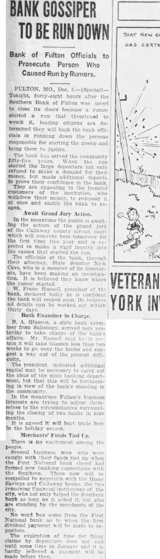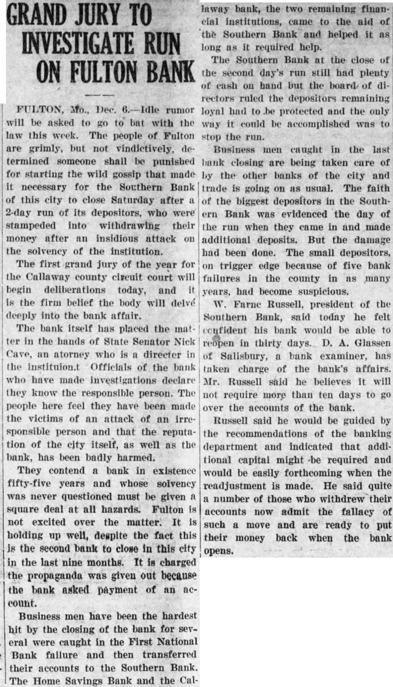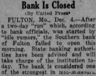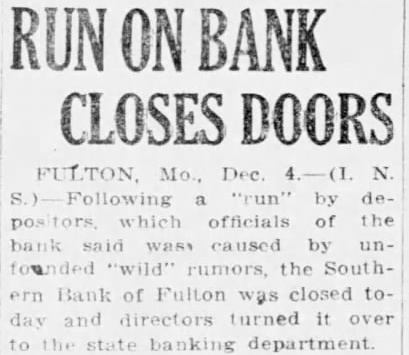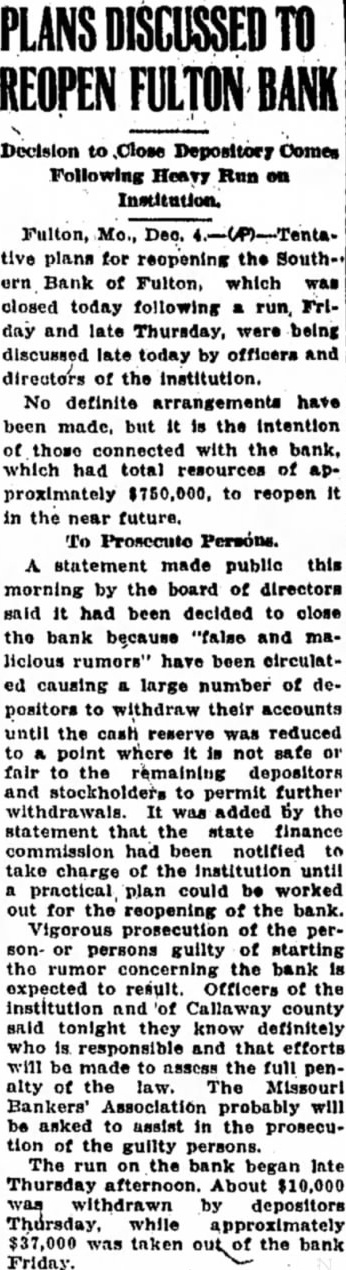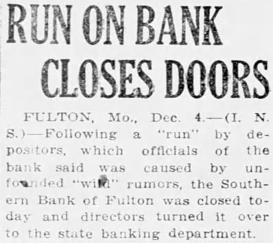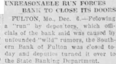 A run on the Southern Bank of Fulton last Thursday and Friday, during which time $47,000 was withdrawn, forced the institution to be closed by its directors Saturday. The wife of a laborer started the run when she withdrew $5.40 which she had on deposit. Officers say they believe they have discovered the source of rumor which started the run, and that they intend to prosecute the person responsible for it. The bank has served the community fifty years and was a strong institution until the false rumor caused the withdrawal of so much eash that the bank had to be closed. Two other Fulton banks and a St. Louis bank and all depositors were paid as they demanded their money, without question. Bank officials anmounce that they have plans under way for reopening.