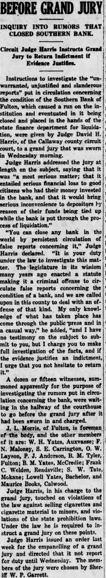 Instructions to investigate the warranted, unjustified and slanderous reports" put in circulation concerning the condition of the Southern Bank Fulton, which caused on the stitution and eventuated in being closed and placed in the hands of the state finance department for liquidation, were given by Judge David Harris, of the Callaway county circuit grand jury that Wednesday morning. Judge Harris addressed the jury length the subject, saying that most serious matter; that entailed serious financial loss good citizens who had their money invested the bank, and that would bring serious to depositors reason of their funds being tied the bank through the of liquidation." close bank in any world by persistent circulation of false reports concerning Judge Harris declared. is your duty under the law to investigate this matter. The legislature in its wisdom enacted statute many years ago making criminal offense to culate false reports concerning condition of bank, and are called in county to deal with upon fense of that kind. My only knowlof what has taken place has edge through the and casual he added, have on the subject to subtestimony to but charge you to make you, investigation of the facts, and the evidence indictment, that hesitate to return you dozen or fifteen witnesses, summoned apparently for the purpose the rumors in circuinvestigating lation concerning the bank, waitin the hallway of the courthouse before the grand jury after sworn in and charged. Morris, Fulton, is foreman body, and the other members Yates, Maloney, Carrington, Layson, Anderson, Tyler, Fulton; Yates, McCredie; Frank Welden, Readsville; Tate, Mokane; Lowell Yates, Bachelor, and Maurice Books, Calwood. Harris, in his charge to the Judge touched violations of grand jury, on the law selling cigarettes and against cigarette material to minors, and lations of the state prohibition laws. Under the law he required struct grand jury on these points. Judge Harris issued an order last week for the empanelling of grand and directed that it not report jury for until Wednesday. The memduty bers of the were chosen SherGarrett.