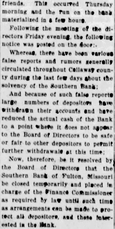 friends. This occurred Thursday morning and the Pun on the bank materialized in few hours Following the meeting of the rectors Friday evening the following notice posted on the Goor:Whereas there have been various false reports and rumors generally circulated throughout Callaway counduring the last few days about the solvency of the Southern Bank: And because of such false reporte large numbers of depositors have withdrawn their accounts and have reduced the actual cash of the Bank to point where does not appear to the Board of Directors to be or fair to other depositors to permit further withdrawale at this time: Now. therefore. be It resolved the Board of Directors that the Southern Bank of Fulton, Missouri be closed temporarily and placed charge of the Finance Commissioner required By law until such time arrangements can be made to protect all depositors, and these faterested in the