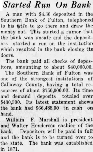 Run On Bank with deposited in the Southern Bank of Fulton, telephoned to his wife to there and draw the money out. This started rumor that the bank was unsafe and the depositors started run the institution which resulted in the bank closing its doors. The bank paid all checks of depositors, amounting about $40,000.00. The Southern Bank of Fulton was the strongest institutions of Callaway County, having total of about Its time and demand deposits totaled over $430,300. latest statement shows the bank had in cash on hand. William Marshall president and Walter Henderson cashier of the bank. Depositors be paid in full and the bank to be turned over the state. The bank was established in 1871.