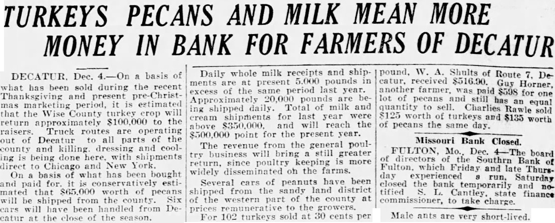 TURKEYS PECANS AND MILK MEAN MORE MONEY IN BANK FOR FARMERS OF DECATUR