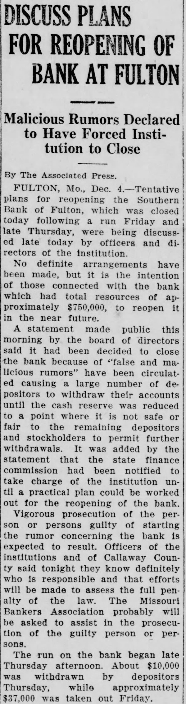 By The Associated Press. FULTON, Dec. plans for reopening the Southern Bank Fulton, which closed was today following Friday and Thursday, were being discusslate today officers and rectors of the institution definite arrangements have made, but the intention those with the bank which had total proximately $750,000, reopen near future. statement made public this morning the board of directors said been decided to close bank because of and malicious rumors" have been circulatcausing large number of positors withdraw their accounts until the cash reduced point safe fair remaining depositors stockholders to permit further withdrawals. added by the statement that the state finance commission had been notified charge of the institution unpractical plan could be worked for the reopening of the bank. prosecution of the perpersons guilty of starting rumor concerning the bank expected result. Officers of the institutions and Callaway Counsaid tonight they know definitely responsible and that efforts be made to assess the full penThe Missouri Bankers Association probably will asked to assist the tion of the guilty person The run on the bank began late Thursday afternoon. About $10,000 withdrawn by depositors Thursday, while approximately taken out Friday.
