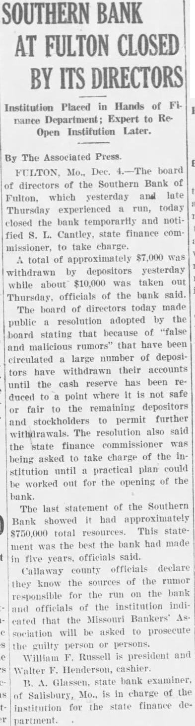 By The Associated Press FULTON, Mo., Dec. board of directors of the Southern Bank of Fulton, which yesterday and late Thursday experienced run, today closed the bank temporarily and notified S. L. Cantley, state finance commissioner, to take charge. A total of approximately $7,000 was withdrawn by depositors yesterday while about $10,000 was taken out Thursday. officials of the bank said. The board of directors today made public resolution adopted by the board stating that because of "false and malicious rumors" that have been circulated large number of depositors have withdrawn their accounts until the cash reserve has been reduced to point where it is not safe or fair to the remaining depositors and stockholders to permit further withdrawals. The resolution also said the state finance commissioner was being asked to take charge of the institution until practical plan could be worked out for the opening of the bank. The last statement of the Southern Bank showed had approximately $750,000 total resources. This statement was the best the bank had made in five years, officials said. Callaway county officials declare they know the sources of the rumor responsible for the run on the bank and officials of the institution indicated that the Missouri Bankers' Association will be asked to prosecute the guilty person or persons. William F. Russell is president and Walter F. Henderson, cashier. B. A. Glassen, state bank examiner, of Salisbury, Mo., is in charge of the institution for the state finance department.