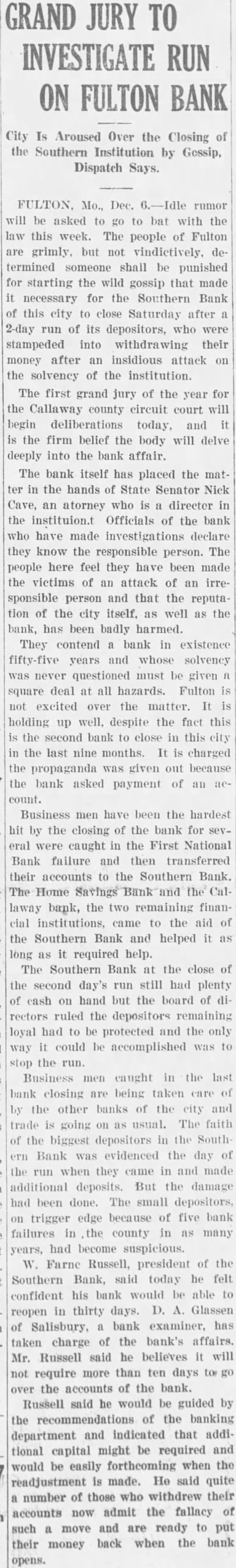 FULTON, Mo., Dec. 6.-Idle rumor will be asked to go to bat with the law this week. The people of Fulton are grimly, but not vindictively, determined someone shall be punished for starting the wild gossip that made it necessary for the Southern Bank of this city to close Saturday after a 2-day run of its depositors, who were stampeded into withdrawing their money after an insidious attack on the solvency of the institution. The first grand jury of the year for the Callaway county circuit court will begin deliberations today, and it is the firm belief the body will delvé deeply into the bank affair. The bank itself has placed the mat ter in the hands of State Senator Nick Cave, an atorney who is a directer in the instituion.t Officials of the bank who have made investigations declare they know the responsible person. The people here feel they have been made the victims of an attack of an irresponsible person and that the reputation of the city itself, as well as the bank, has been badly harmed. They contend a bank in existence fifty-five years and whose solvency was never questioned must be given a square deal at all hazards. Fulton is not excited over the matter. It is holding up well, despite the fact this is the second bank to close in this city in the last nine months. It is charged the propaganda was given out because the bank asked payment of an account. Business men have been the hardest hit by the closing of the bank for several were caught in the First National Bank failure and then transferred their accounts to the Southern Bank. The Home Savings Bank and the Cal- laway bank, the two remaining financial institutions, came to the aid of the Southern Bank and helped it as long as it required help. The Southern Bank at the close of the second day's run still had plenty of cash on hand but the board of directors ruled the depositors remaining loyal had to be protected and the only way it could be accomplished was to stop the run. Business men caught in the last bank closing are being taken care of by the other banks of the city and trade is going on as usual. The faith of the biggest depositors in the Southern Bank was evidenced the day of the run when they came in and made additional deposits. But the damage had been done. The small depositors, on trigger edge because of five bank failures in the county in as many years, had become suspicious. W. Farne Russell, president of the Southern Bank, said today he felt confident his bank would be able to reopen in thirty days. D. A. Glassen of Salisbury, a bank examiner, has taken charge of the bank's affairs. Mr. Russell said he believes it will not require more than ten days to go over the accounts of the bank. Russell said he would be guided by the recommendations of the banking department and indicated that additional capital might be required and would be easily forthcoming when the readjustment is made. He said quite a number of those who withdrew their accounts now admit the fallacy of such a move and are ready to put their money back when the bank opens.