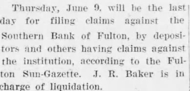 Thursday, June 9. will be the last day for filing claims against the Southern Bank of Fulton, by depositors and others having claims against the institution, according to the Fulton Sun-Gazette. J. R. Baker is in charge of liquidation.