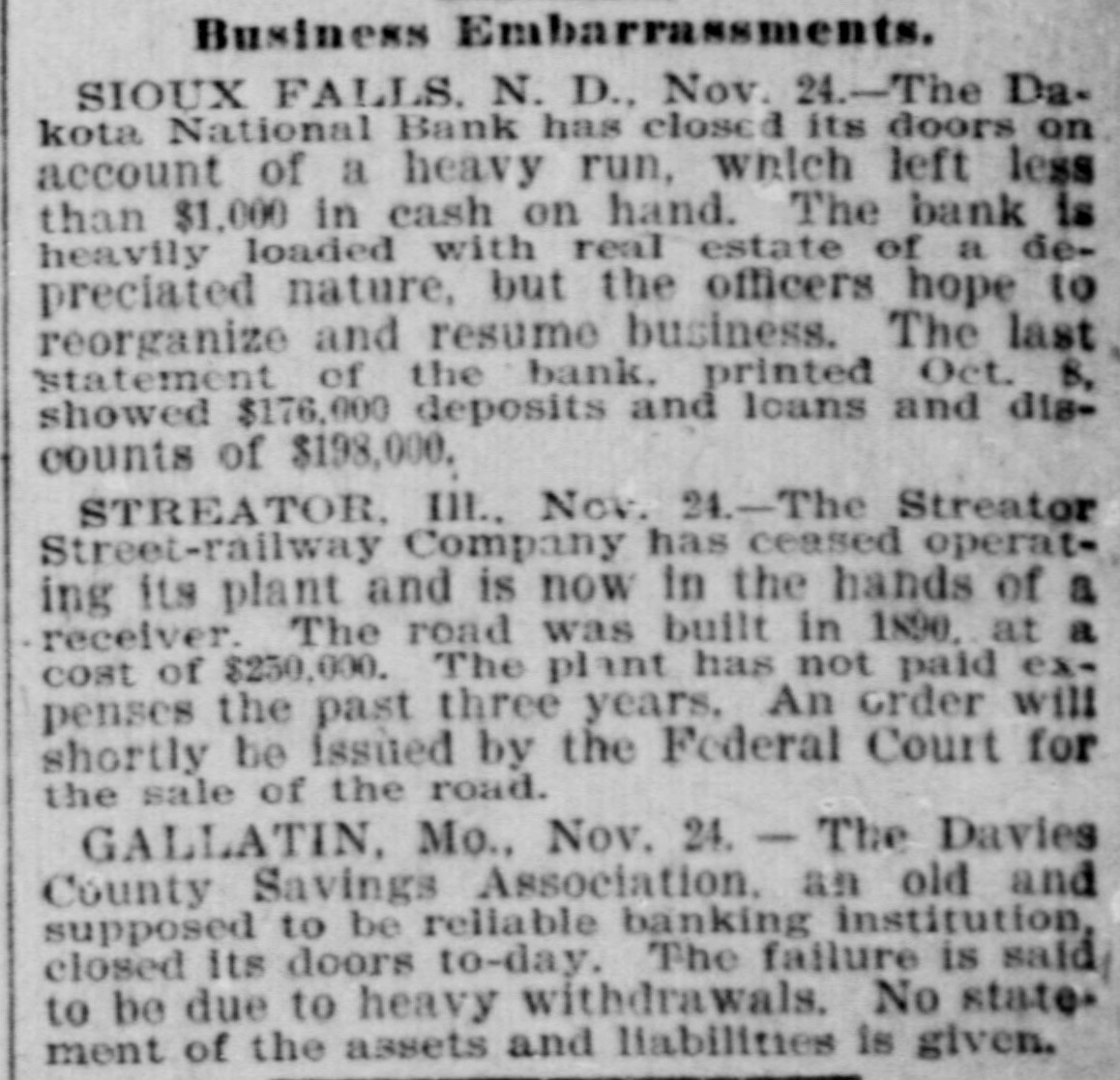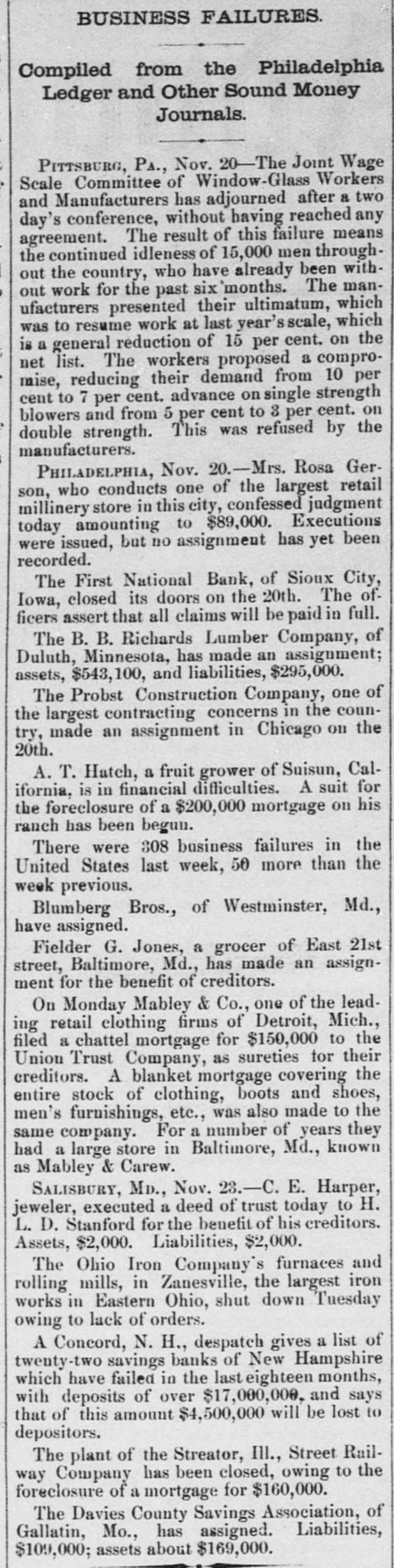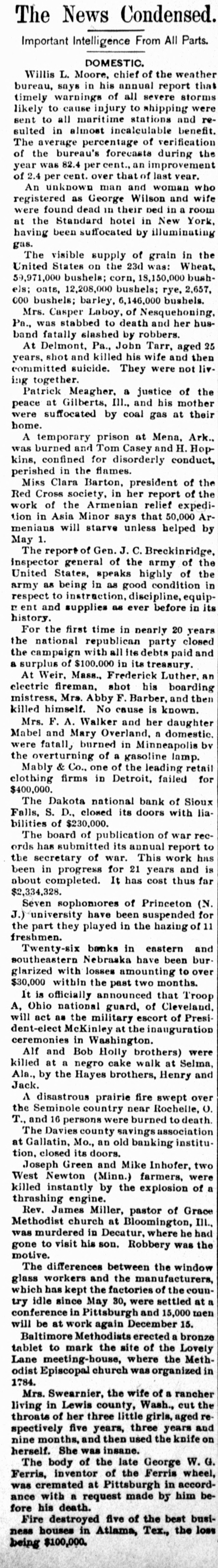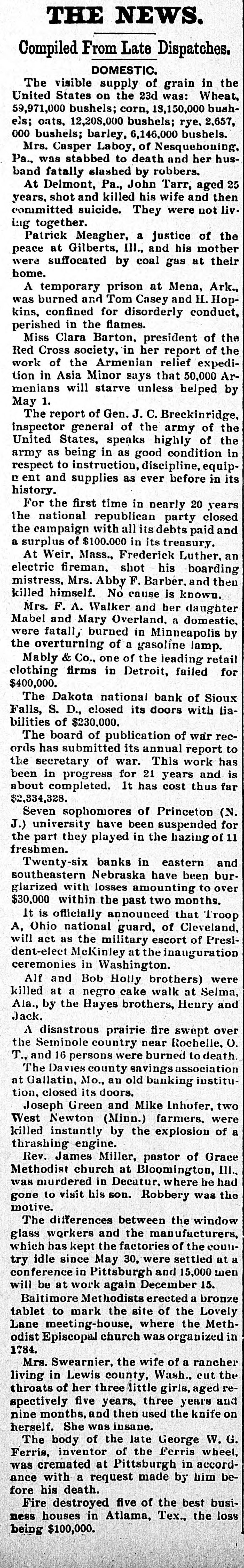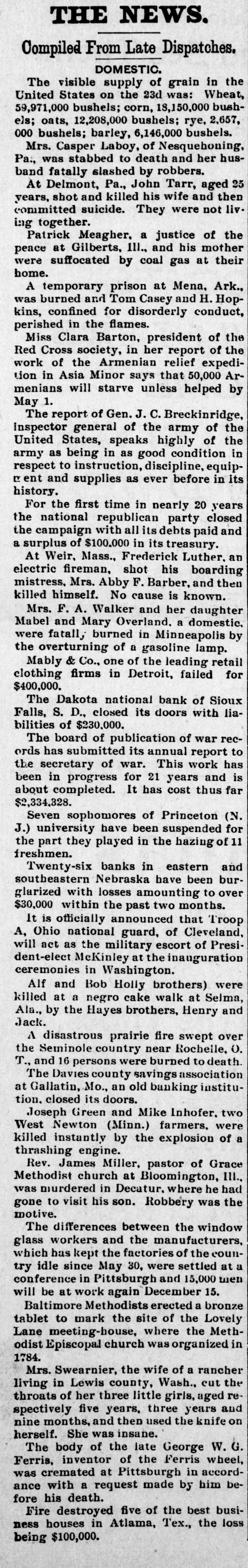 THE NEWS. Compiled From Late Dispatches. DOMESTIC. The visible supply of grain in the United States on the 23d was: Wheat, 59,971,000 bushels; corn, 18,150,000 bushels; oats, 12,208,000 bushels; rye, 2,657, 000 bushels; barley, 6,146,000 bushels. Mrs. Casper Laboy, of Nesquehoning, Pa., was stabbed to death and her husband fatally slashed by robbers. At Delmont, Pa., John Tarr, aged 25 years, shot and killed his wife and then committed suicide. They were not liv. ing together. Patrick Meagher, a justice of the peace at Gilberts, III., and his mother were suffocated by coal gas at their home. A temporary prison at Mena, Ark., was burned and Tom Casey and H. Hopkins, confined for disorderly conduct, perished in the flames. Miss Clara Barton, president of the Red Cross society, in her report of the work of the Armenian relief expedition in Asia Minor says that 50,000 Armenians will starve unless helped by May 1. The report of Gen. J. C. Breckinridge, inspector general of the army of the United States, speaks highly of the army as being in as good condition in respect to instruction, discipline, equipr ent and supplies as ever before in its history. For the first time in nearly 20 years the national republican party closed the campaign with all its debts paid and a surplus of $100,000 in its treasury. At Weir, Mass., Frederick Luther. an electric fireman, shot his boarding mistress, Mrs. Abby F. Barber, and then killed himself. No cause is known. Mrs. F. A. Walker and her daughter Mabel and Mary Overland. a domestic, were fatall, burned in Minneapolis by the overturning of a gasoline lamp. Mably & Co., one of the leading retail clothing firms in Detroit, failed for $400,000. The Dakota national bank of Sioux Falls, S. D., closed its doors with liabilities of $230,000. The board of publication of war records has submitted its annual report to the secretary of war. This work has been in progress for 21 years and is about completed. It has cost thus far $2,334,328. Seven sophomores of Princeton (N. J.) university have been suspended for the part they played in the hazing of 11 freshmen. Twenty-six banks in eastern and southeastern Nebraska have been burglarized with losses amounting to over $30,000 within the past two months. It is officially announced that Troop A, Ohio national guard, of Cleveland, will act as the military escort of President-elect McKinley at the inauguration ceremonies in Washington. Alf and Bob Holly brothers) were killed at a negro cake walk at Selma, Ala., by the Hayes brothers, Henry and Jack. A disastrous prairie fire swept over the Seminole country near Rochelle, O. T., and 16 persons were burned to death. The Davies county savings association at Gallatin, Mo., an old banking institution. closed its doors. Joseph Green and Mike Inhofer, two West Newton (Minn.) farmers, were killed instantly by the explosion of a thrashing engine. Rev. James Miller, pastor of Grace Methodist church at Bloomington, III., was murdered in Decatur, where he had gone to visit his son. Robbery was the motive. The differences between the window glass workers and the manufacturers, which has kept the factories of the country idle since May 30, were settled at a conference in Pittsburgh and 15,000 men will be at work again December 15. Baltimore Methodists erected a bronze tablet to mark the site of the Lovely Lane meeting-house, where the Methodist Episcopal church was organized in 1784. Mrs. Swearnier, the wife of a rancher living in Lewis county, Wash., cut the throats of her three little girls, aged respectively five years, three years and nine months, and then used the knife on herself. She was insane. The body of the late George W. G. Ferris, inventor of the Ferris wheel, was cremated at Pittsburgh in accordance with a request made by him before his death. Fire destroyed five of the best business houses in Atlama, Tex., the loss being $100,000.