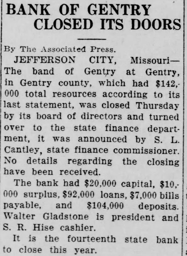 BANK OF GENTRY CLOSED ITS DOORS Press. JEFFERSON CITY band of Gentry Gentry, Gentry county, which had $142, total resources to statement, was closed Thursday board of directors and turned state finance department, announced by Cantley, finance details regarding the closing have been bank had $20,000 capital, surplus, payable, and $104,000 deposits. Gladstone is president and Hise cashier. fourteenth state bank close this year.